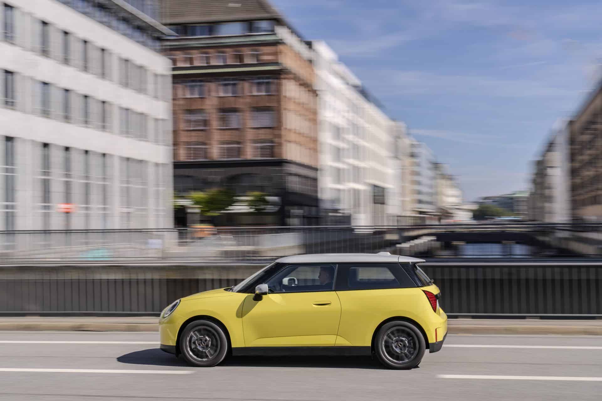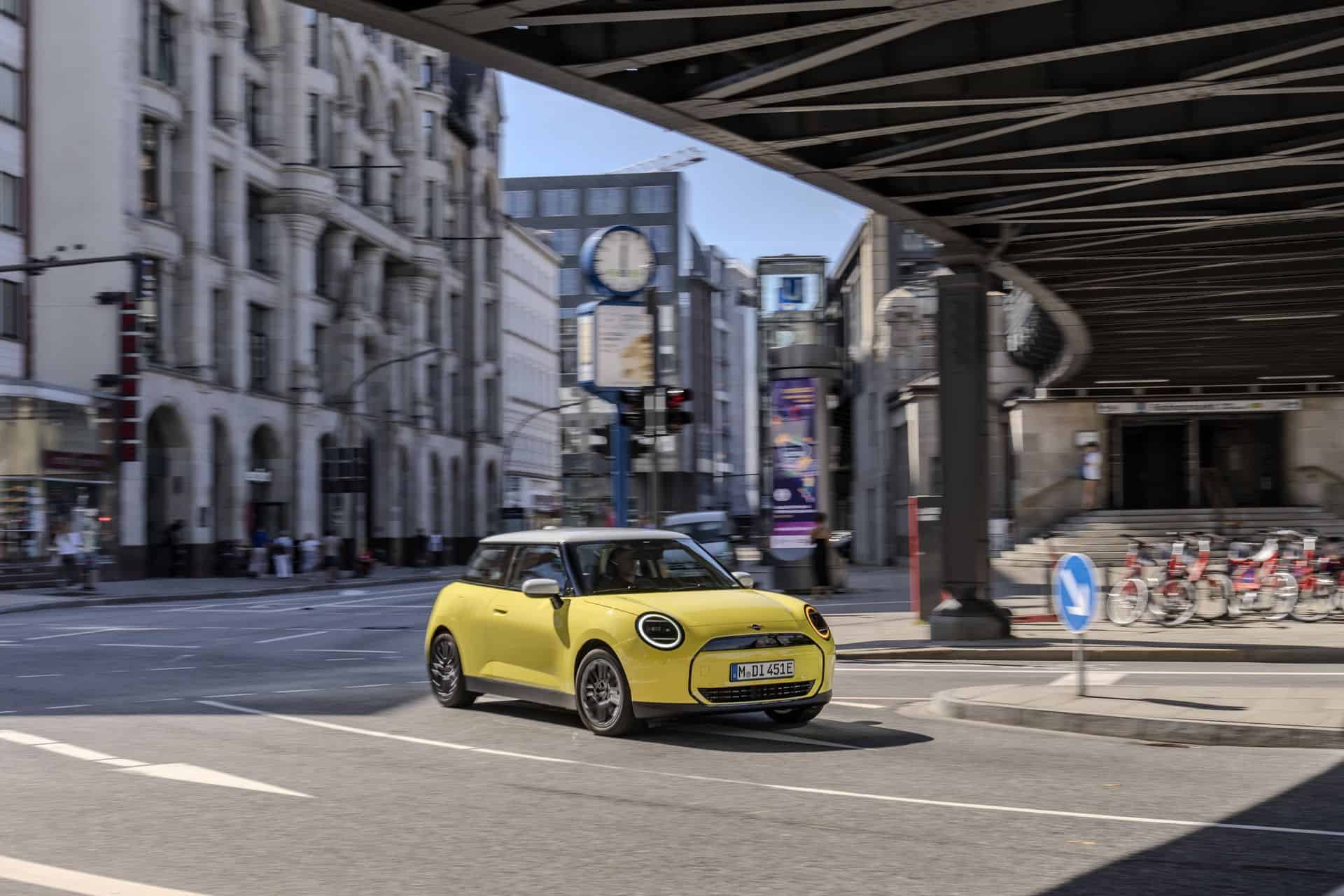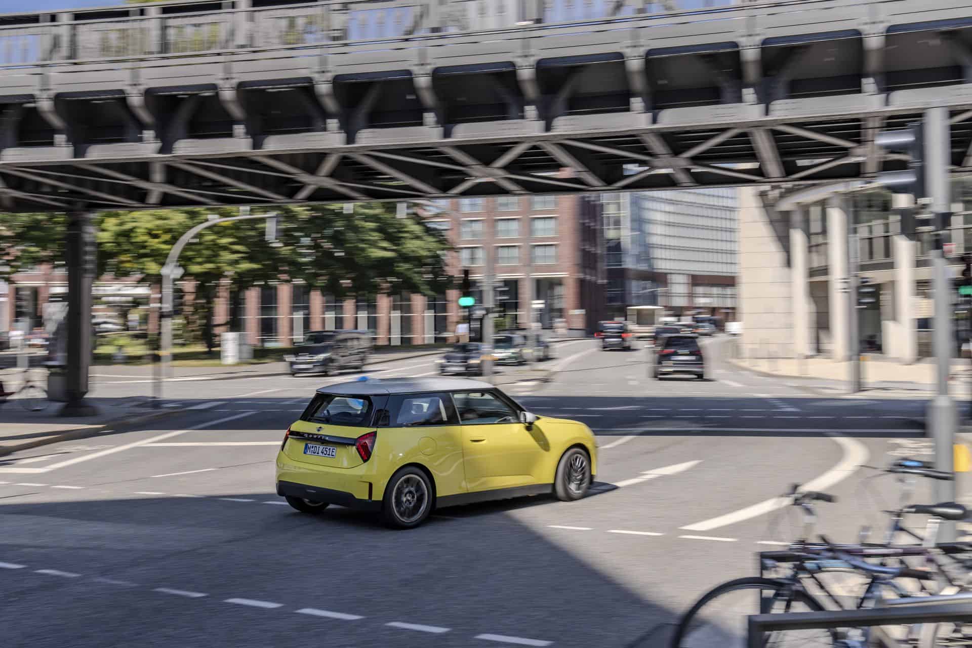 The entry-level MINI Cooper E electric (J01) is introduced with four redesigned vehicle trims, each tailored to cater to diverse tastes and preferences. Among these, the Classic Trim stands out with its vibrant body colors and striking contrasting roof finishes, embodying the spirit of MINI with a contemporary twist. The puristic design of the iconic three-door model shines brightly in Sunny Side Yellow, complemented by a contrasting roof and mirror caps in pristine white.