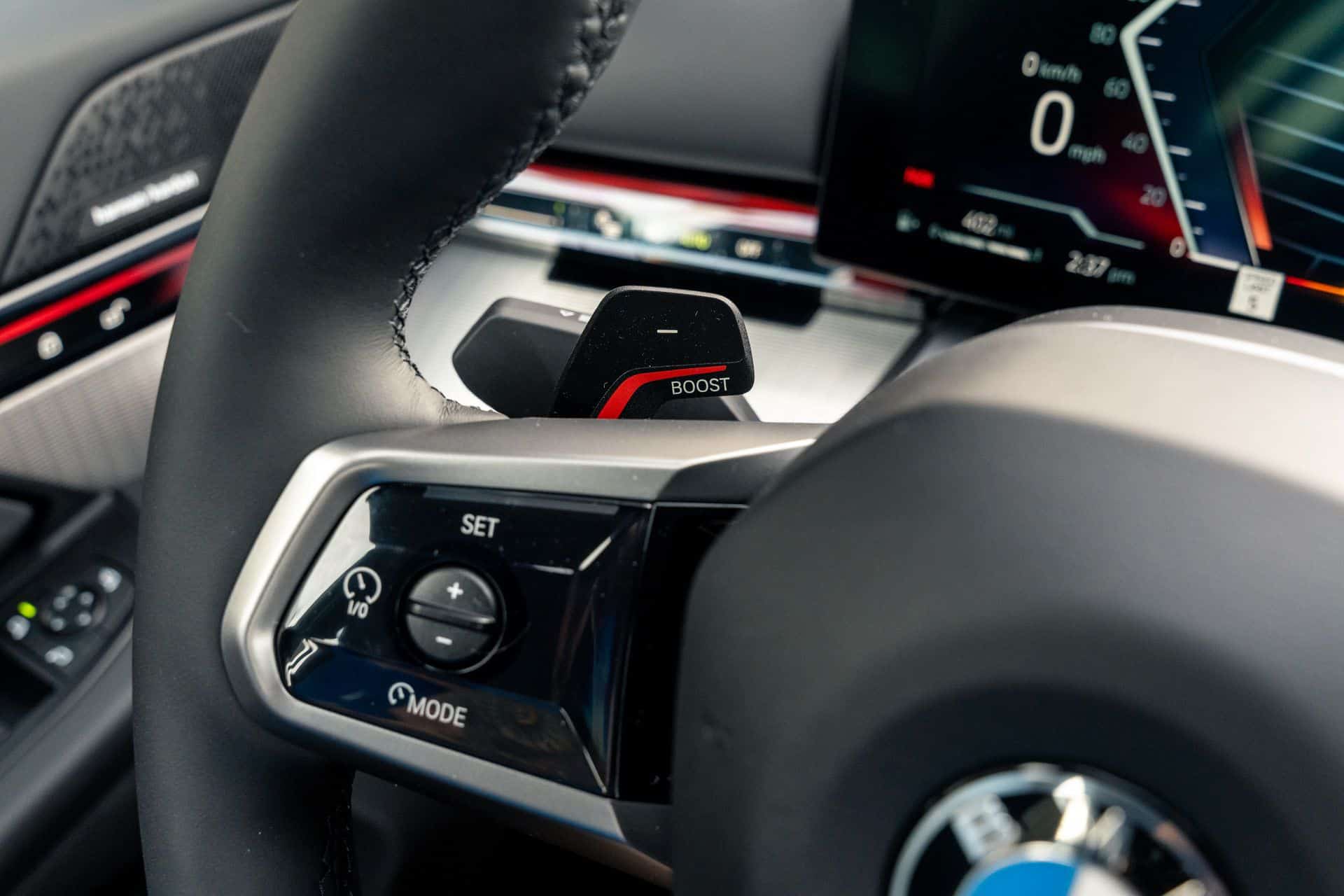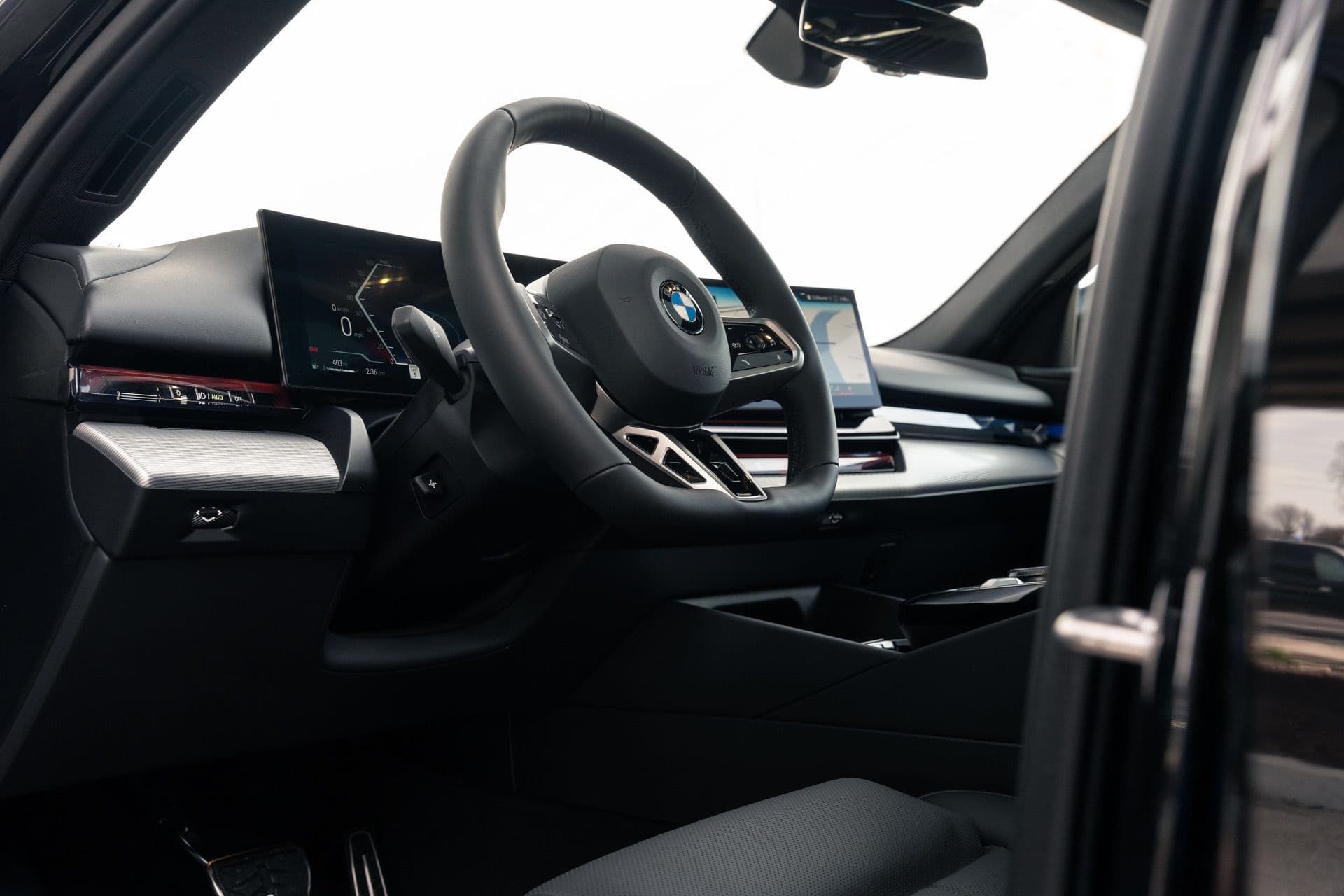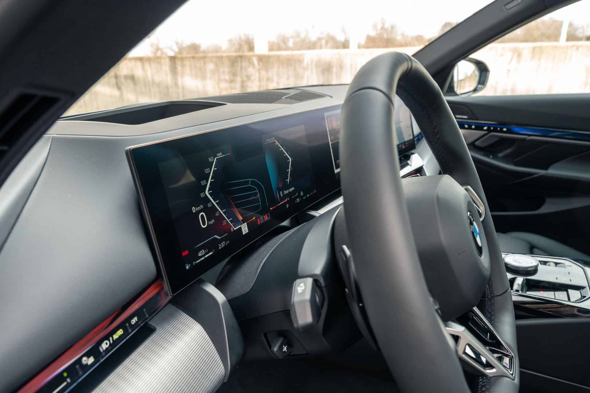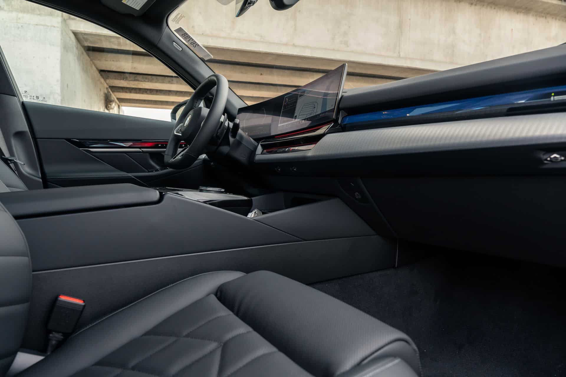 Echoing the exterior, this cabin is also predominantly black and has Veganza, which is marketing jargon for artificial leather upholstery. The eighth-generation 5 Series is actually the first BMW to be offered with a fully vegan interior. That said, you can spend extra and get extended Merino leather. It’s a $2,450 option in the US and comes in Black, Copper Brown, and Silverstone II – with all three combined with Atlas Grey.