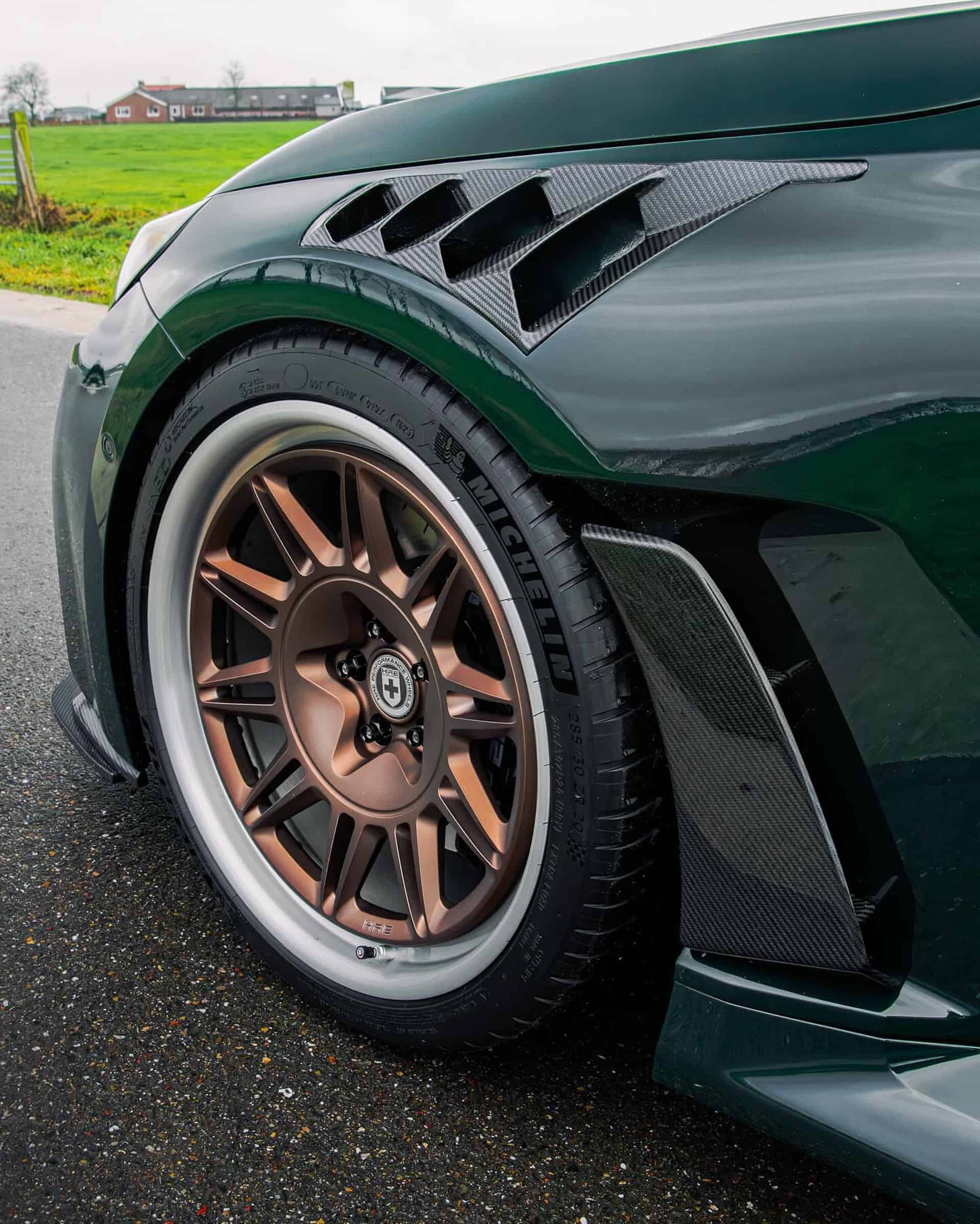 The mods alone cost an eye-watering €129,055 since the extent of the modifications goes well beyond the body kit and retro-flavored paint job. It rides on frozen polished bronze HRE 528 wheels (20 inches front / 21 inches rear) and has been fitted with a titanium exhaust system from Akrapovic. It also boasts an MSS suspension, EBC brakes, and more of that green on the inside.