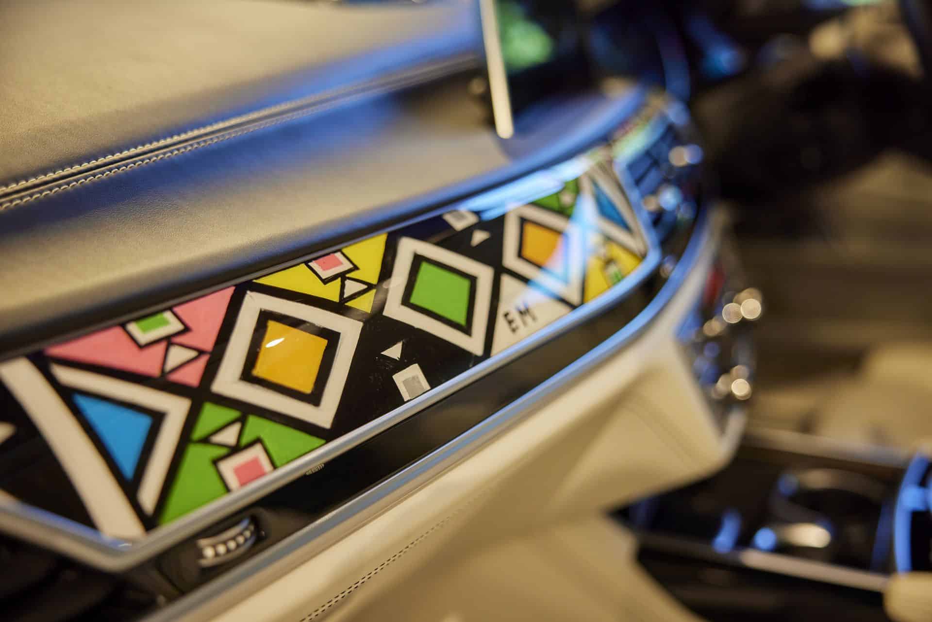 Mahlangu’s artwork is displayed on the exterior of the BMW i5 thanks to no fewer than 1,349 sections of individually controllable film. The BMW iX Flow was black and white and had 60 segments that could be individually controlled. The Vision Dee had 240. “The e-ink technology allows the car’s exterior to shift through a wide range of colors, with the potential for future iterations to display intricate patterns and designs,” Clarke emphasized, potentially hinting at future developments.