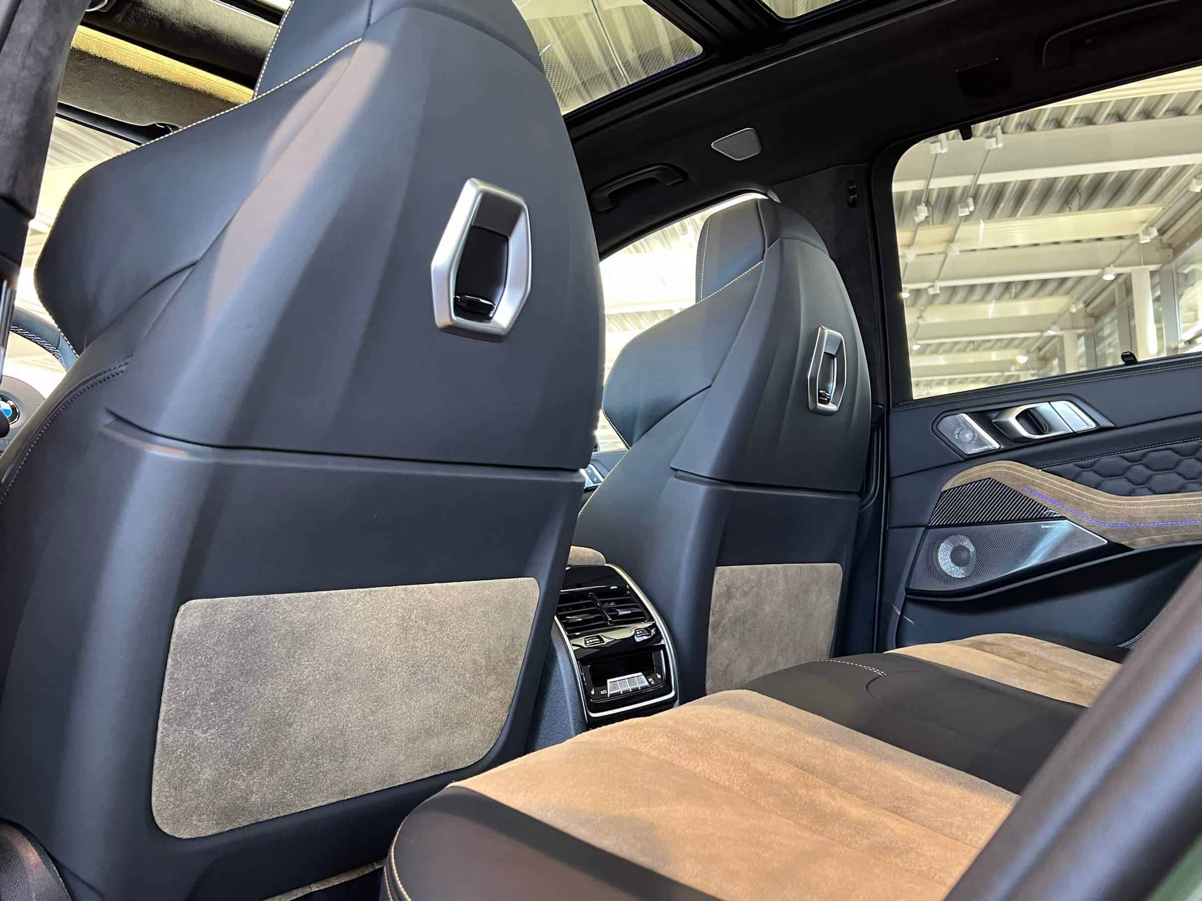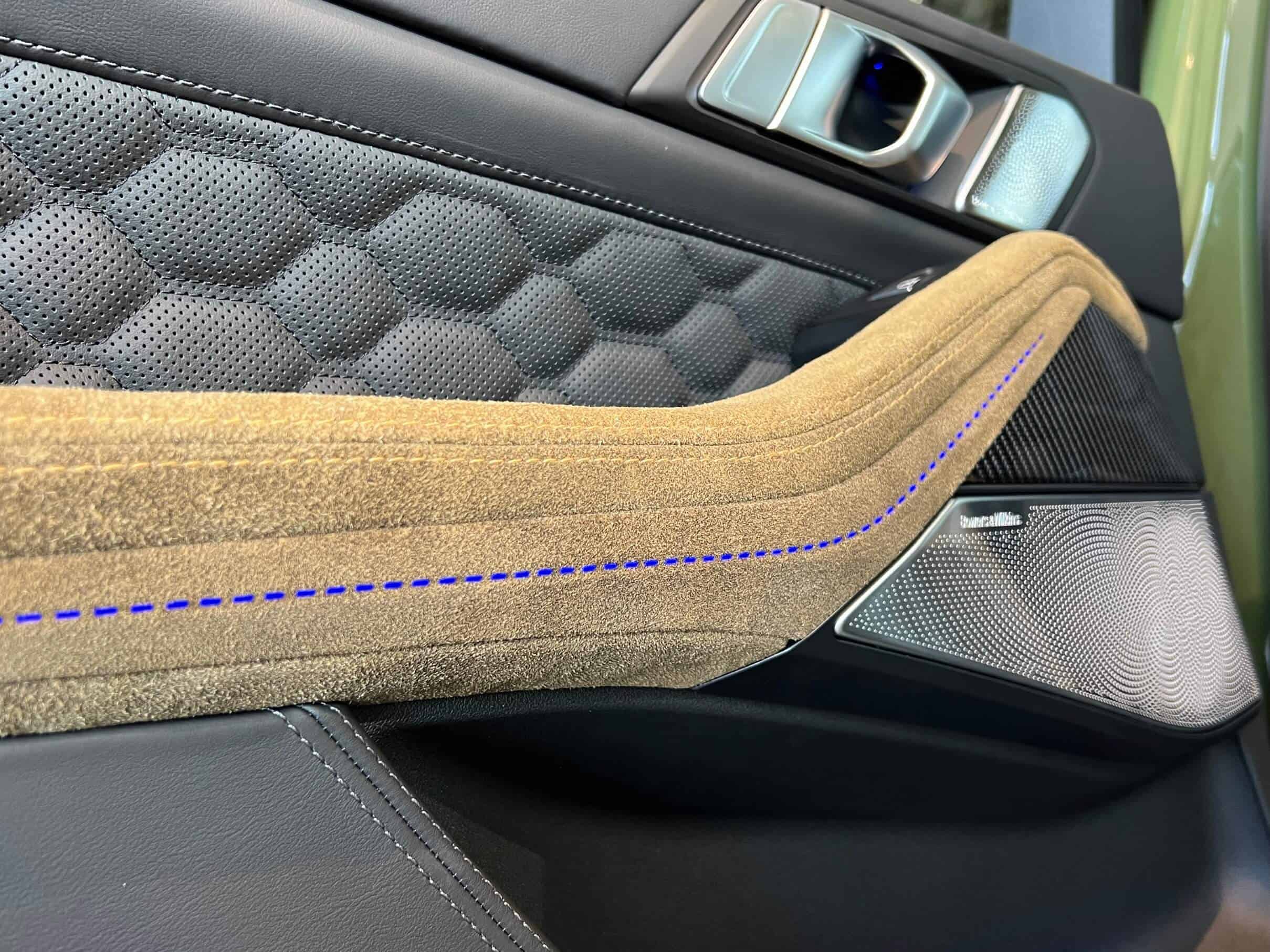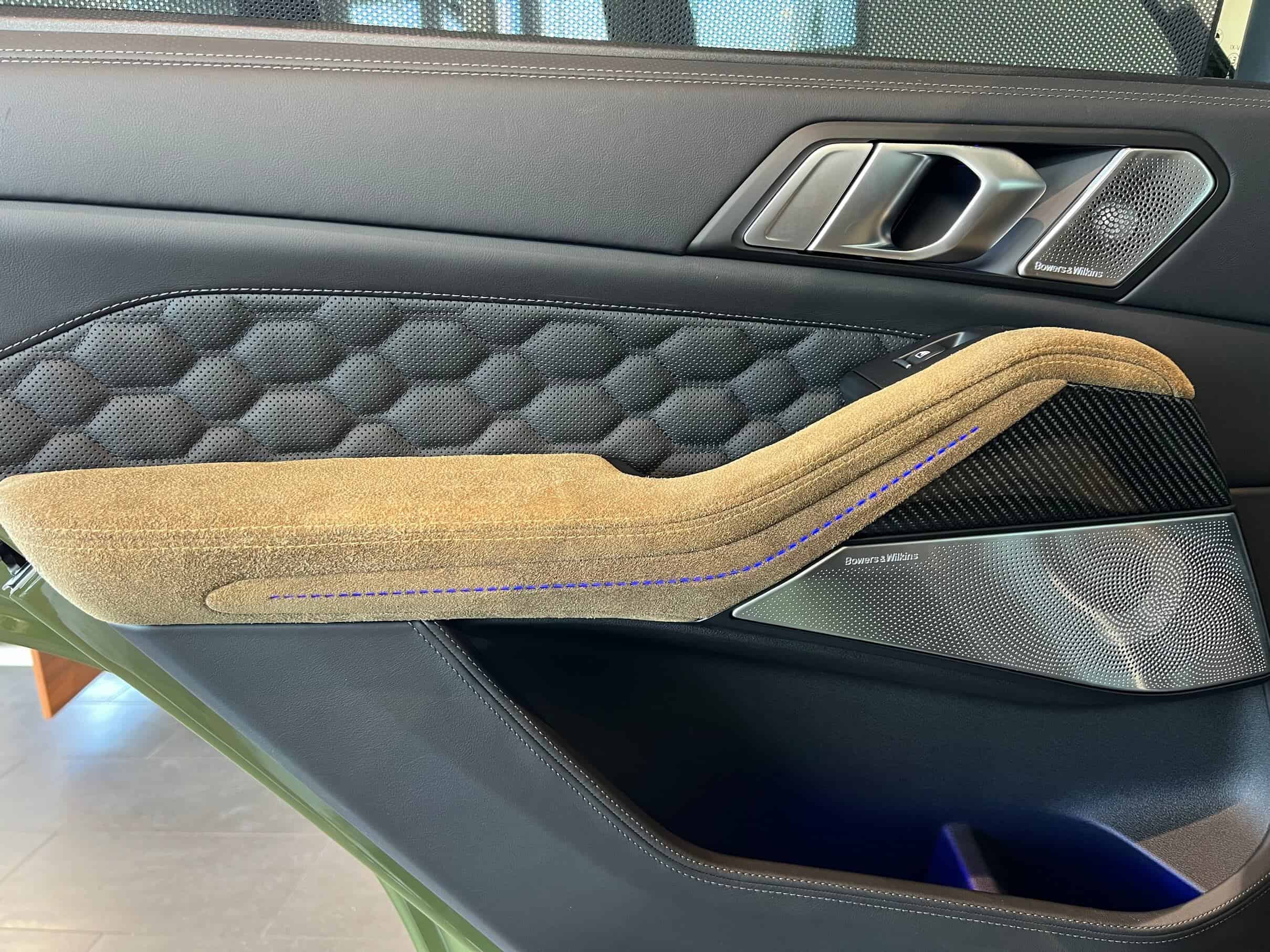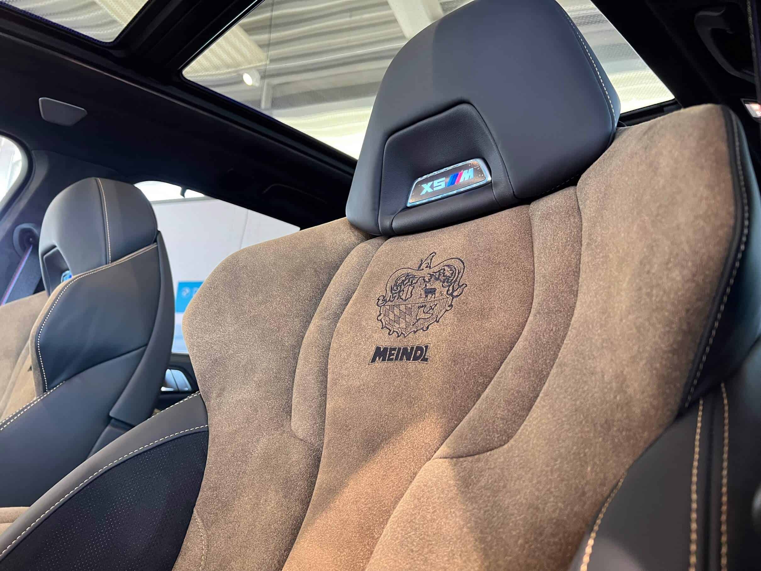The cabin’s highlight is undoubtedly the chamois-tanned deer leather found just about everywhere. It covers certain parts of the seats (front and rear), door cards, center console, and even the steering wheel’s spokes as well as the sun visors. Meindl’s logo adorns the seats, while the carbon fiber dashboard panel on the passenger side has a “BMW Individual Manufaktur 1 of 25” detail to denote the X5 M Competition’s exclusivity.