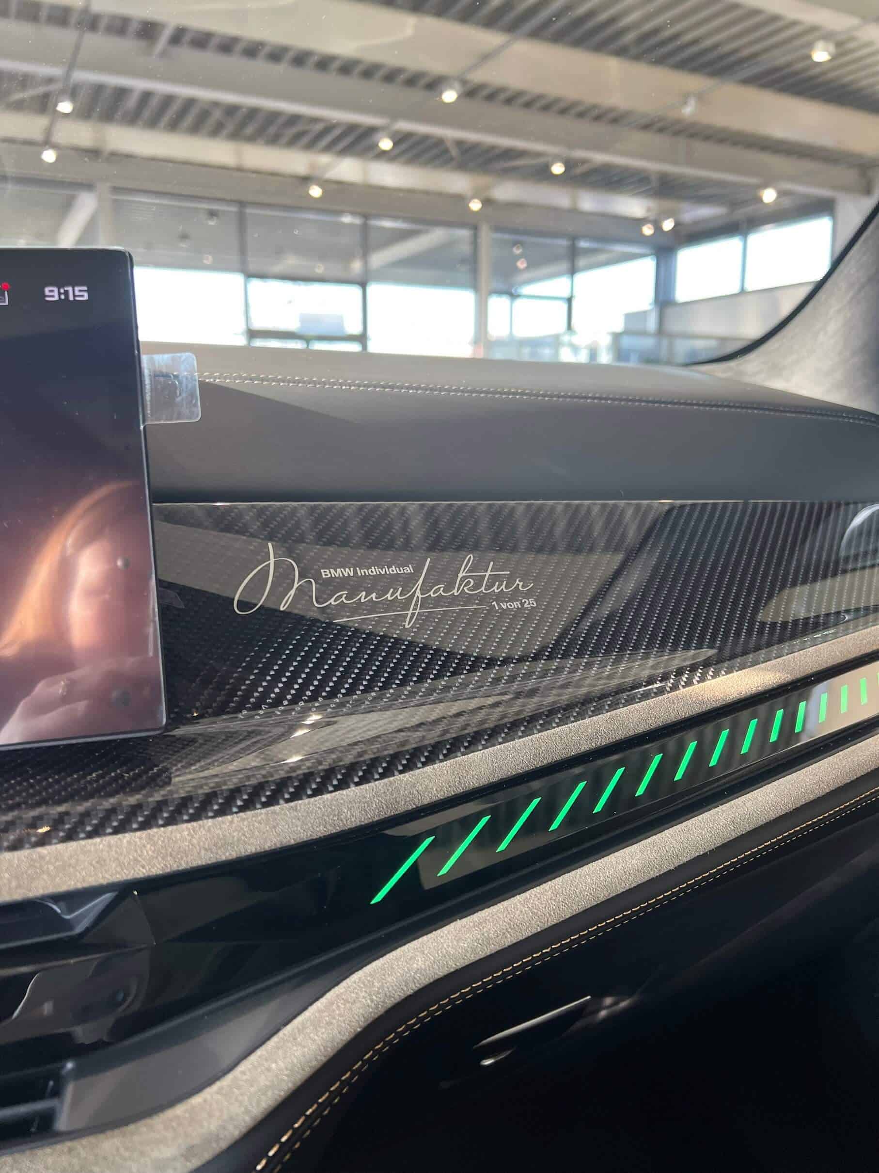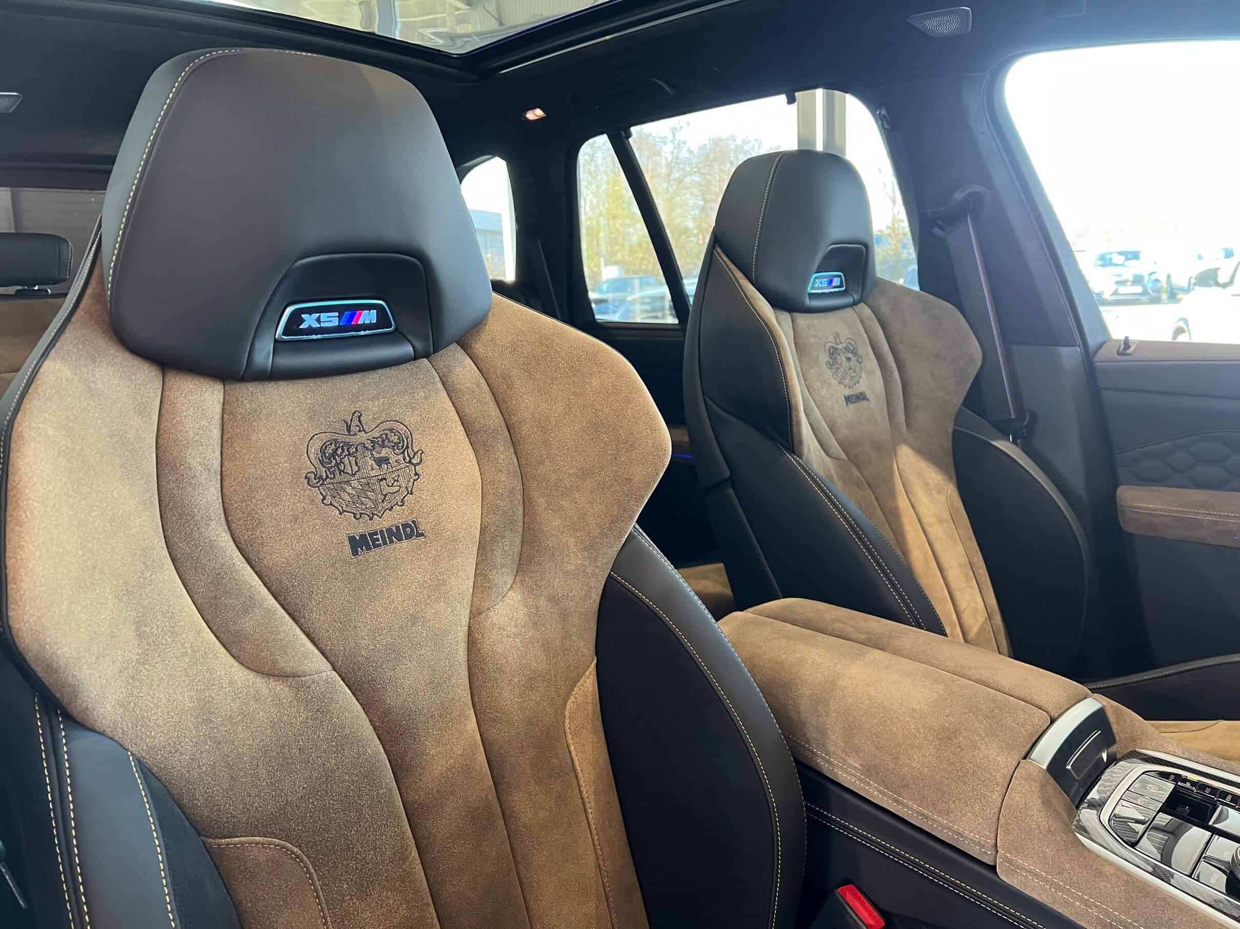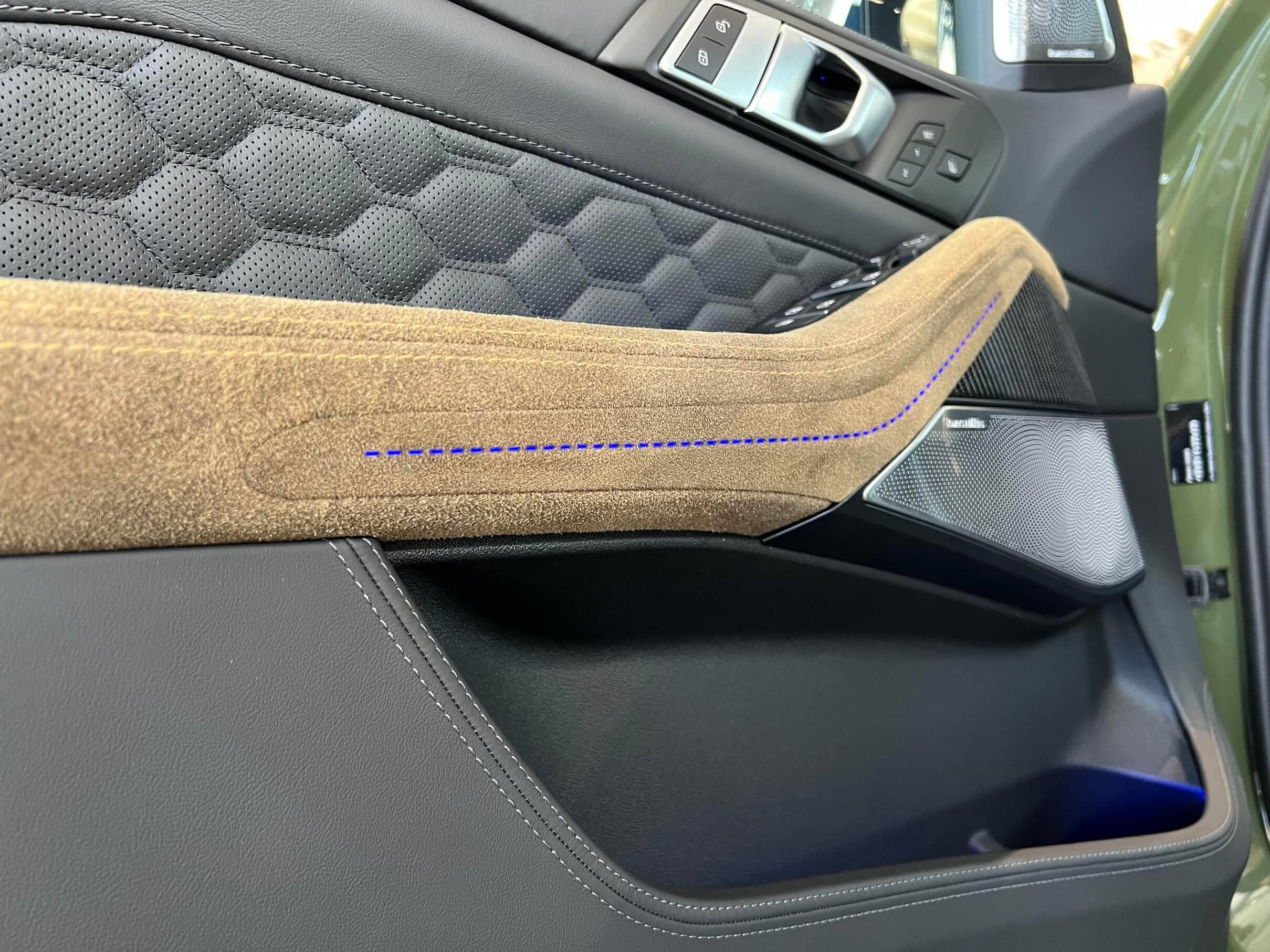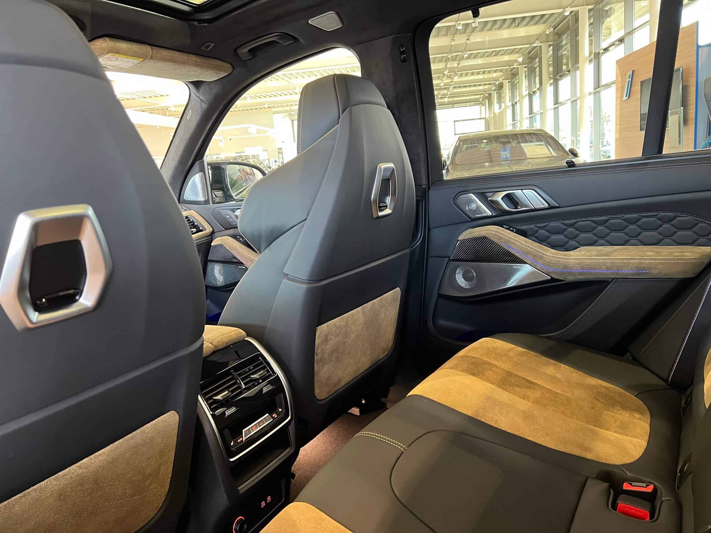 The cabin’s highlight is undoubtedly the chamois-tanned deer leather found just about everywhere. It covers certain parts of the seats (front and rear), door cards, center console, and even the steering wheel’s spokes as well as the sun visors. Meindl’s logo adorns the seats, while the carbon fiber dashboard panel on the passenger side has a “BMW Individual Manufaktur 1 of 25” detail to denote the X5 M Competition’s exclusivity.