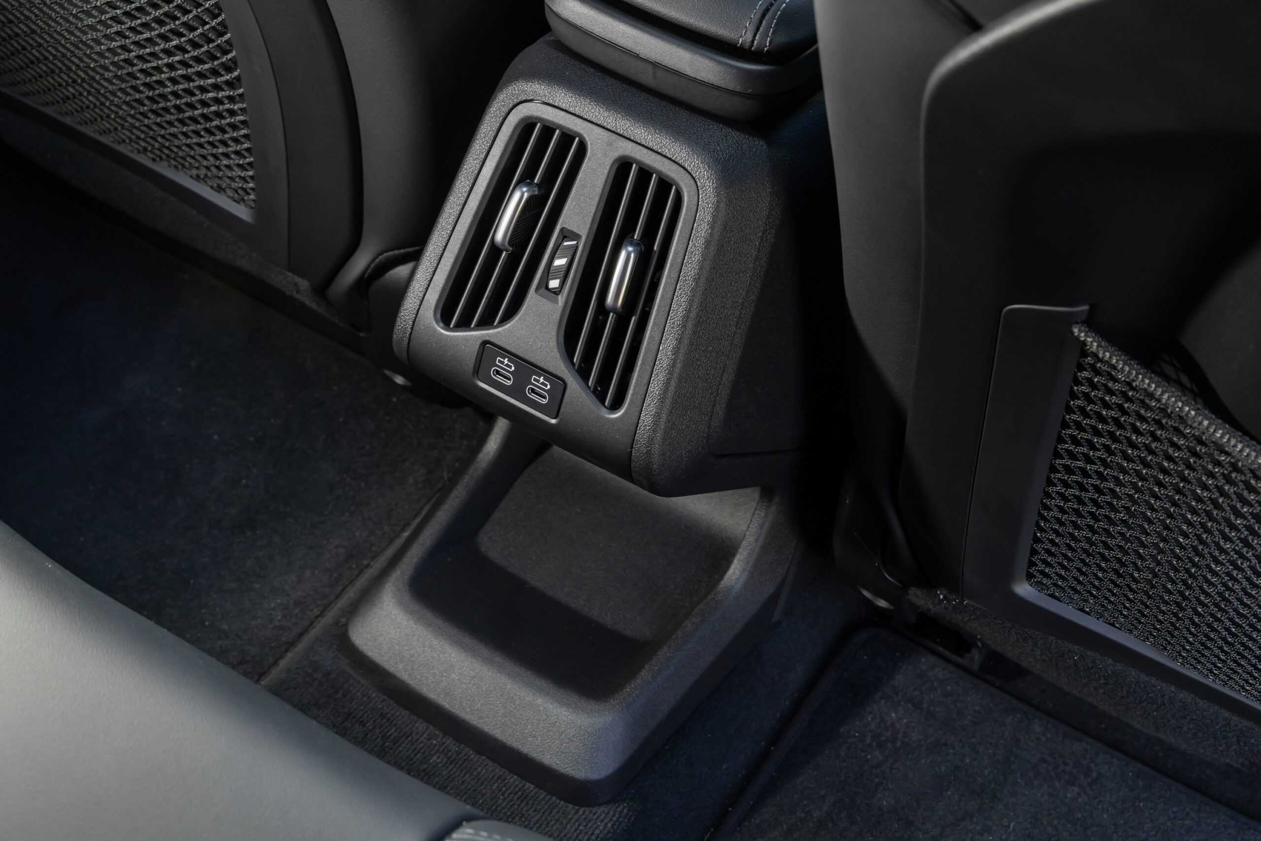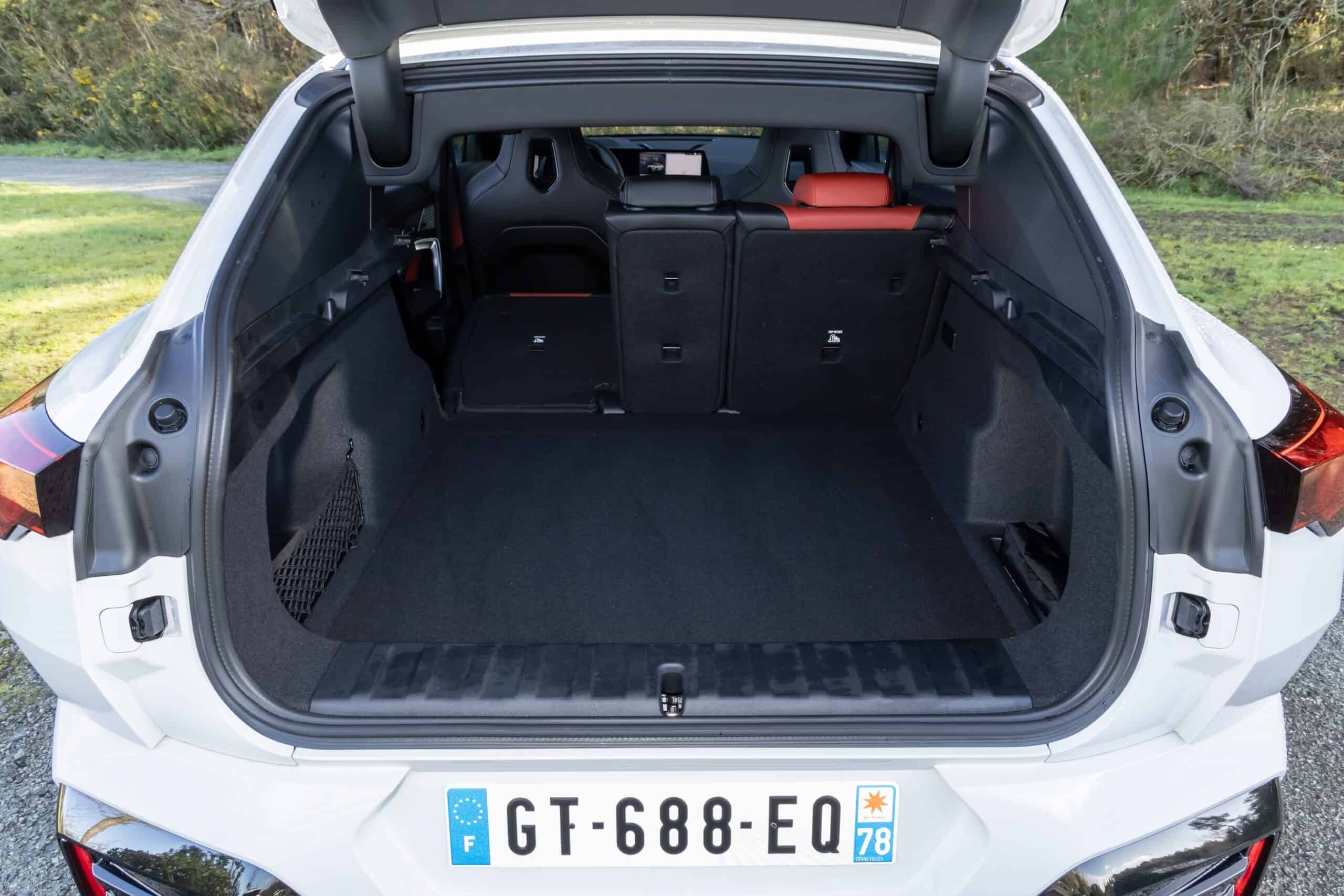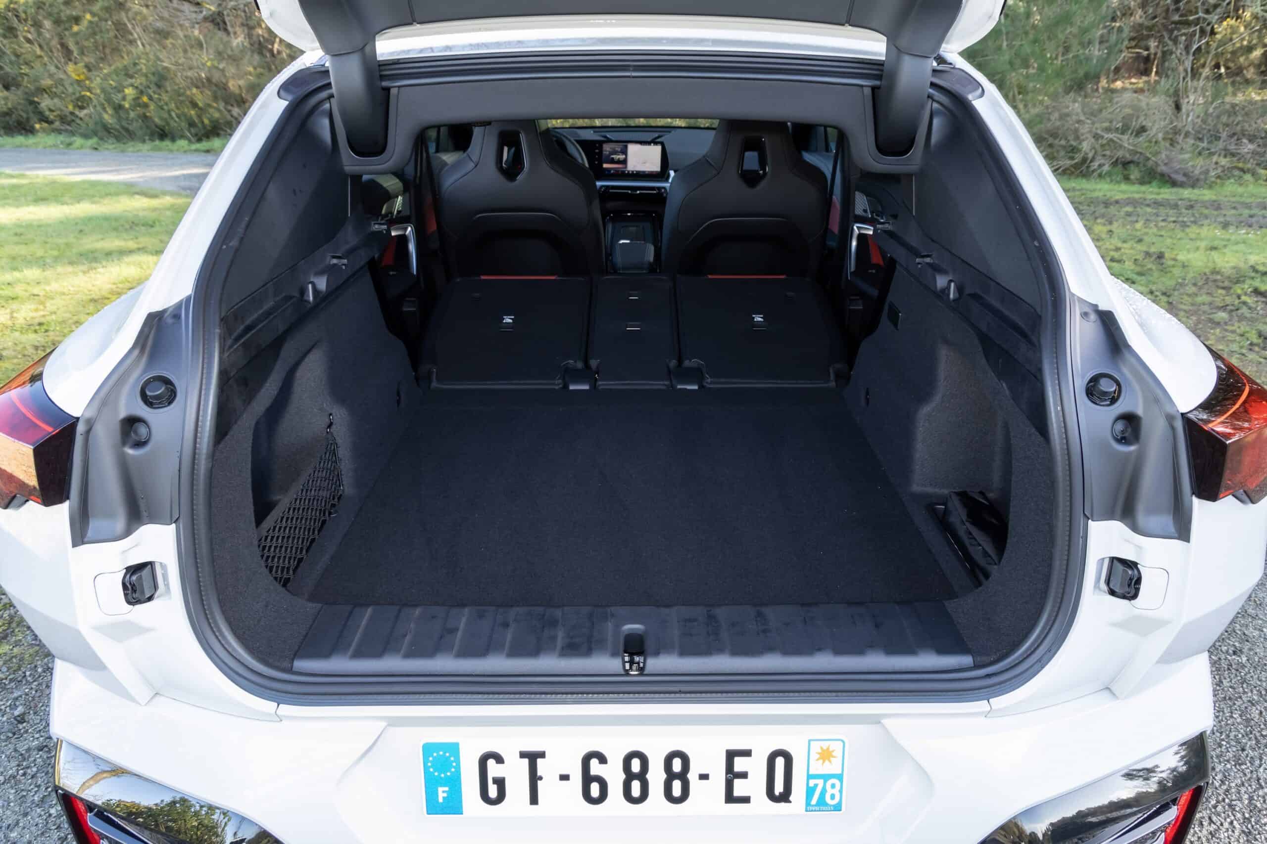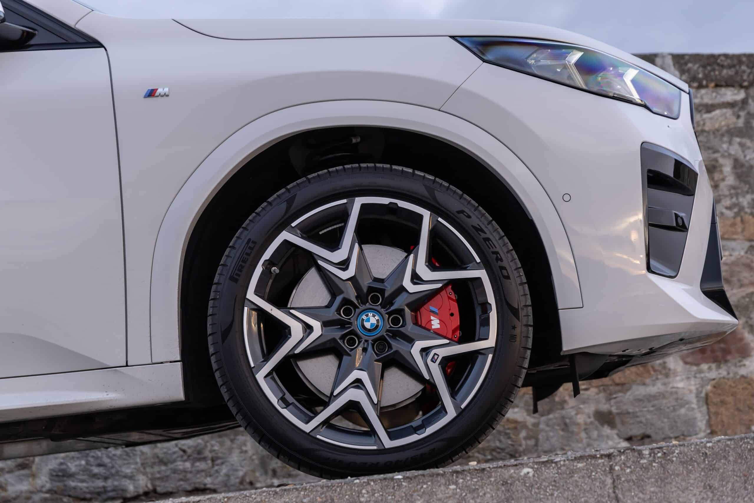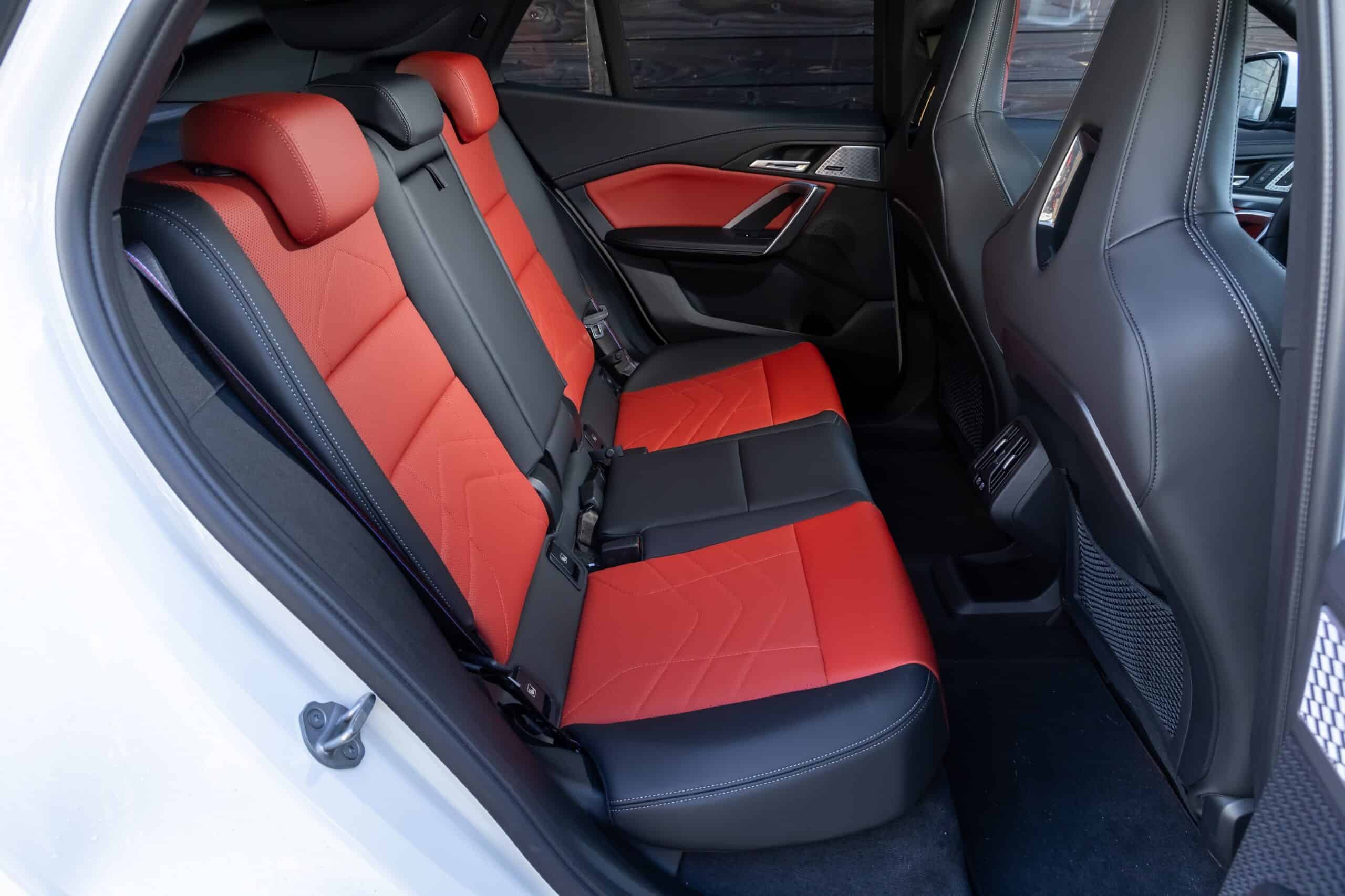 Those 20-inch wheels (Style 873 M) are the largest available for the iX2 but you can go a size higher for the X2 M35i. The latter also has optional M Compound brakes with gray calipers, which are exclusive to the M Performance model. This iX2 with the M Sport Package does borrow the body-hugging seats from the X2 M35i, complete with the illuminated M logo below the integrated headrests.