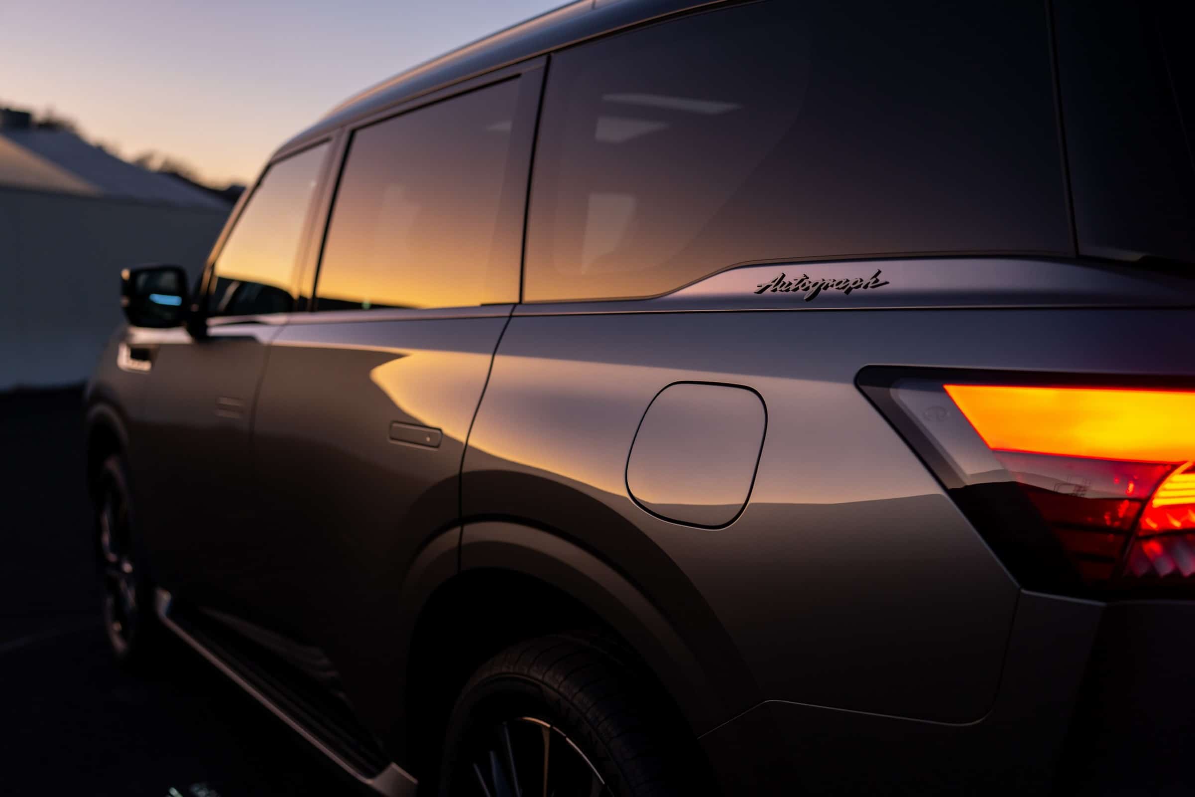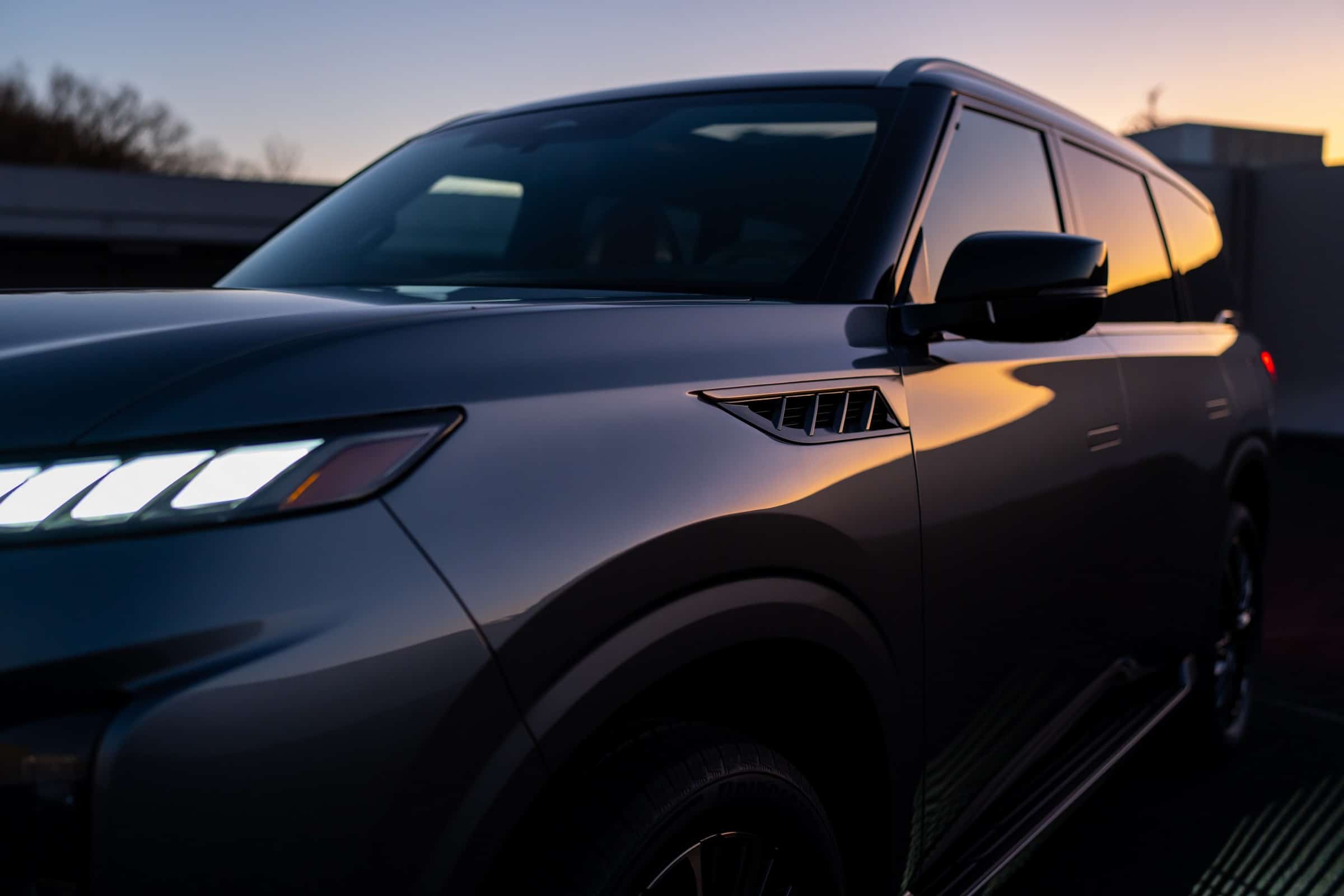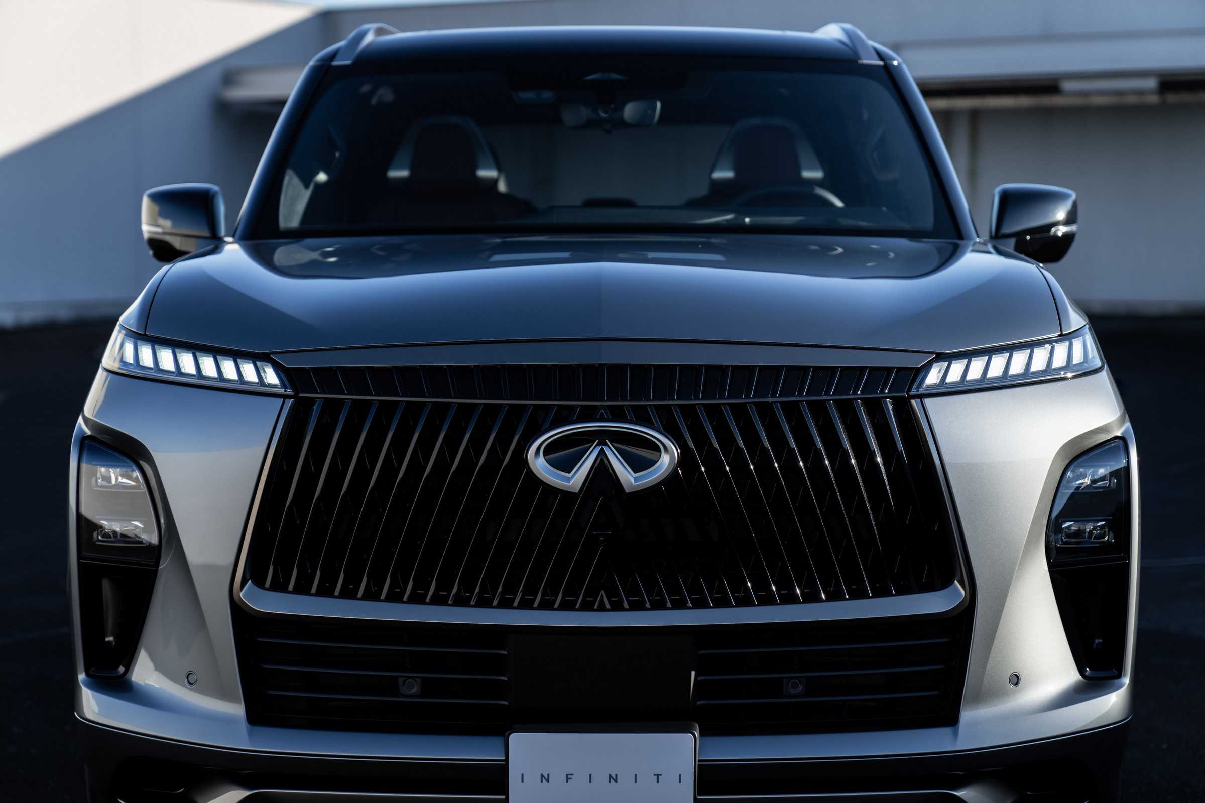 Designers are (probably) saying the QX80 ticks all the right boxes since it has a gigantic grille, an illuminated badge, flush door handles, huge wheels, and fake air intakes on the front fenders. The greenhouse is massive, and we’re hoping there’s a rear wiper tucked underneath the roof spoiler as on some Range Rover models.