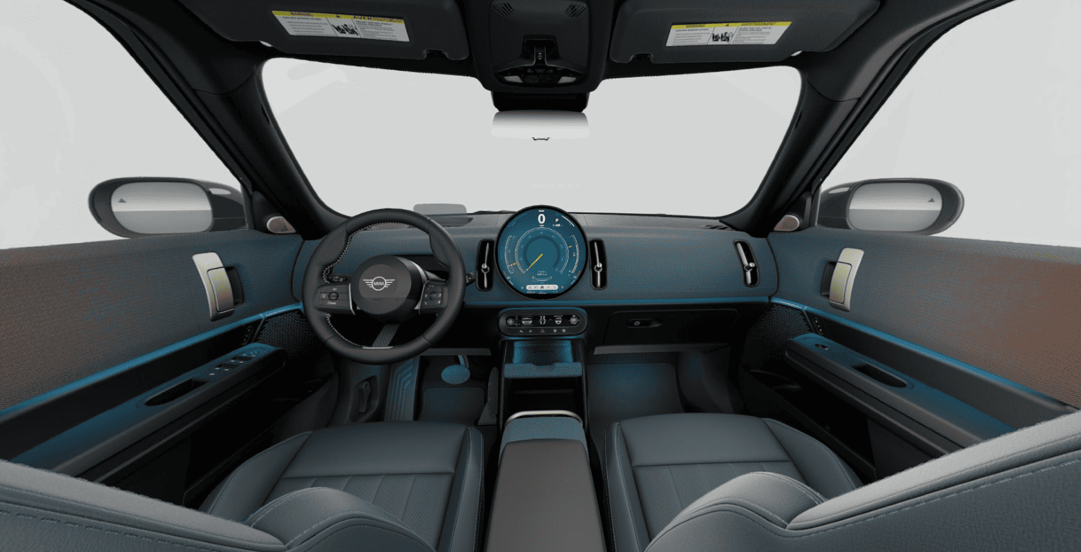 The new interior of the 2025 MINI Countryman is minimalistic but luxurious. The 2025 MINI Countryman S ALL4 has plenty of choices – brown, blue, beige, and black – while the 2025 MINI Countryman JCW ALL4 is only offered in black. Leather isn’t available, but Vescin is standard – think SensaTec or synthetic leather.