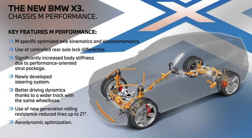 Naturally, the BMW X3 M Performance Model features M-specific optimized axle kinematics and elastokinematics, an upgraded M Adaptive Suspension, and stiffer bushings, springs, and roll bars compared to the base X3 models. There is a new variable damper controller as well, which significantly impacts the driving modes offered in the car. We’ve already seen recent BMWs offering a wider gap between driving modes, and this new G45 X3 will extend the gap between Comfort and Sport even more.