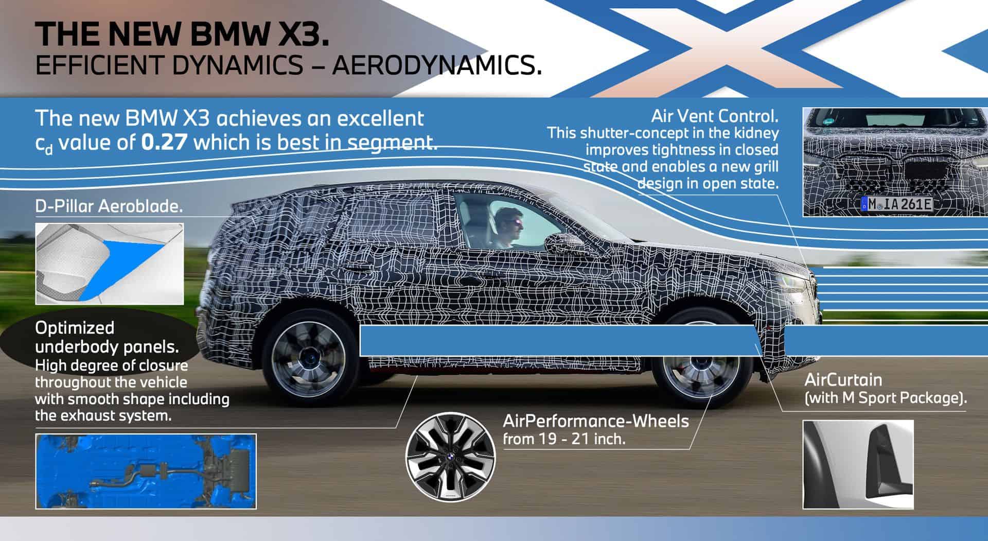 The BMW X3 gets some serious new hardware as it enters its fourth generation. Before we talk about the suspension or chassis bits, one look at the camouflaged beast reveals a lot of important details – specifically regarding aerodynamics. The new 2025 BMW X3 achieves a drag coefficient of 0.27 – the best in the segment, according to the automaker. A D-pillar “Aeroblade,” AirPerformance-Wheels (available in sizes from 19 to 21 inches), and an active-shutter kidney grille all help. We can’t see it, but the underbody panels have been reconfigured to provide an even smoother undertray, too.