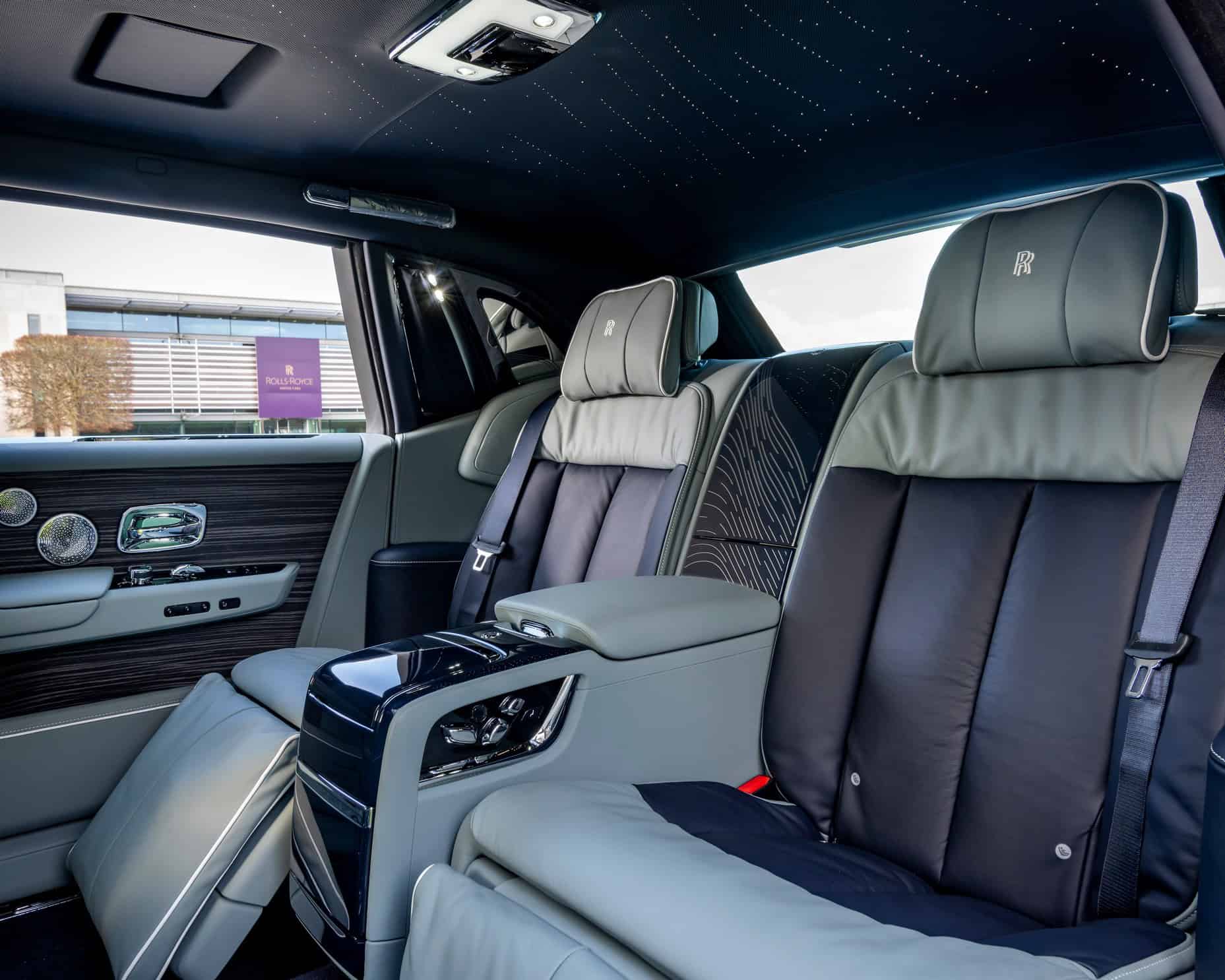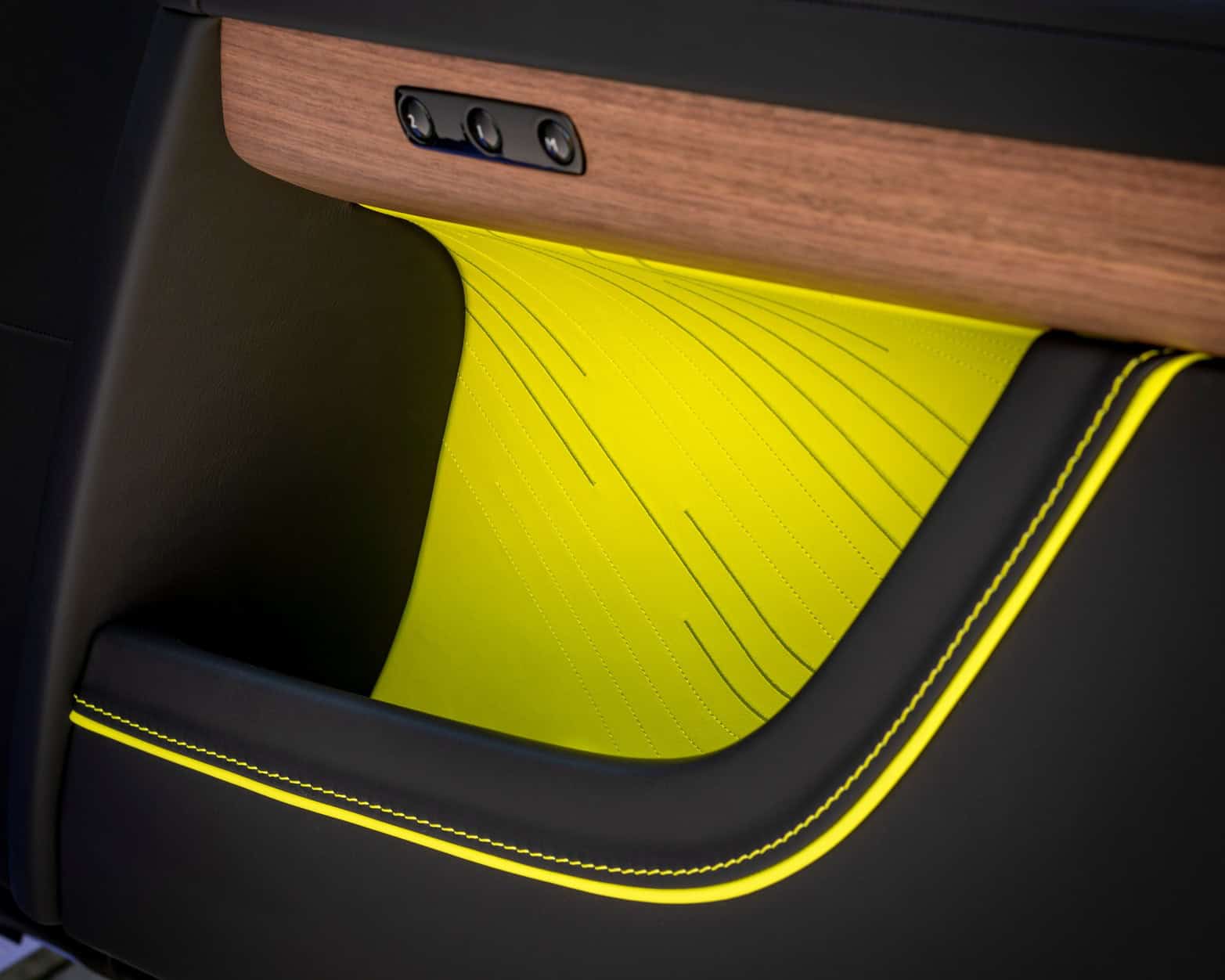 As with all Rolls-Royce models, the real magic is inside where there are 104,268 stitches across all four door panels. In addition, it’s hard to miss the Lime Green accents on the Black and Arctic White leather seats. This one too has a Starlight Headliner, comprised of 520 lime green and another 520 white stars.