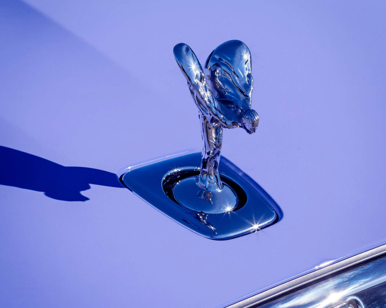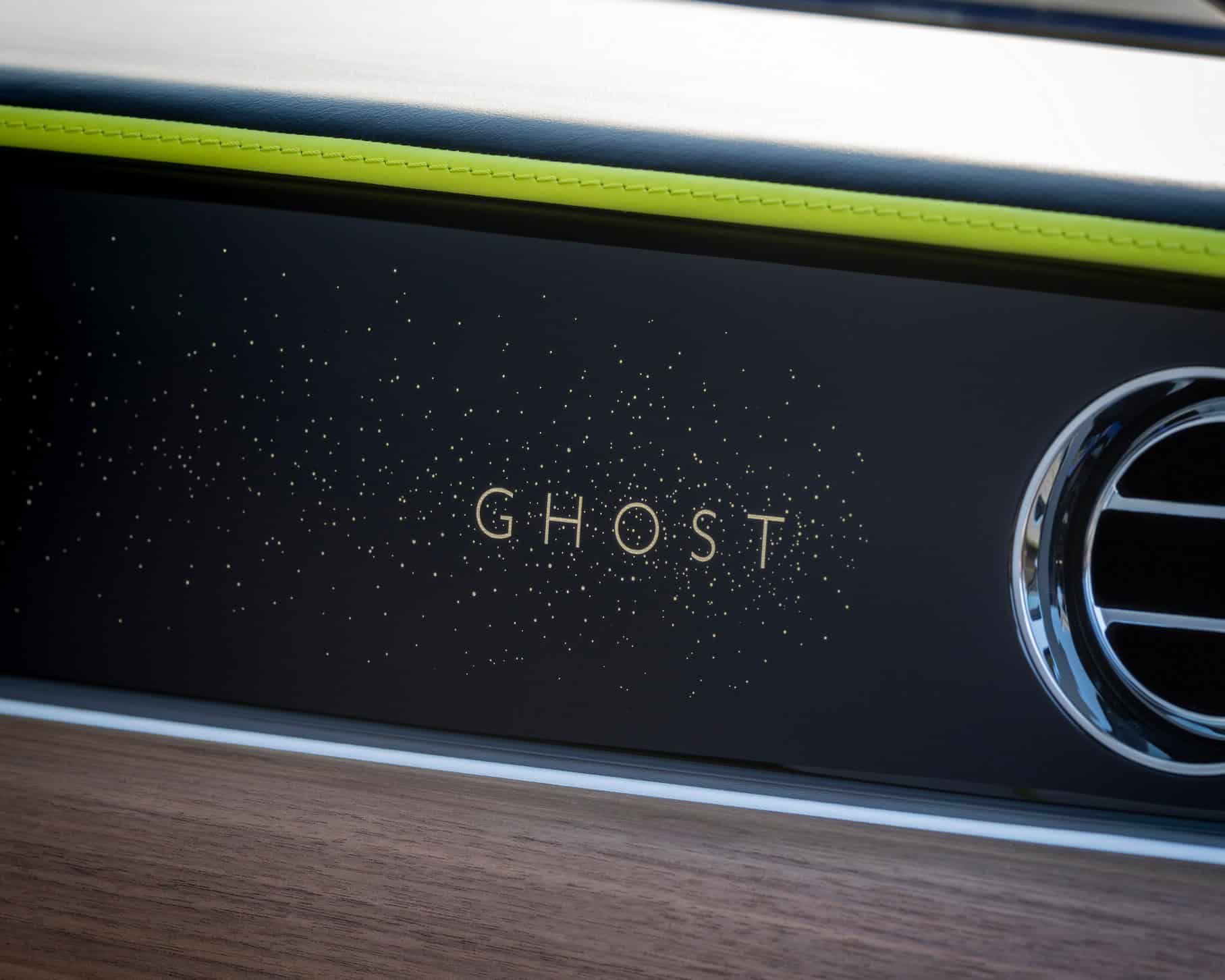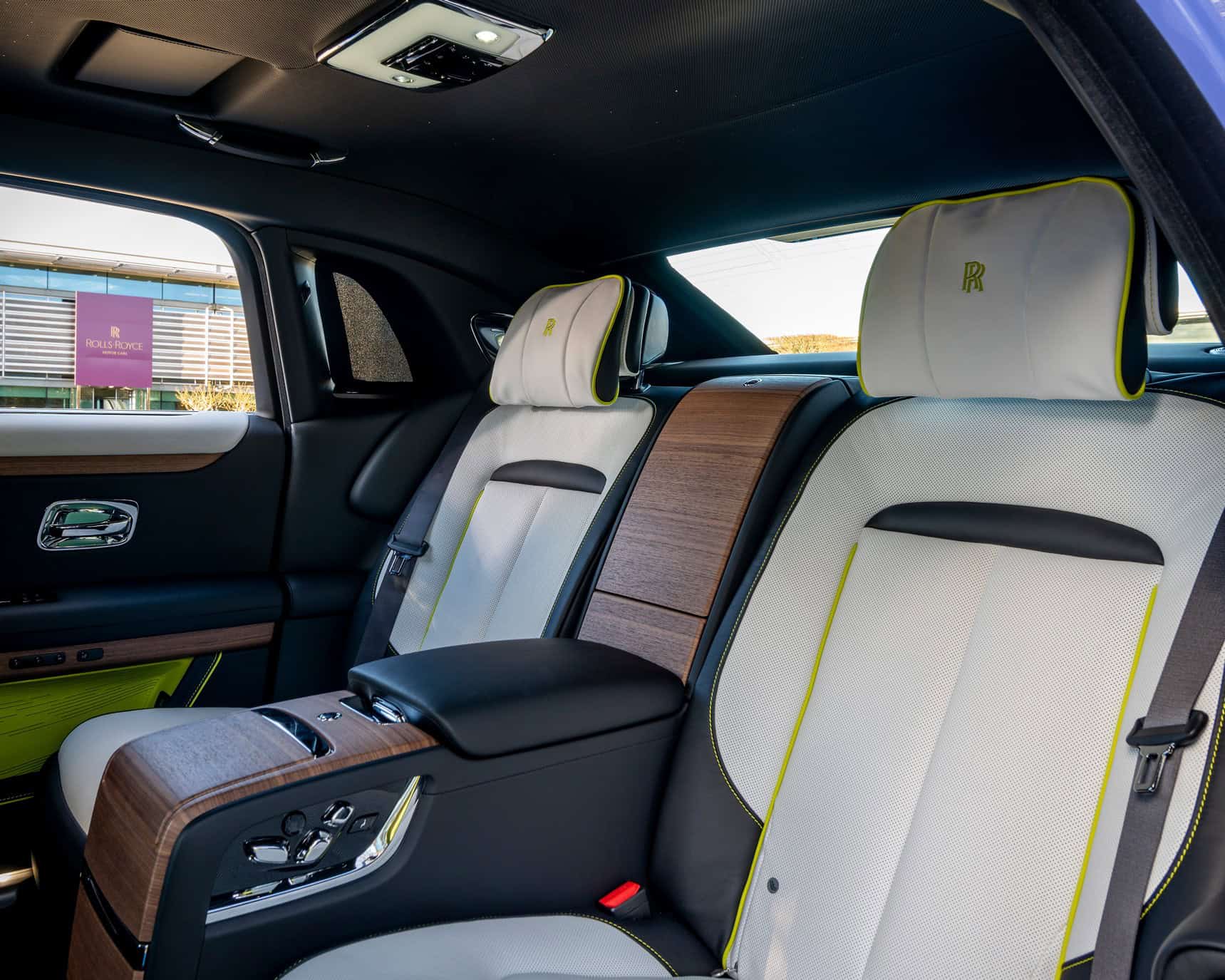 Last but certainly not least, the stretched Ghost has an eye-catching Boracay Blue paint job with a hand-painted Lime Green coachline. The 21-inch wheels are partially polished and come wrapped in tires with retro-flavored white sidewalls.