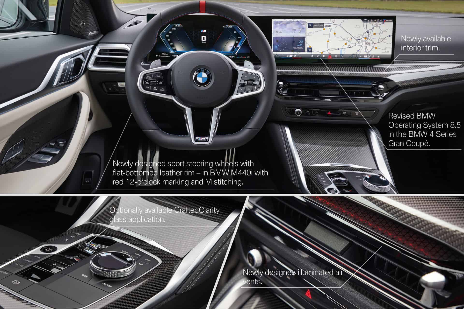 The interior has been largely carried over, but all 4 Series Gran Coupe LCI models have slightly redesigned air vents. Specifically, the ones in the middle have a new look and different adjustment controls, plus contour lighting. As standard, the M440i gets a flat-bottomed steering wheel with a red center marker and M-colored stitching.