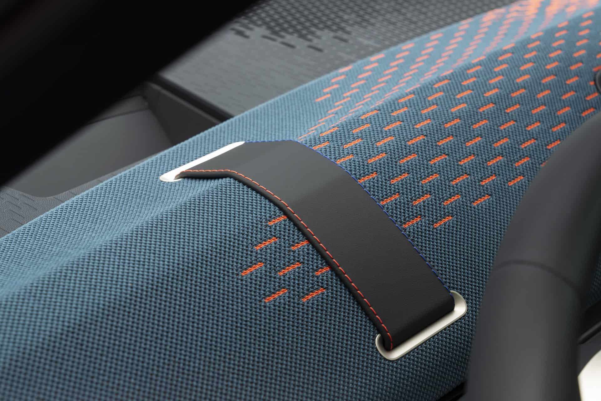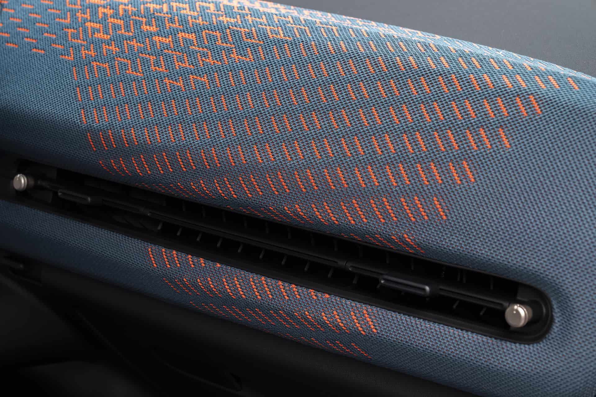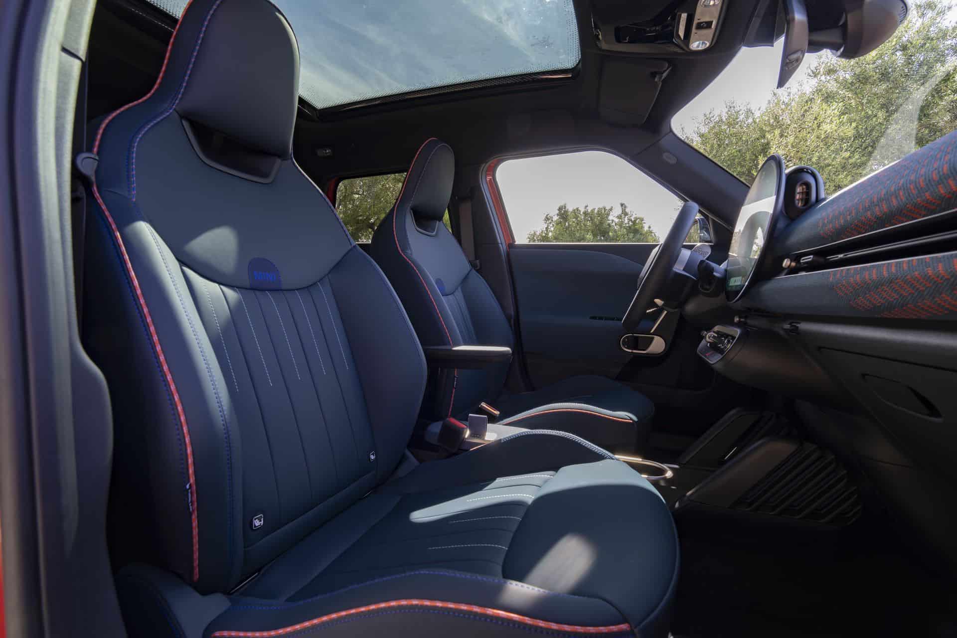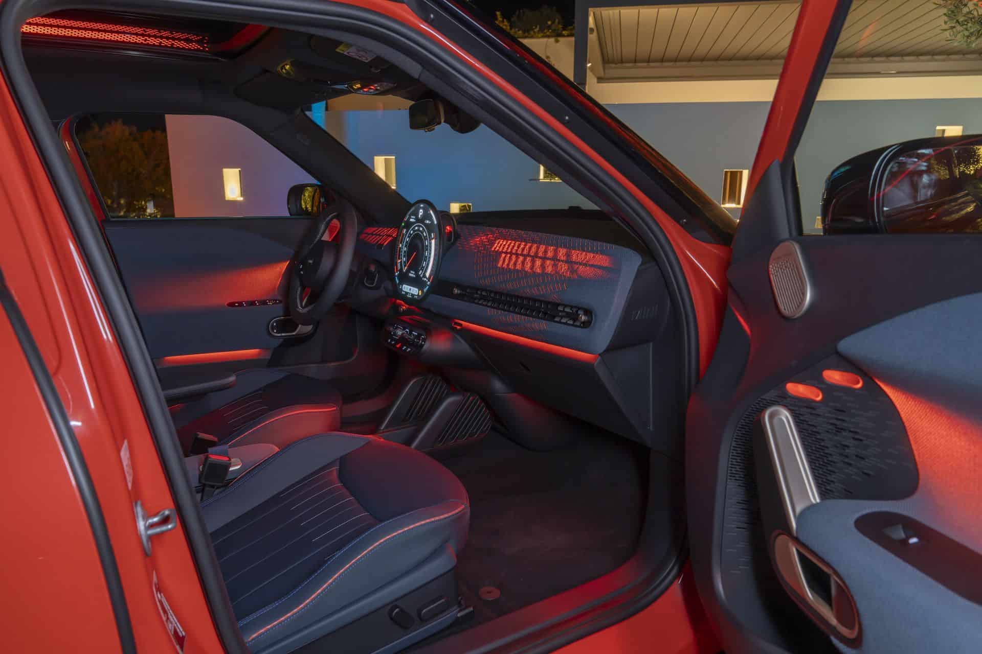 The splashy exterior theme continues inside with bold colors and intricate ambient lighting. Some parts of the cabin are covered with recycled polyester while others are in synthetic leather. As with other recent MINIs, you can’t get real leather upholstery for the Aceman. The multi-colored knitted textile and red stitching do a good job of spicing up the ambiance.