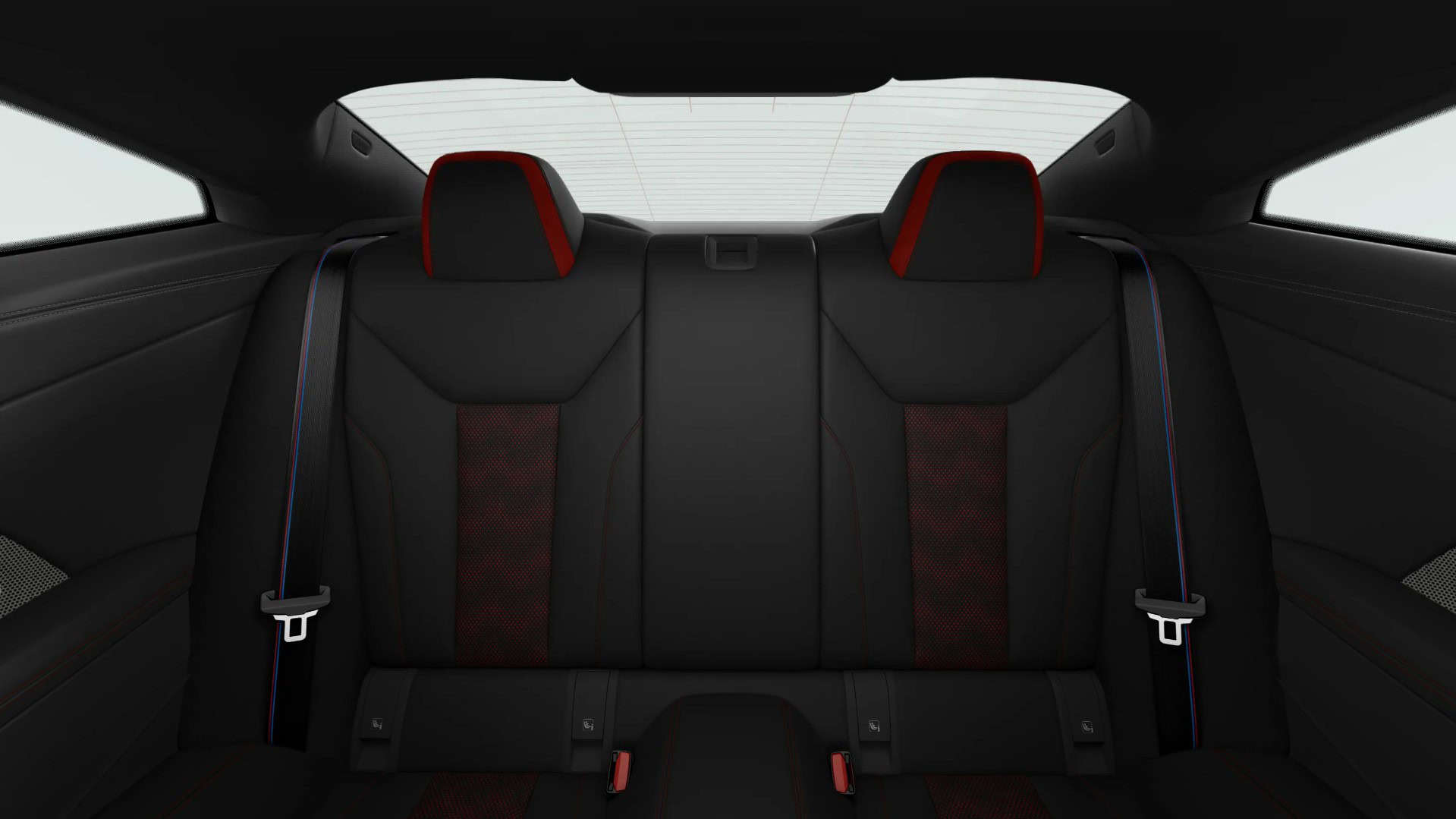 That steering wheel we mentioned is wrapped in Alcantara and has a new flat-bottom design along with a red 12 o’clock mark. As for the electrically operated heated seats, BMW wraps them in Merino leather with a black/red theme. The 2025 M4 CS will be delivered with an anthracite-colored headliner and with M colors adorning the seatbelts.