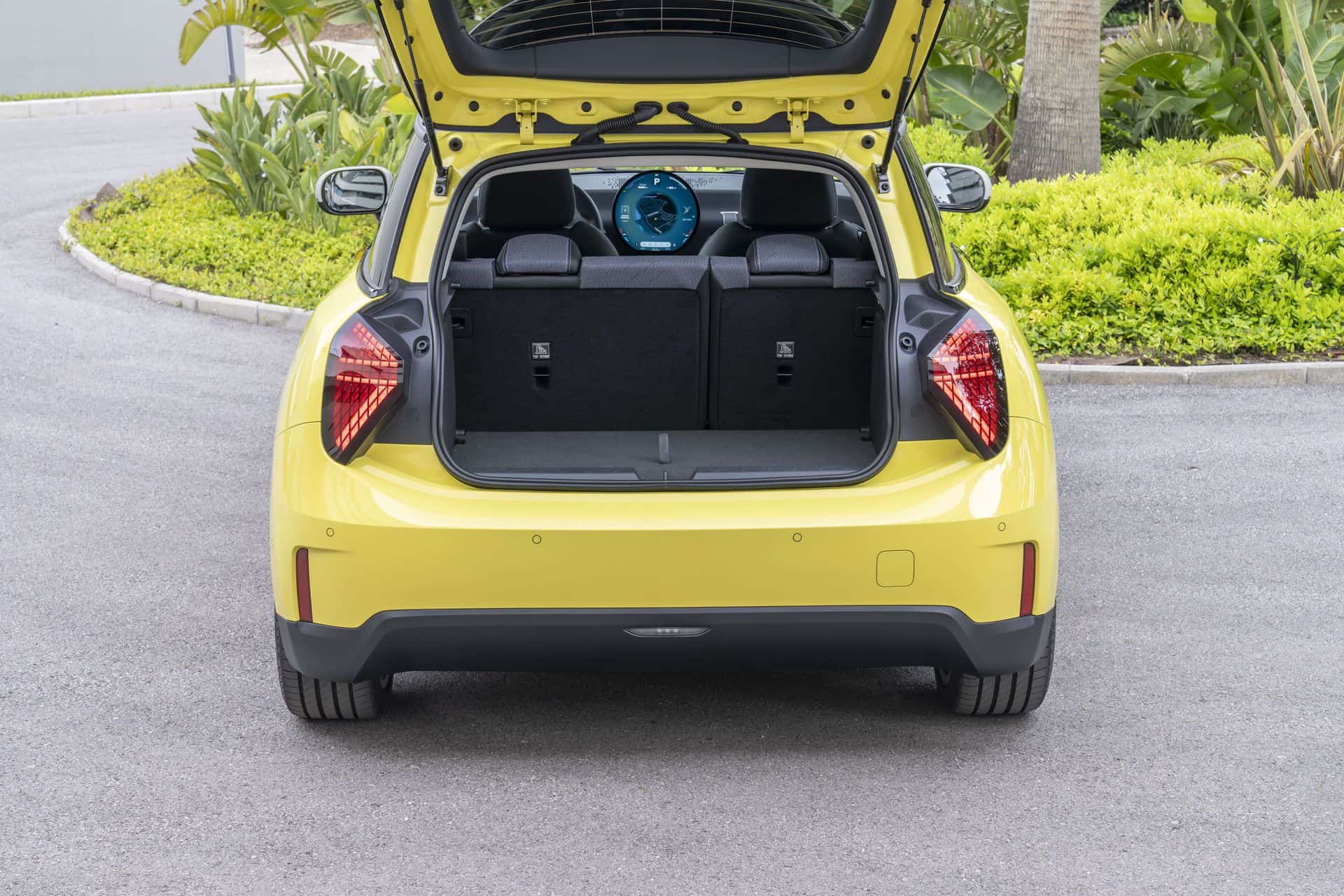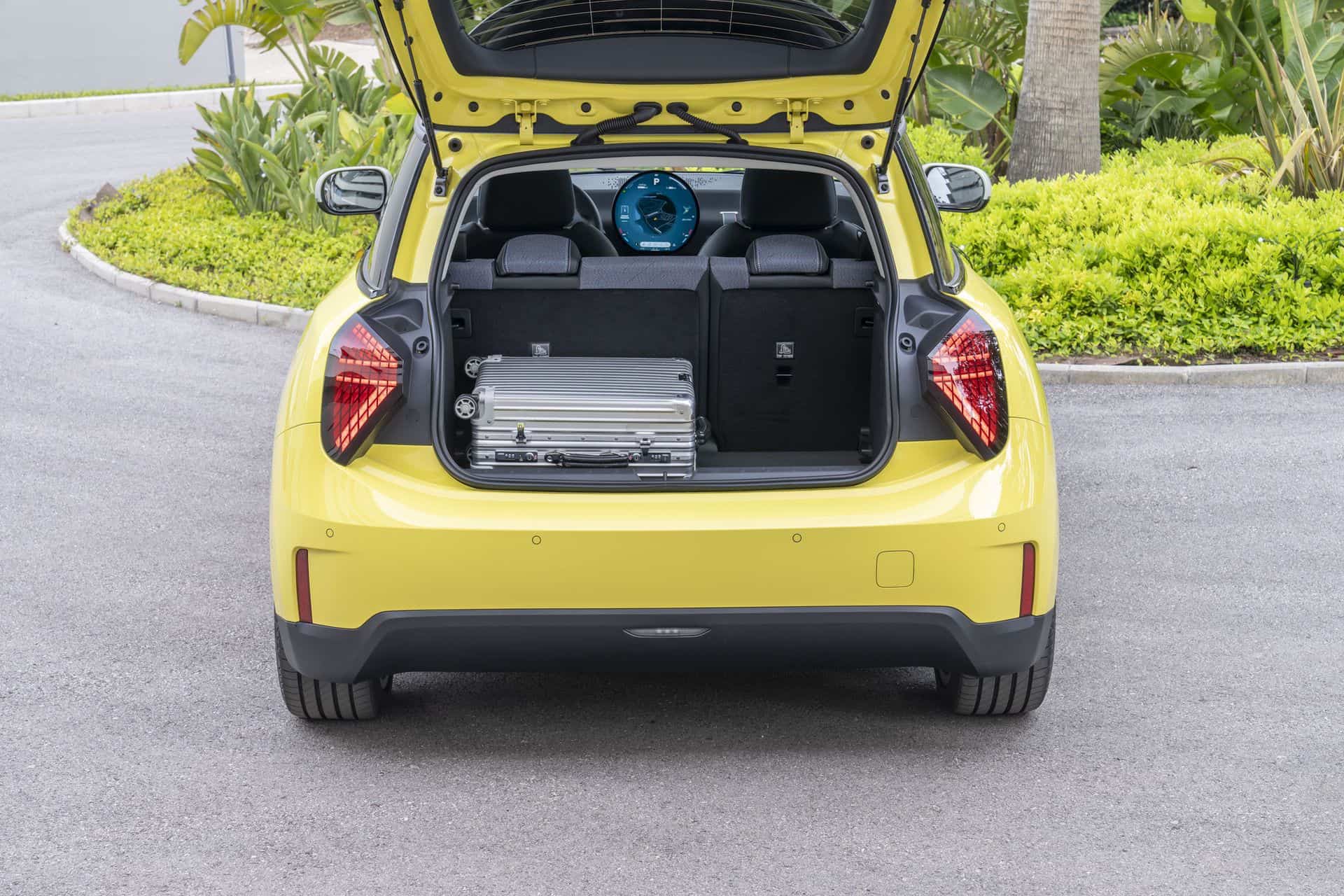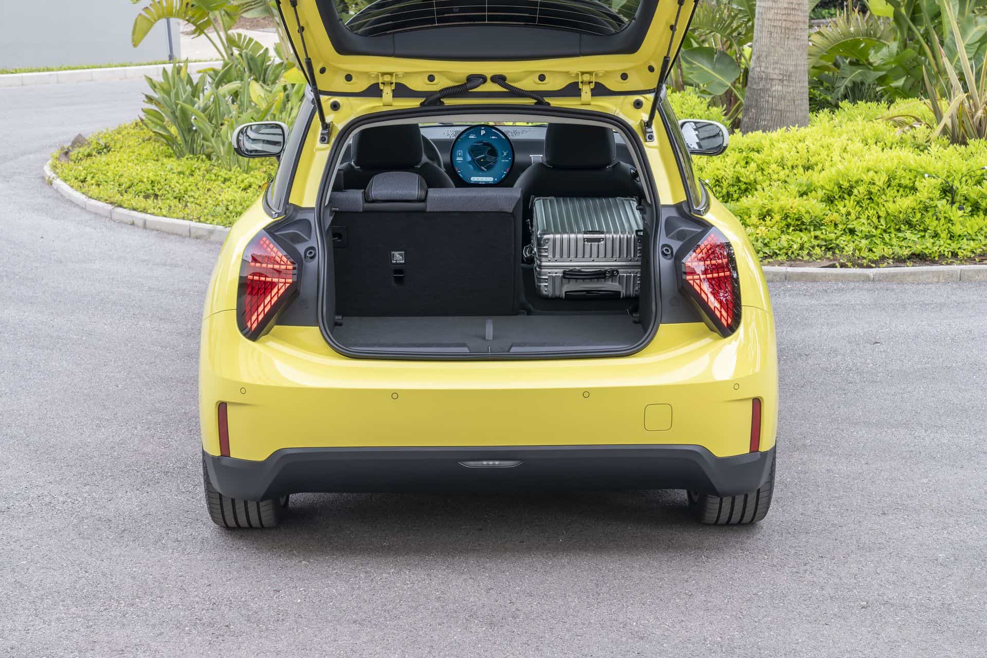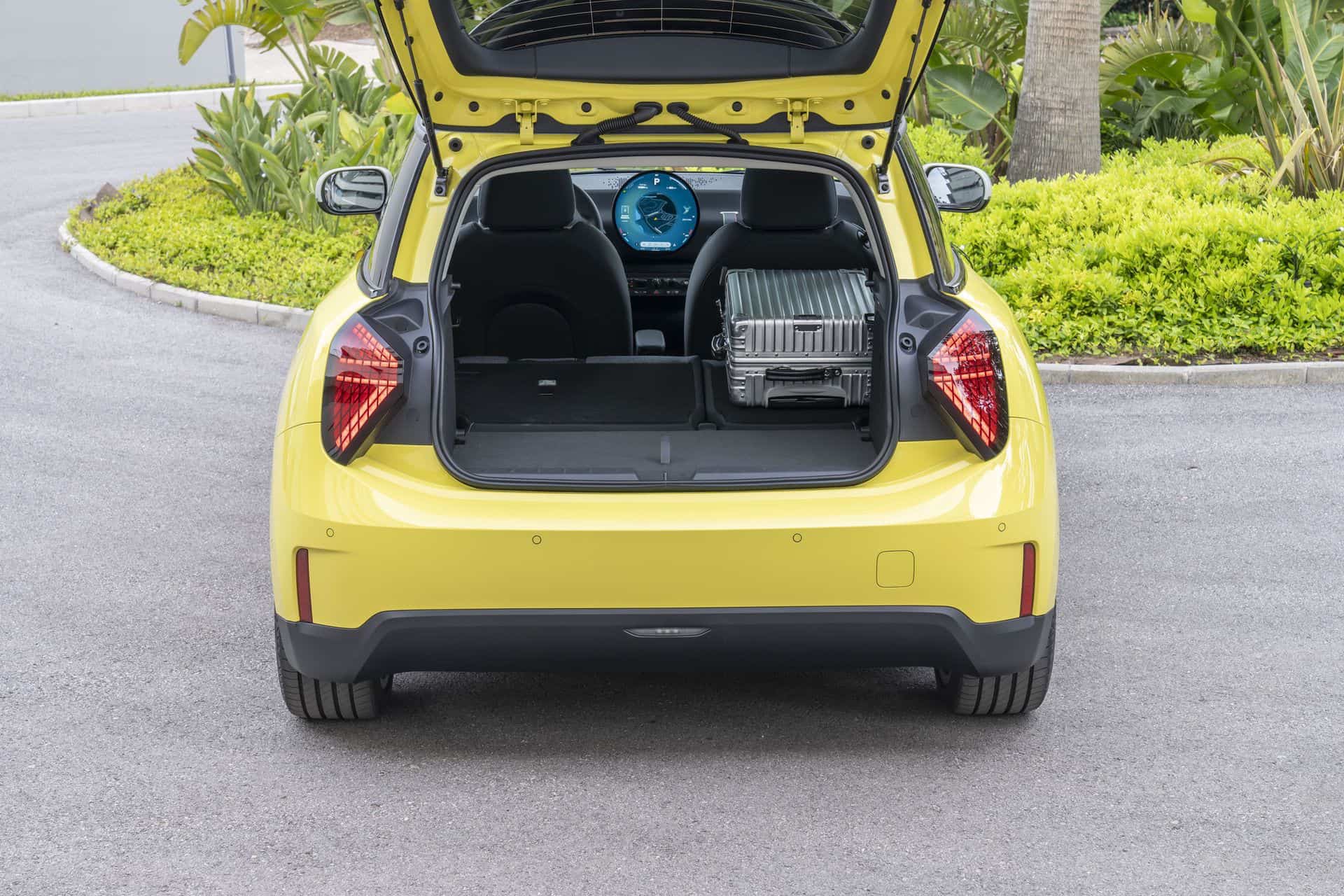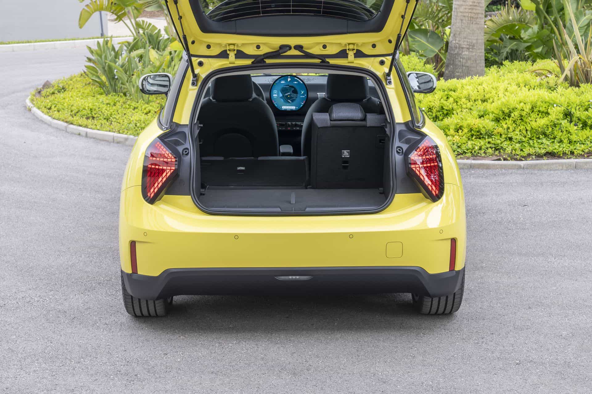 The wheel arch trim? Gone. Flush door handles and no chrome finish—inside or out. They call it ‘Charismatic Simplicity’. And the triangular tail lights? They definitely set it apart at the rear from the previous generation Coopers. The rear-end is quite upright with a more tapered appearance, and the windshield angle is notably steep—primarily for aerodynamics and to meet safety regulations. The taillights are also new offering the ability to customize the inner graphics from the Operating System 9.