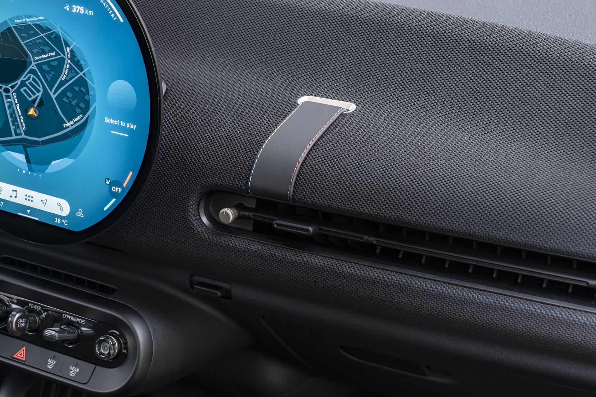 Next, the new MINI Cooper SE features all-vegan upholstery, complemented by knitted fabric on the dashboard and door panels. For those seeking detailed customization, the strap that functions as a spoke on the steering wheel and the dashboard strap can be personalized with various color and stitching options. Some might call these details statements of style and choice.
