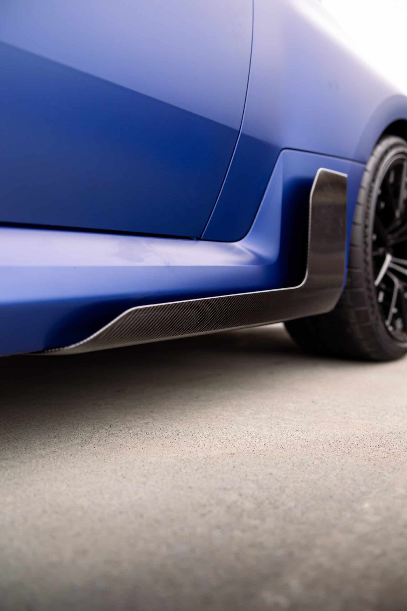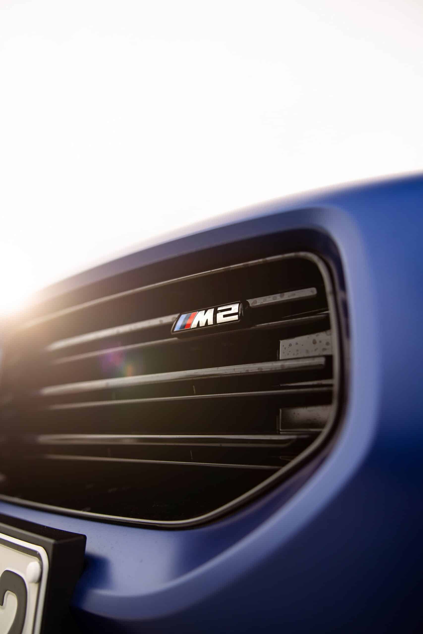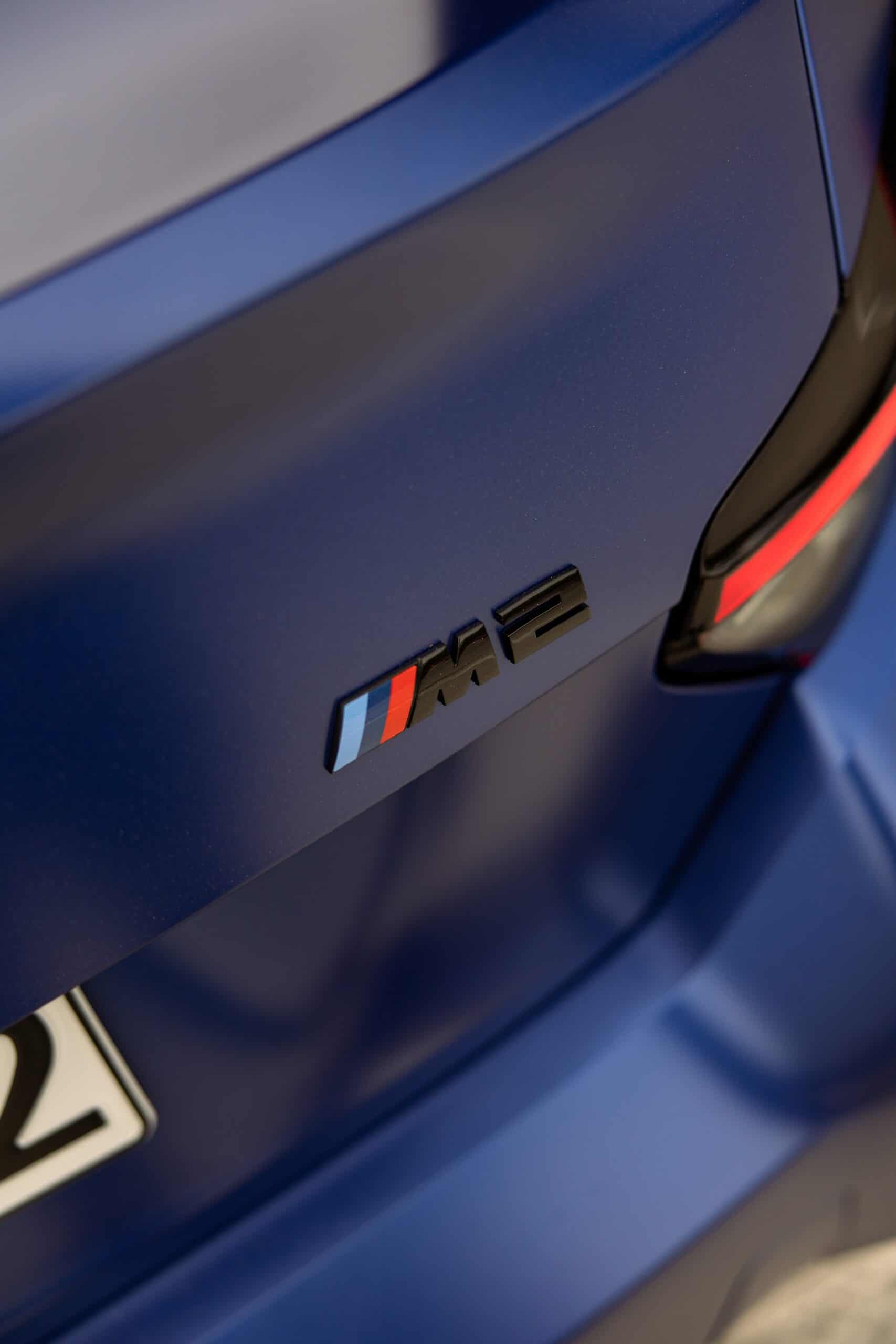 The M2 G87 has been equipped with a carbon fiber body kit featuring side spats. By far the most striking upgrade is noticeable at the rear. We’re talking about the quad exhaust system and its centrally mounted tips arranged vertically. This lighter setup is also available for the bigger M3 and M4 models where it looks just as striking. It features a titanium silencer that sheds about 8 kg (17 lbs) compared to the standard exhaust. The tailpipes boast electrically controlled flaps, ceramic coating, and a titanium trim module.