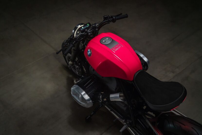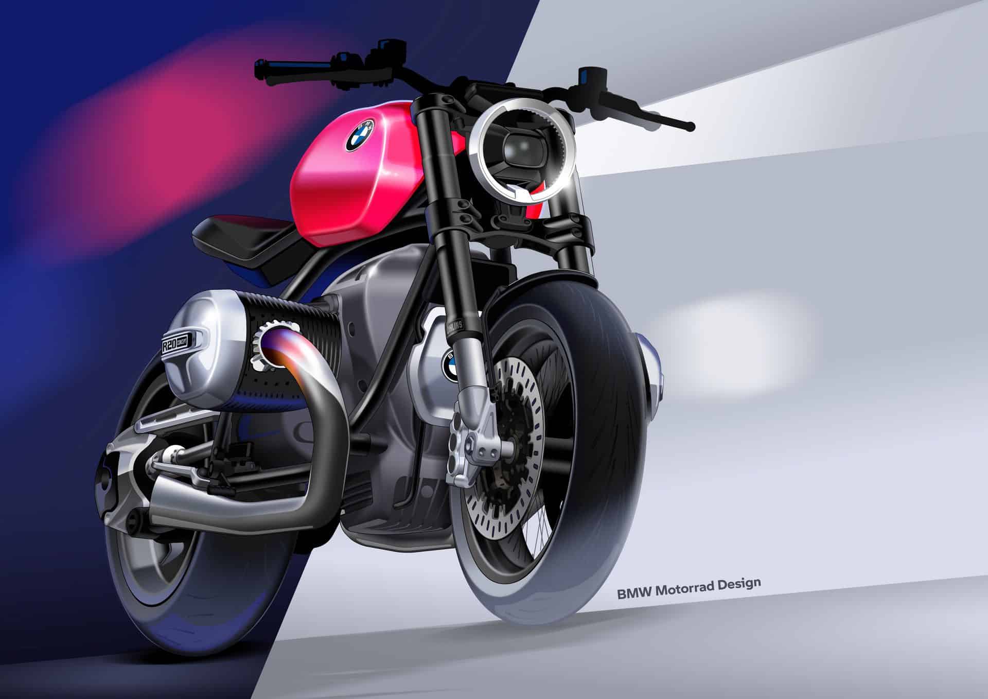 The aluminum tank has a new design in the bold “hotter than pink” color from the 1970s. The BMW R20 concept matches this with polished and anodized aluminum parts, including the cylinder head covers, belt cover, air intake funnels, Paralever strut, footrest system, and ISR brake calipers in gunmetal.