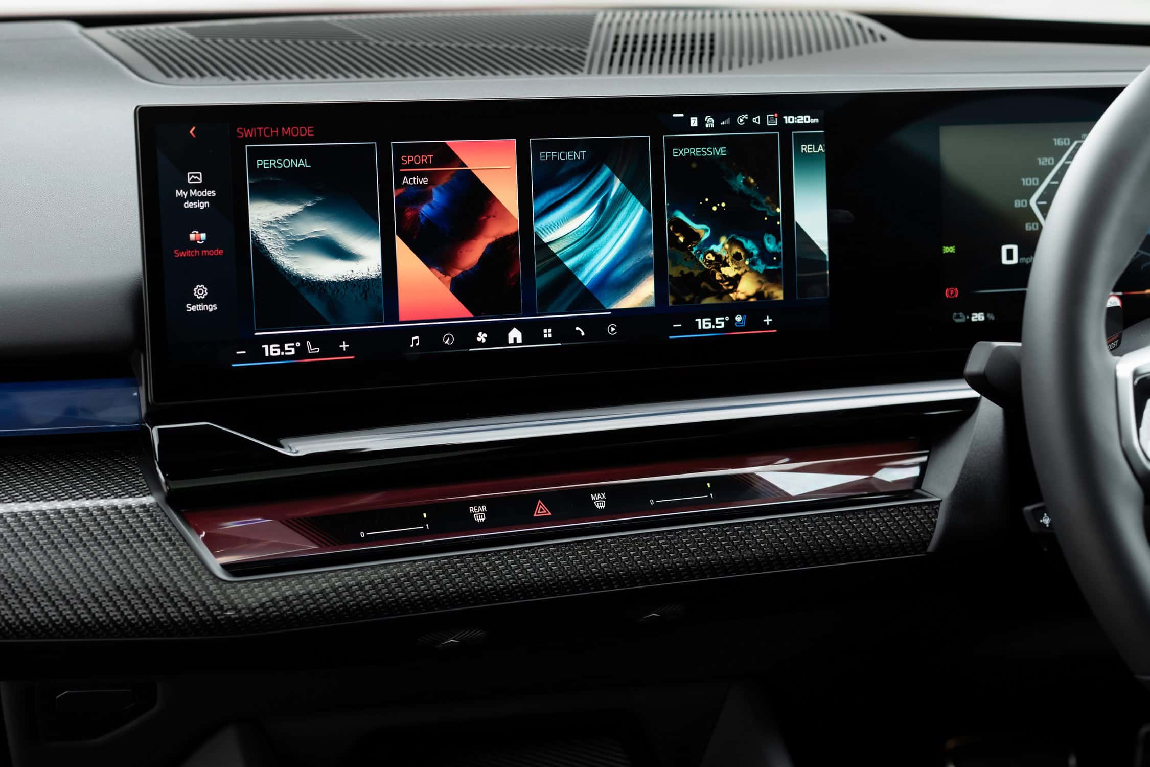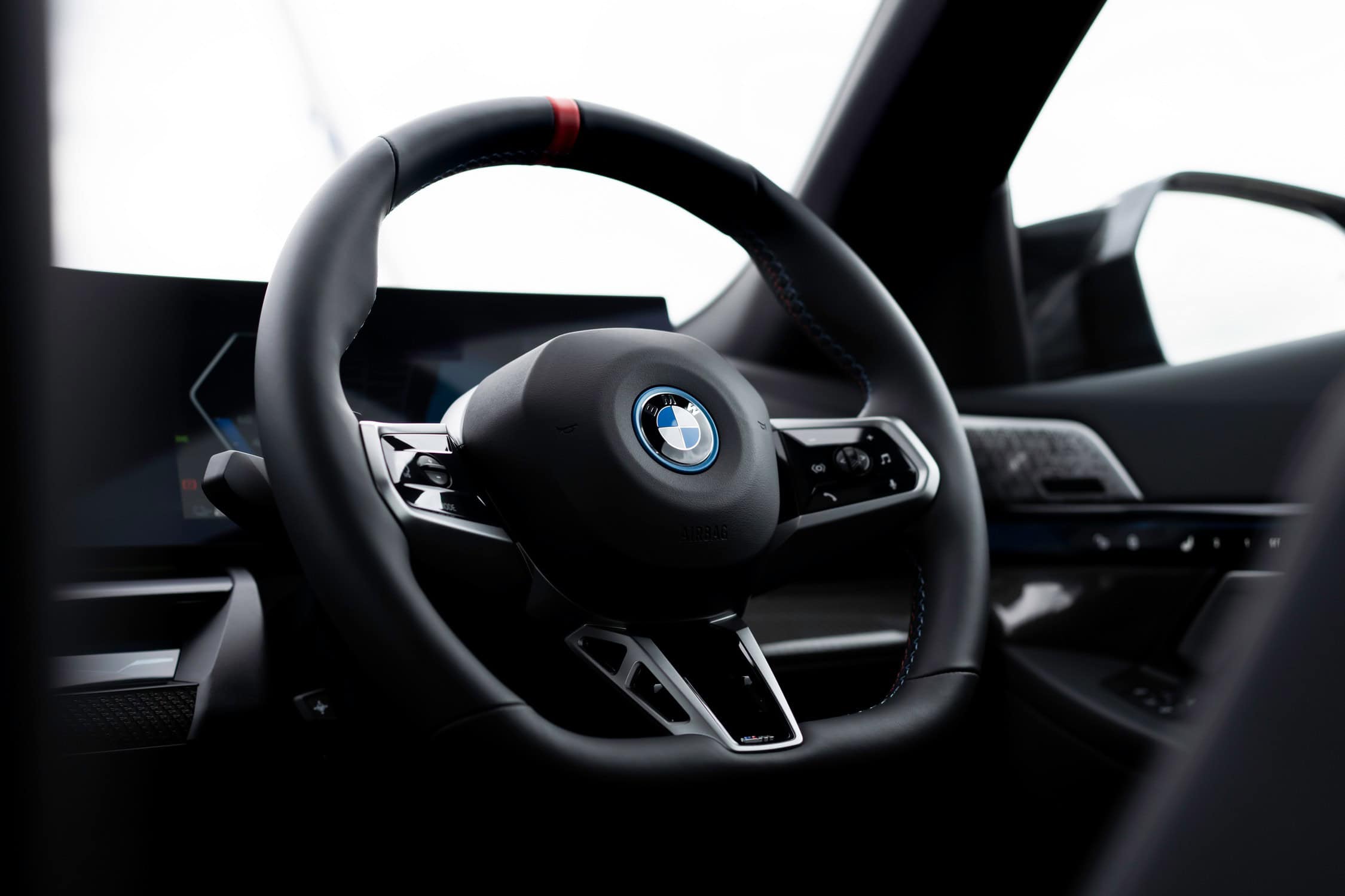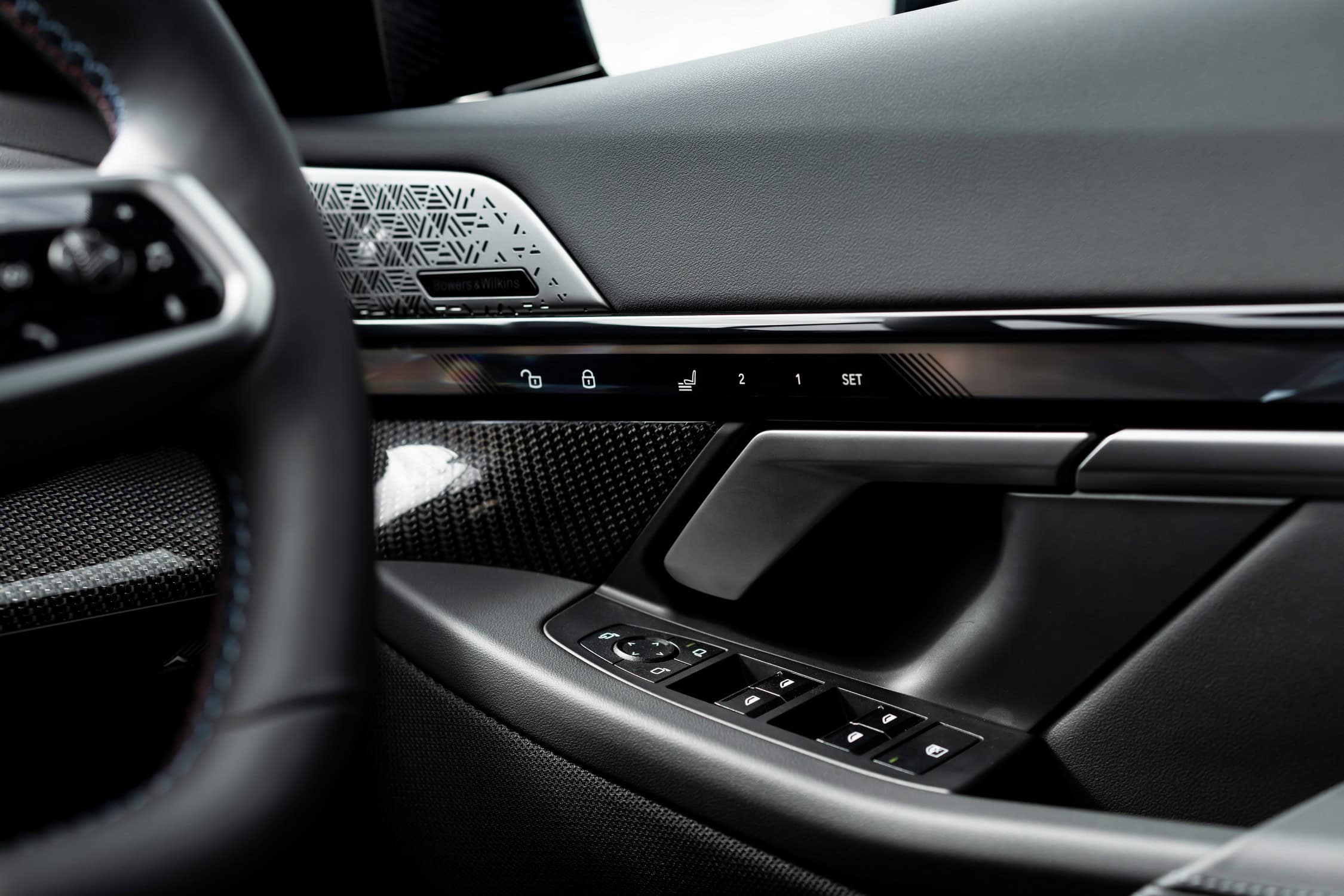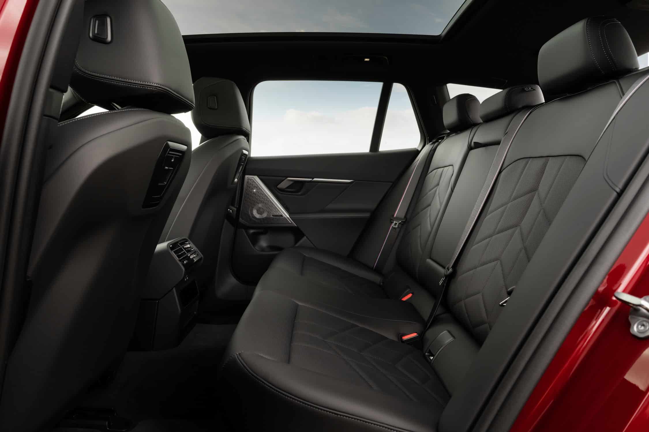 BMW UK didn’t splurge on the upholstery, deciding instead to stick to the base Veganza. This artificial leather is finished in black, but it can be had in brown or white as well. Real leather is available as an Individual upgrade for a steep £2,100. The i5 M60 can also be configured with a combination of cloth and Alcantara as a no-cost option.
