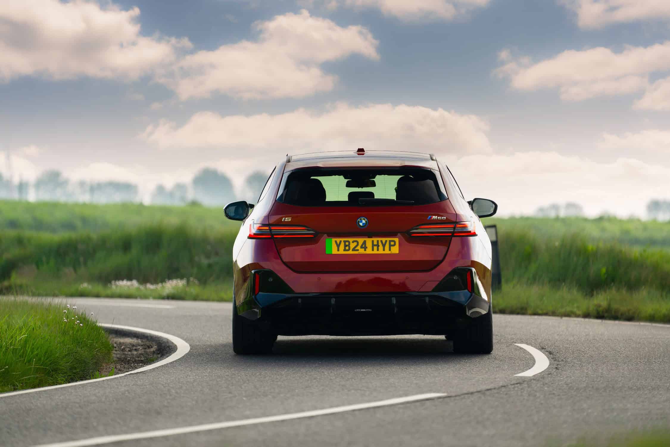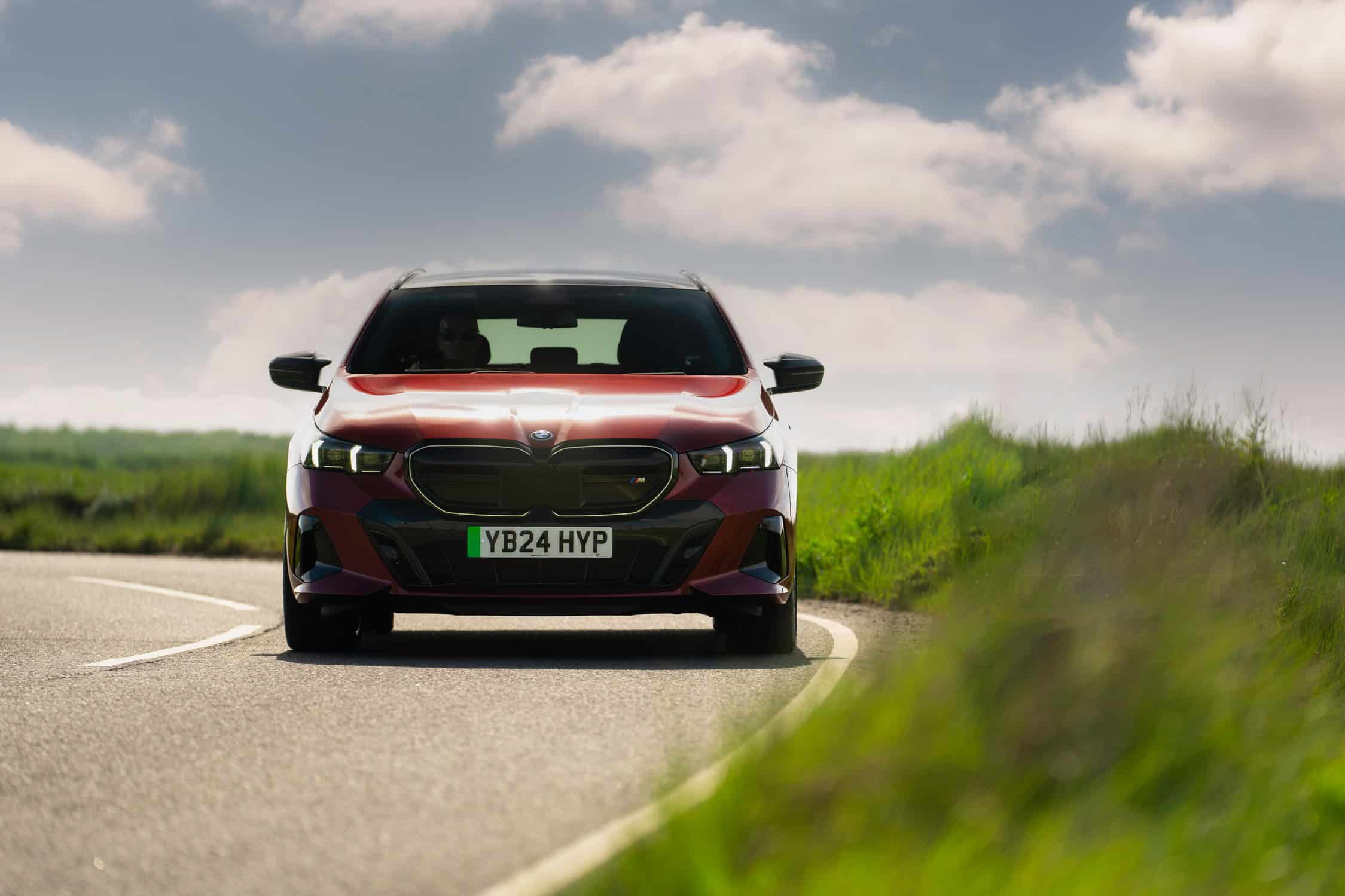 To coincide with the start of i5 Touring deliveries in the United Kingdom, BMW set up a photo shoot with the hottest G61 of them all. With no V8-powered M550i wagon this generation, the fully electric i5 M60 assumes the role of the M Lite estate. This right-hand-drive car highlighted by the automaker’s UK division wears the eye-catching Fire Red paint. In the United States, this color is marketed as Vegas Red.