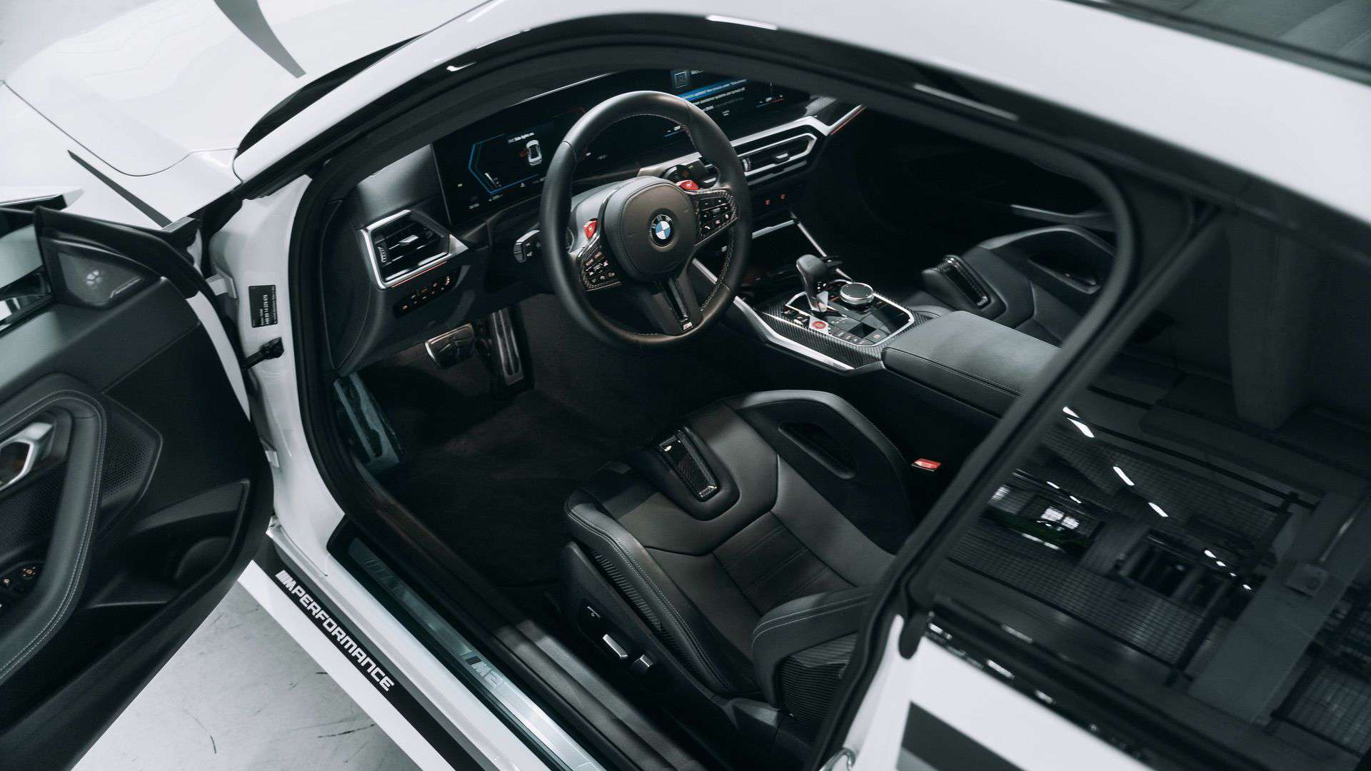 And finally, inside the interior, you can opt for a new steering wheel with a thicker rim (not a fan), Alcantara wrapping, and a red center stripe plus more carbon fiber and Alcantara trim, pedal covers, new armrest, and floor mats with unique stitching and M branding.
