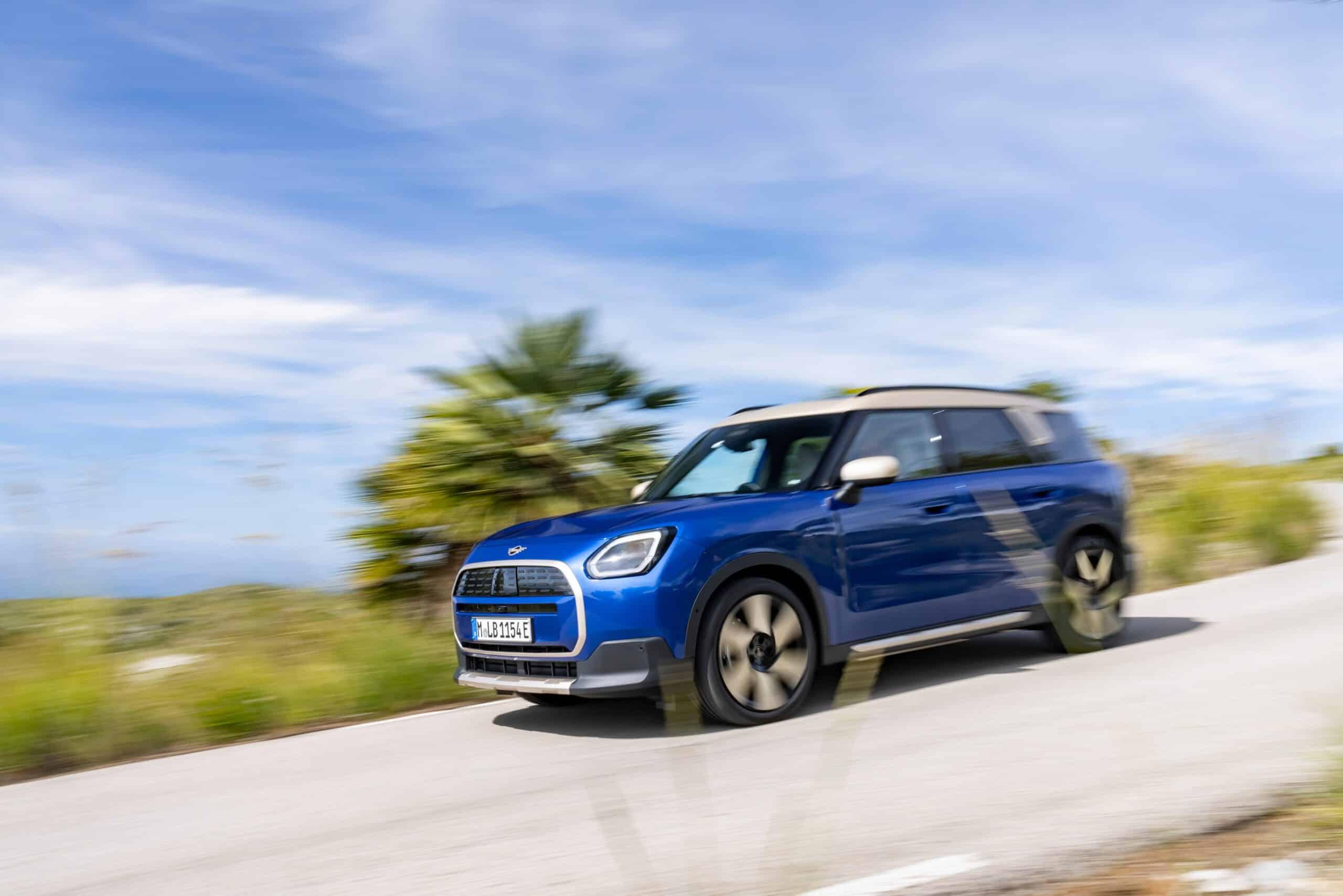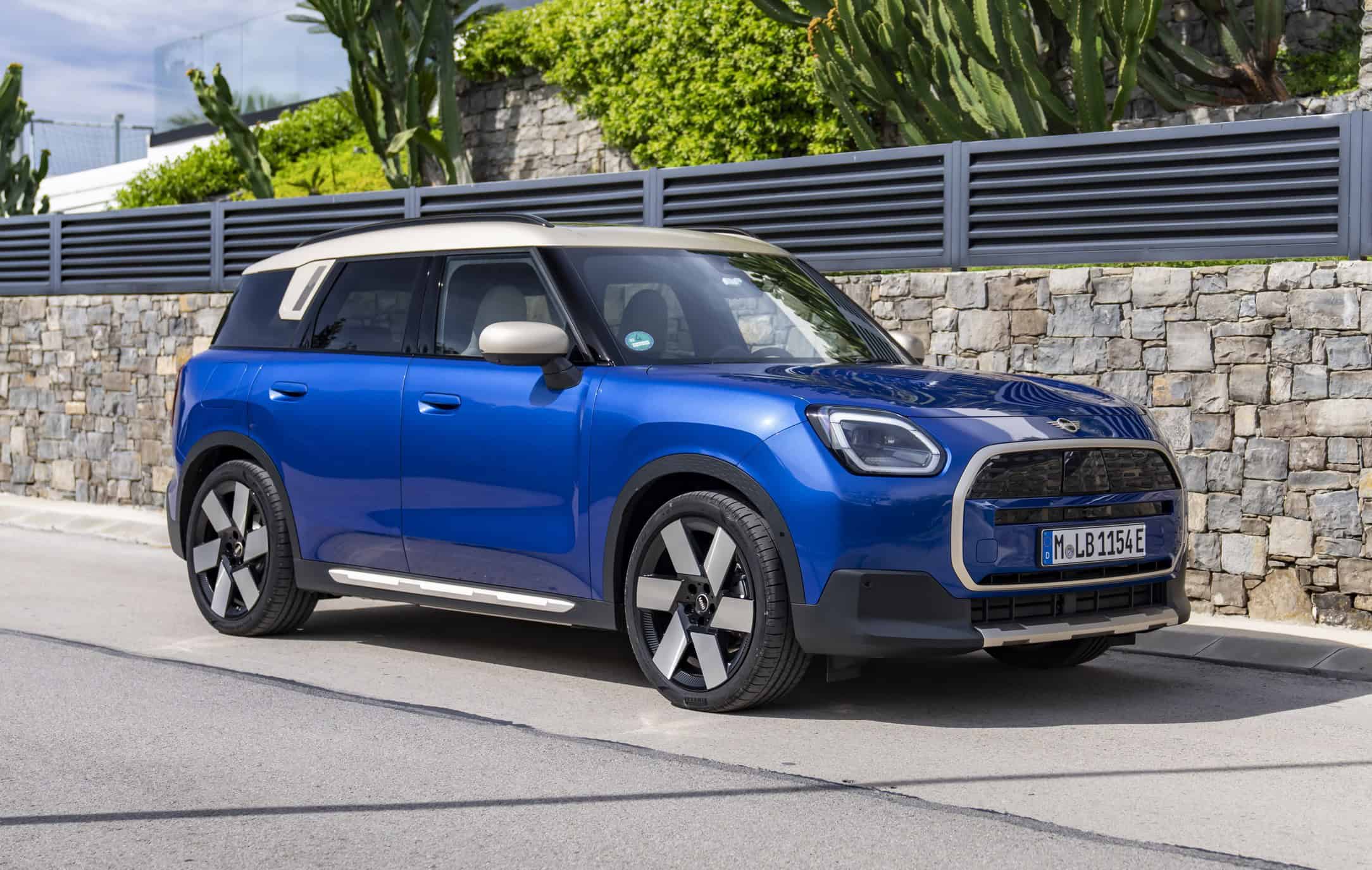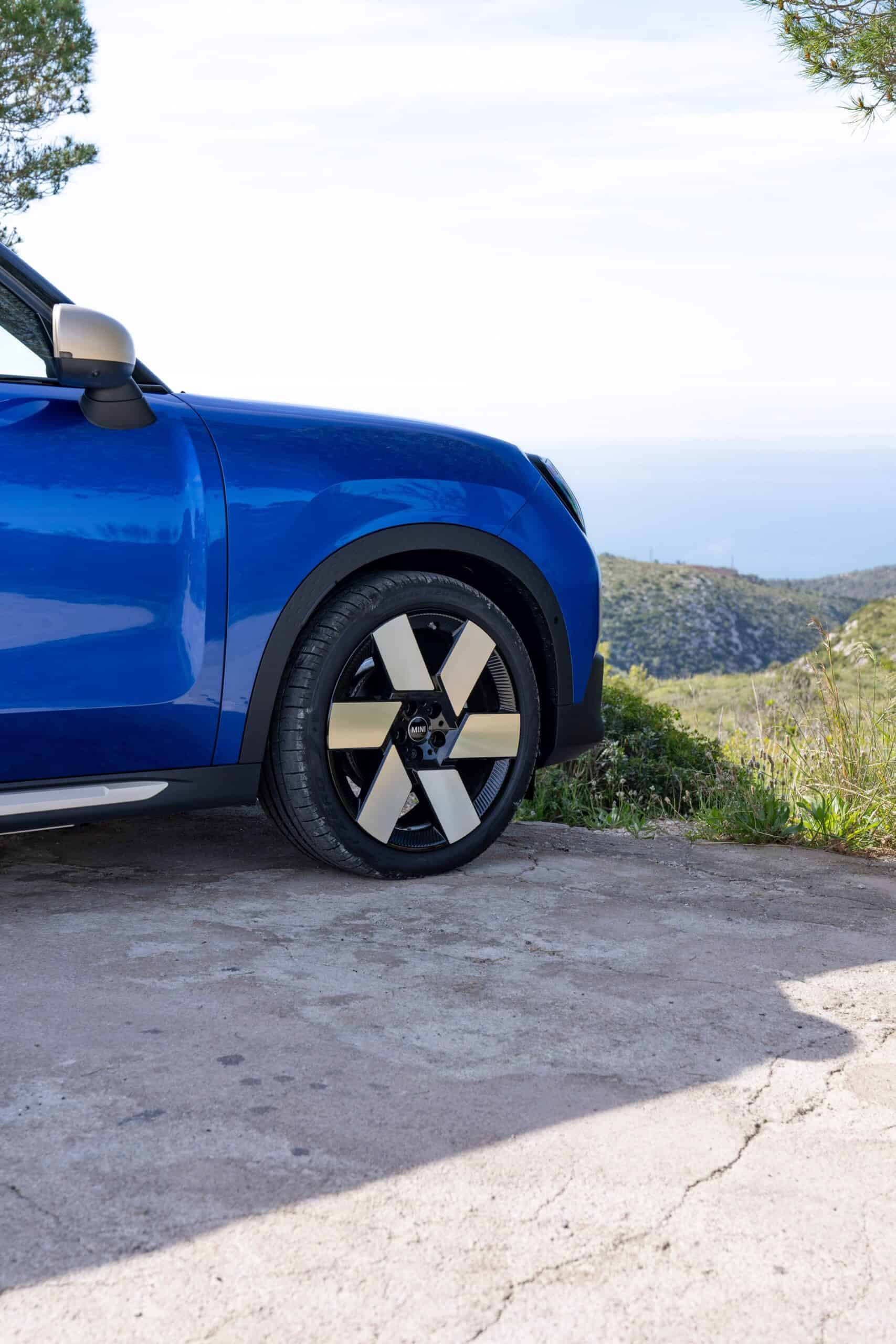 This Countryman E has been built in the Favoured Trim with Blazing Blue paint and optional Vibrant Silver accents. Because the latest generation has gotten so big, those massive 20-inch wheels with a windmill design don’t look out of place. Yes, you can get a MINI in 2024 with 20-inch alloys from the factory. If that’s too much, the Oxford-based brand also offers 17- to 19-inch wheels in multiple designs.