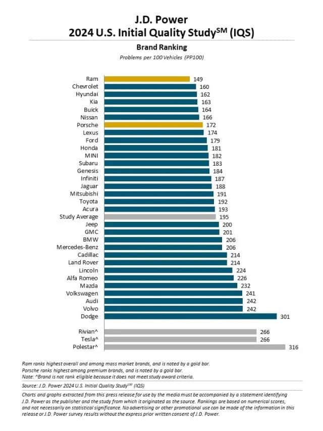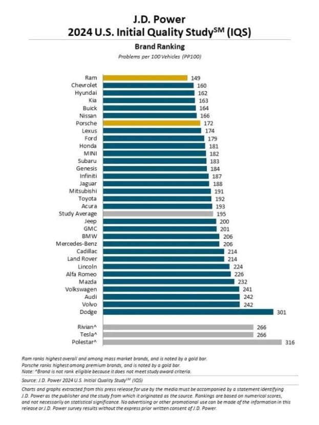 It’s safe to say that reliability has never been the strong point of luxury cars. J.D. Power’s 2024 U.S. Initial Quality Study is a relevant example considering there aren’t any premium brands in the top 4. With 149 problems reported per 100 vehicles, Ram tops the rankings, followed by Chevrolet with 160, Hyundai with 162, and sister brand Kia with 163. Buick rounds off the top 5 as the leader among luxury brands.