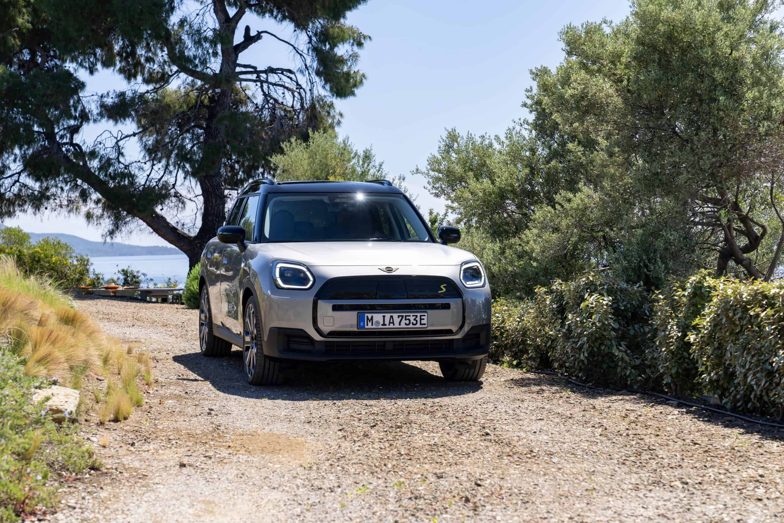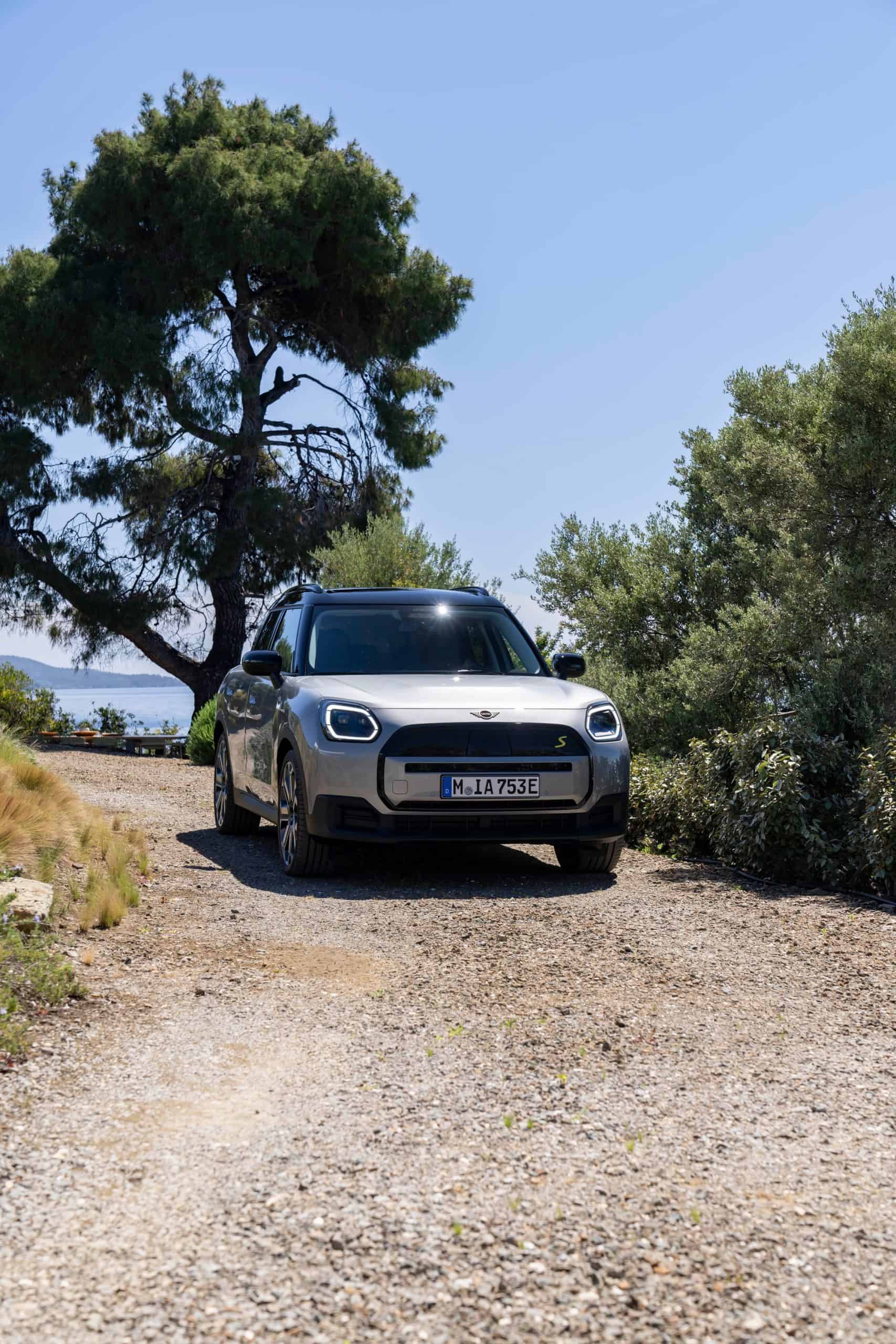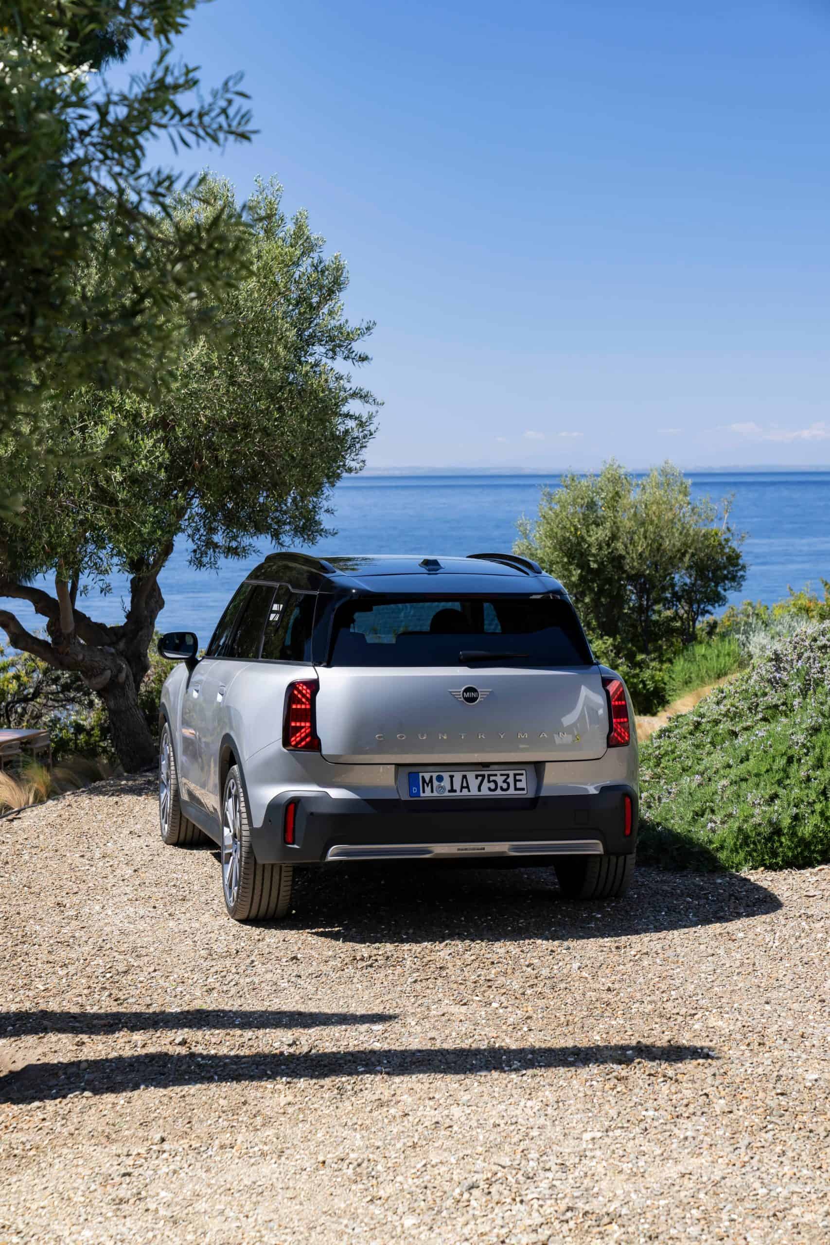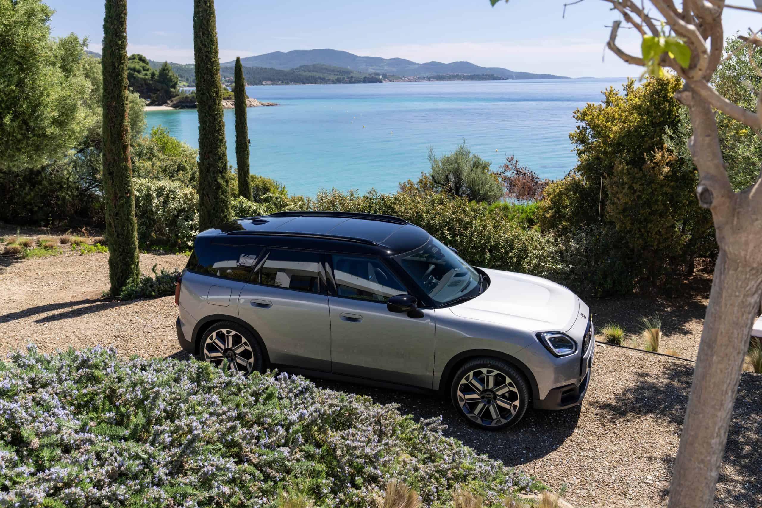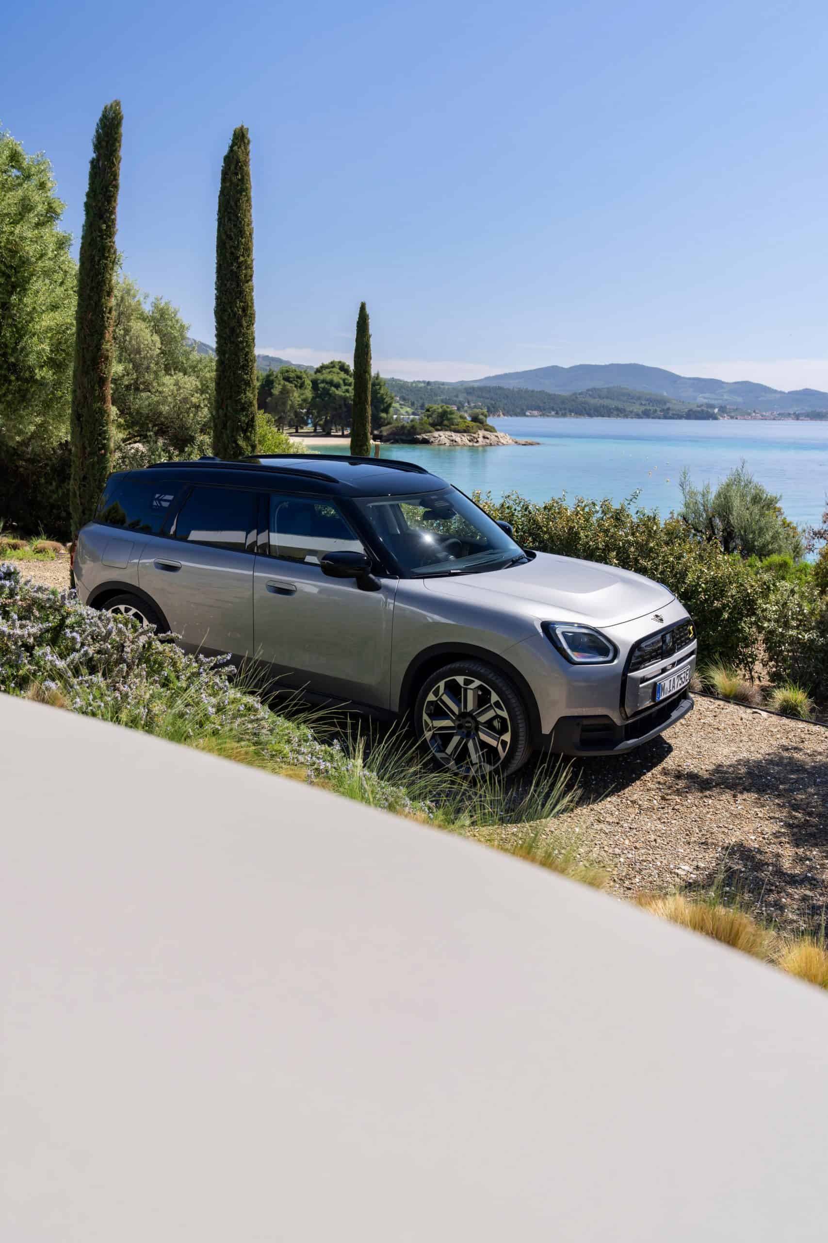 Seen here is the not-so-mini crossover in the Classic Trim with Melting Silver paint and a black panoramic glass roof. MINI opted for the larger 18-inch Asteroid Spoke wheels to show off the Countryman SE ALL4 in sunny Greece. We would’ve opted for a vibrant color such as British Racing Green but this silver is perhaps a more sensible choice.