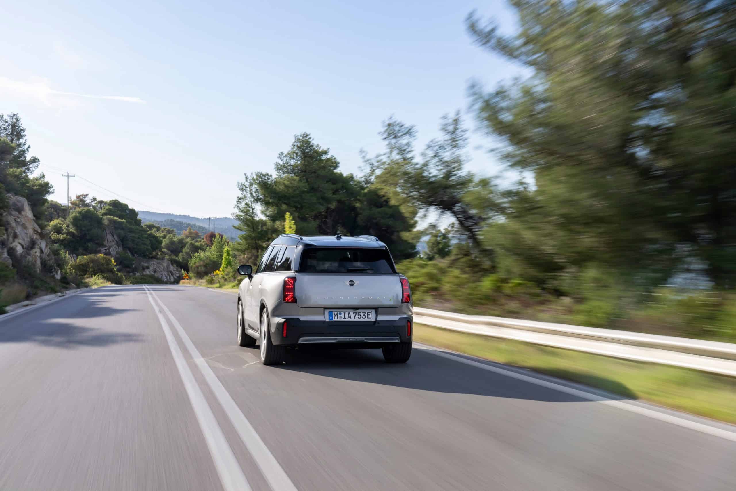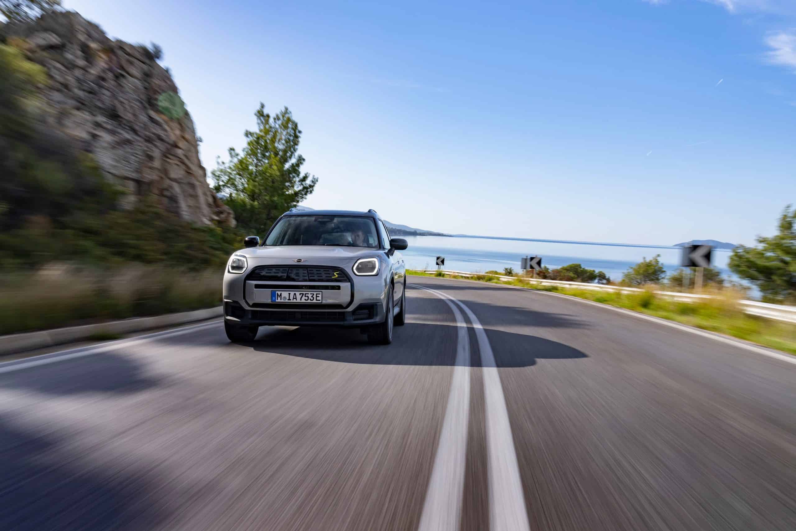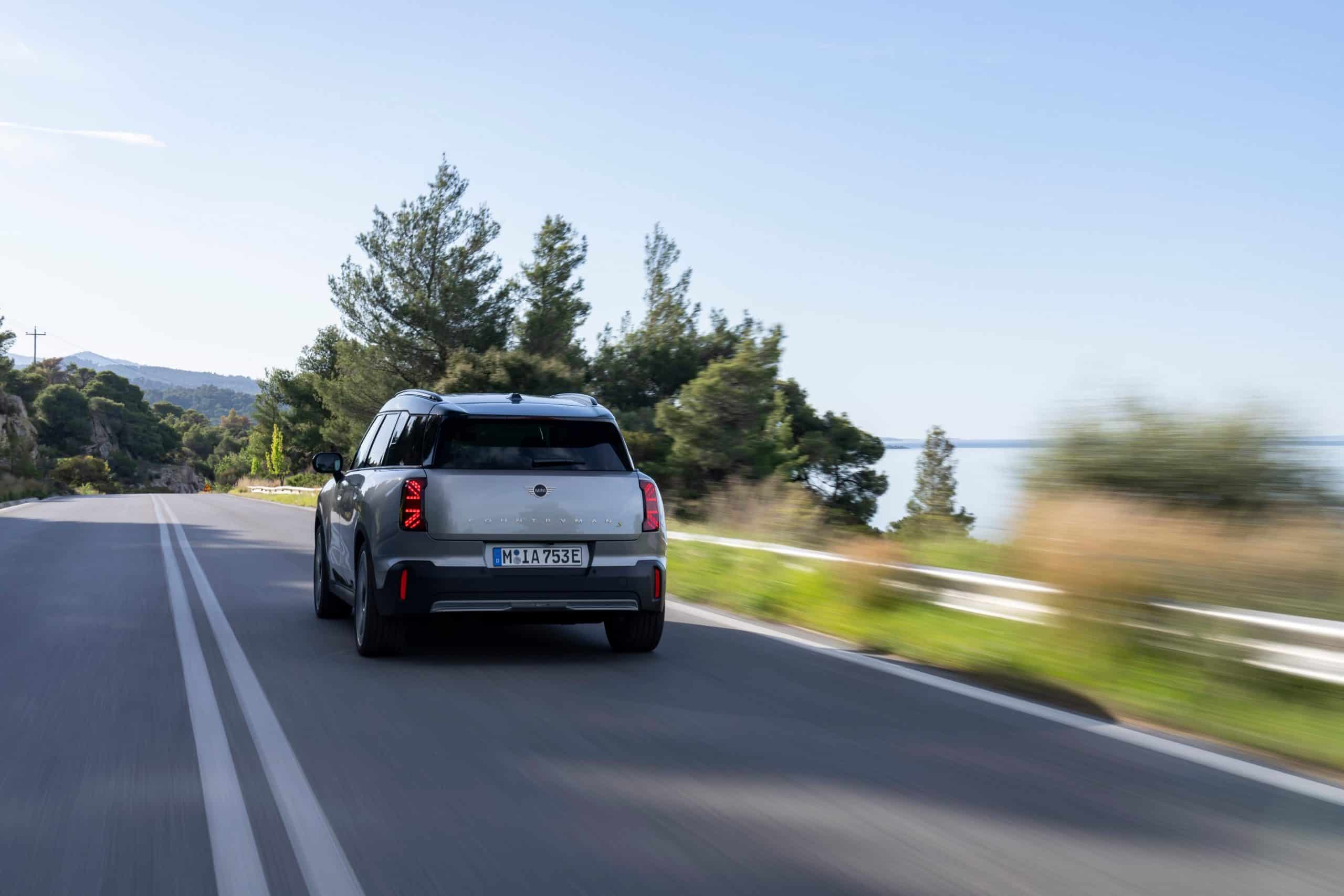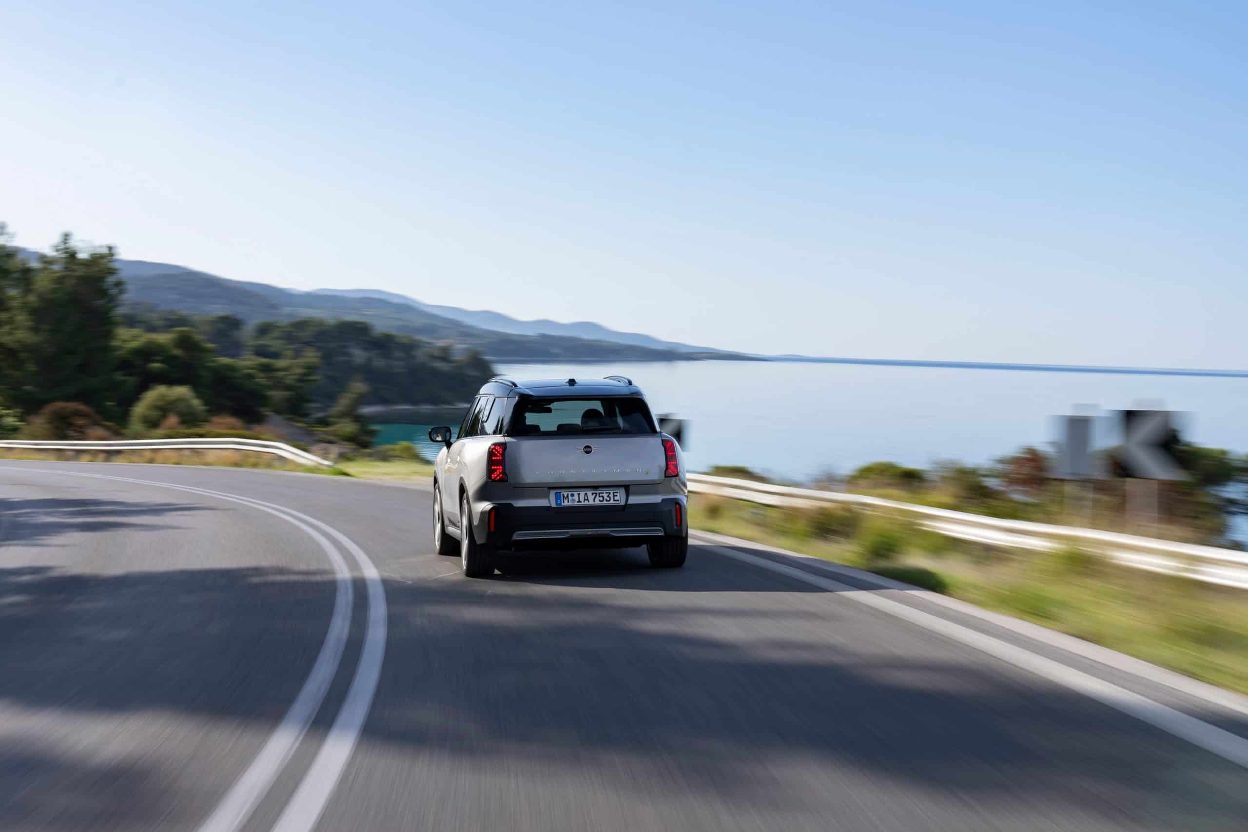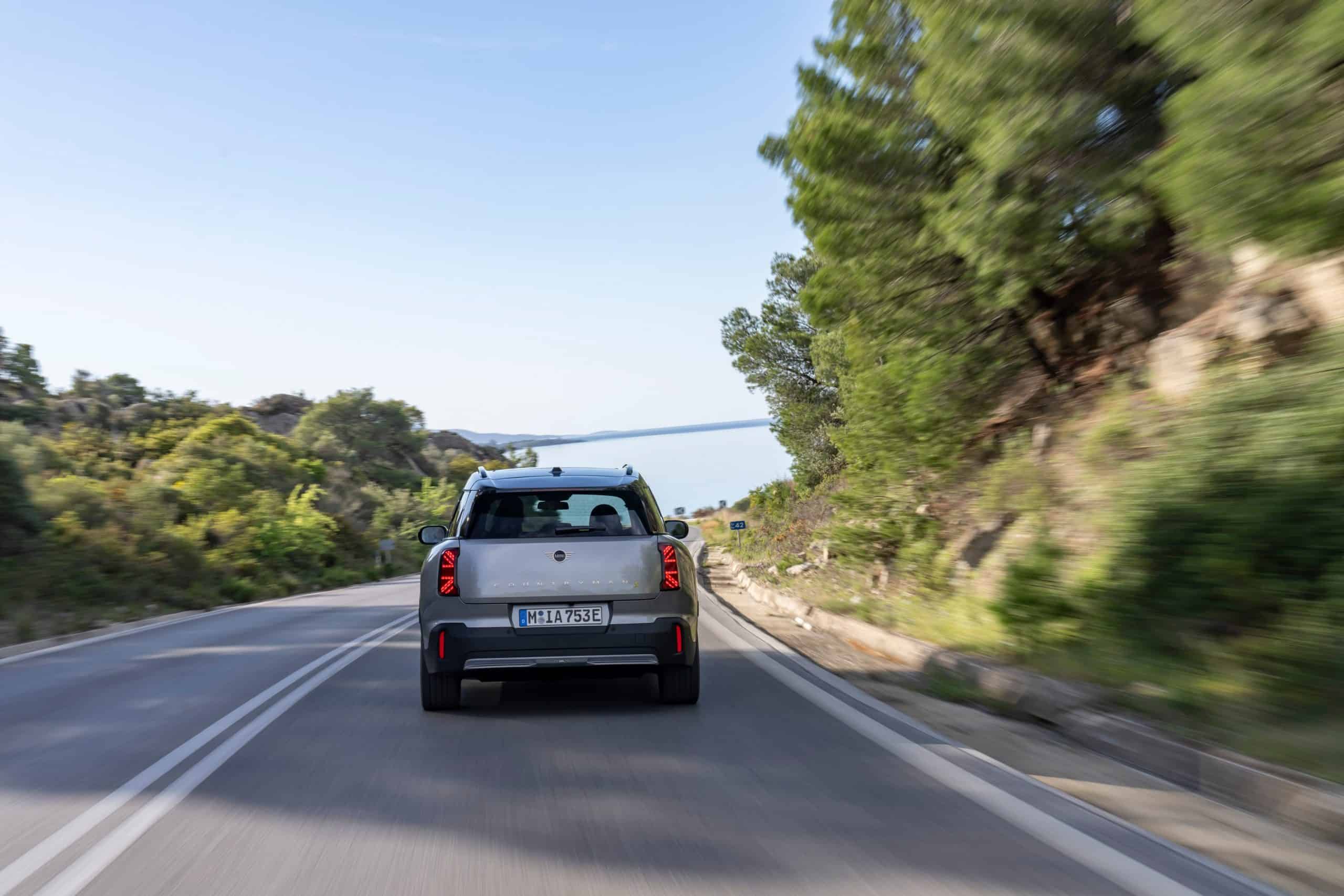 Seen here is the not-so-mini crossover in the Classic Trim with Melting Silver paint and a black panoramic glass roof. MINI opted for the larger 18-inch Asteroid Spoke wheels to show off the Countryman SE ALL4 in sunny Greece. We would’ve opted for a vibrant color such as British Racing Green but this silver is perhaps a more sensible choice.