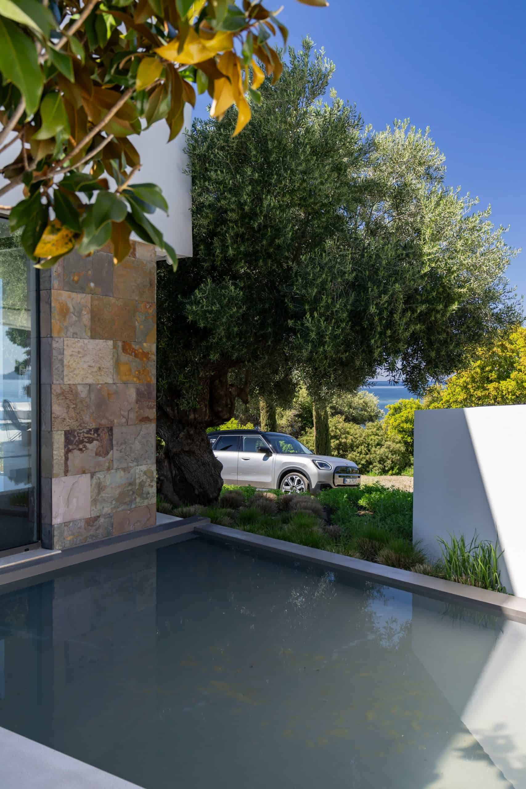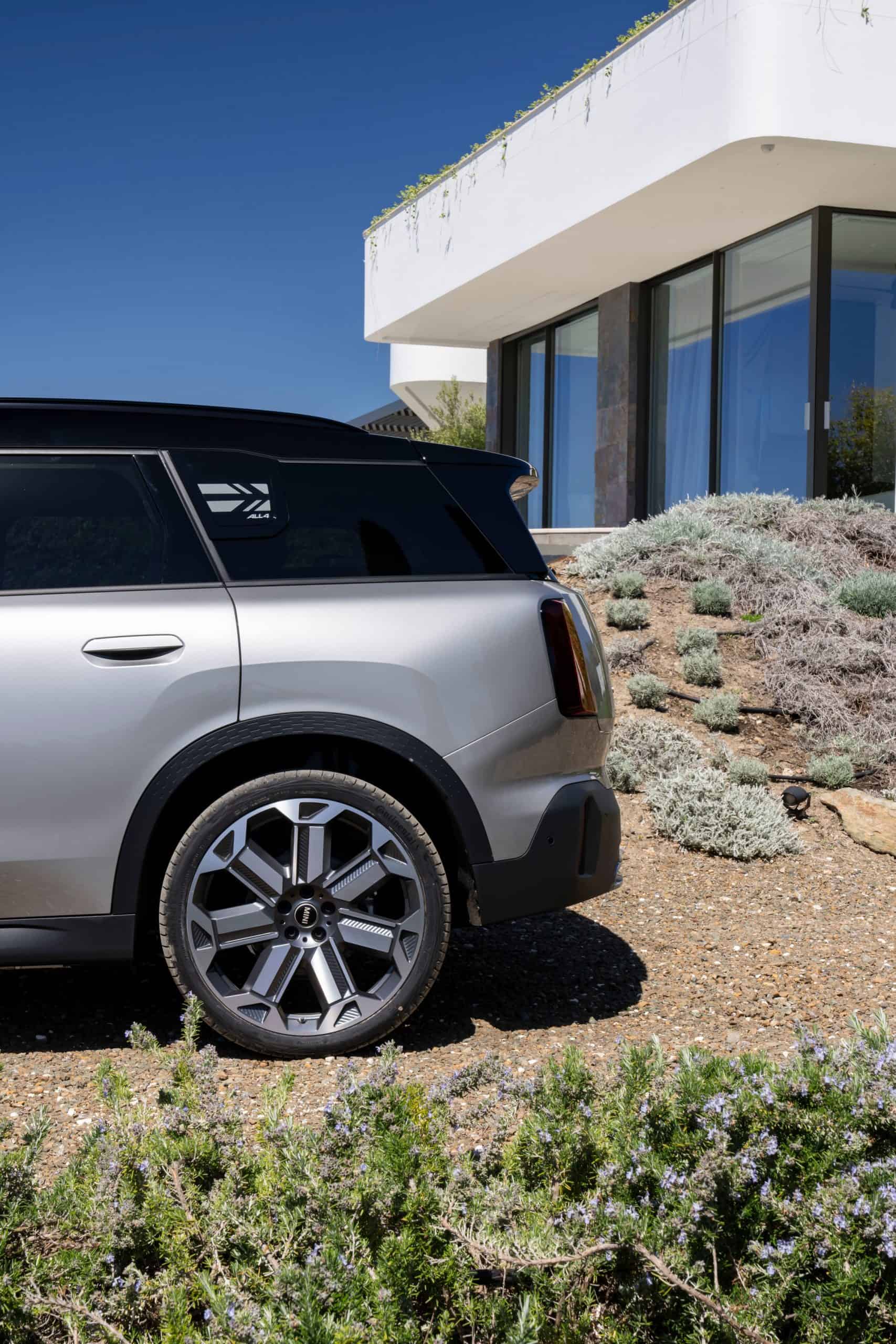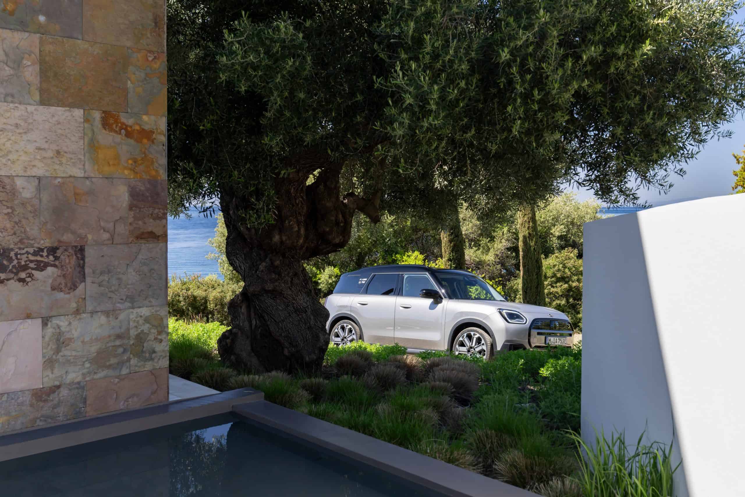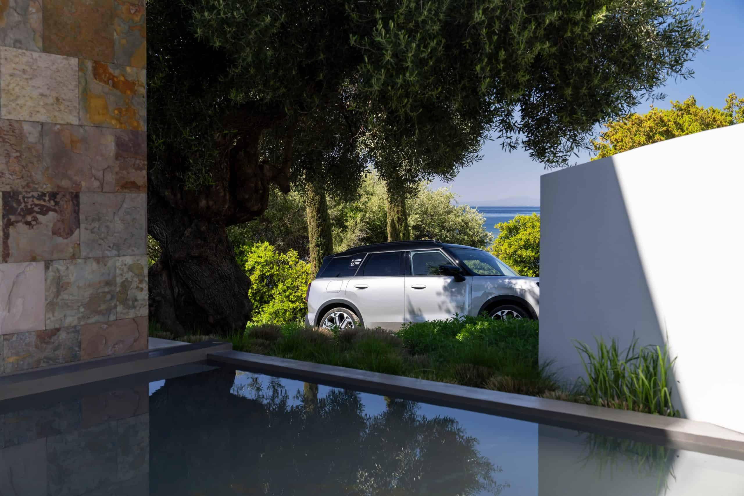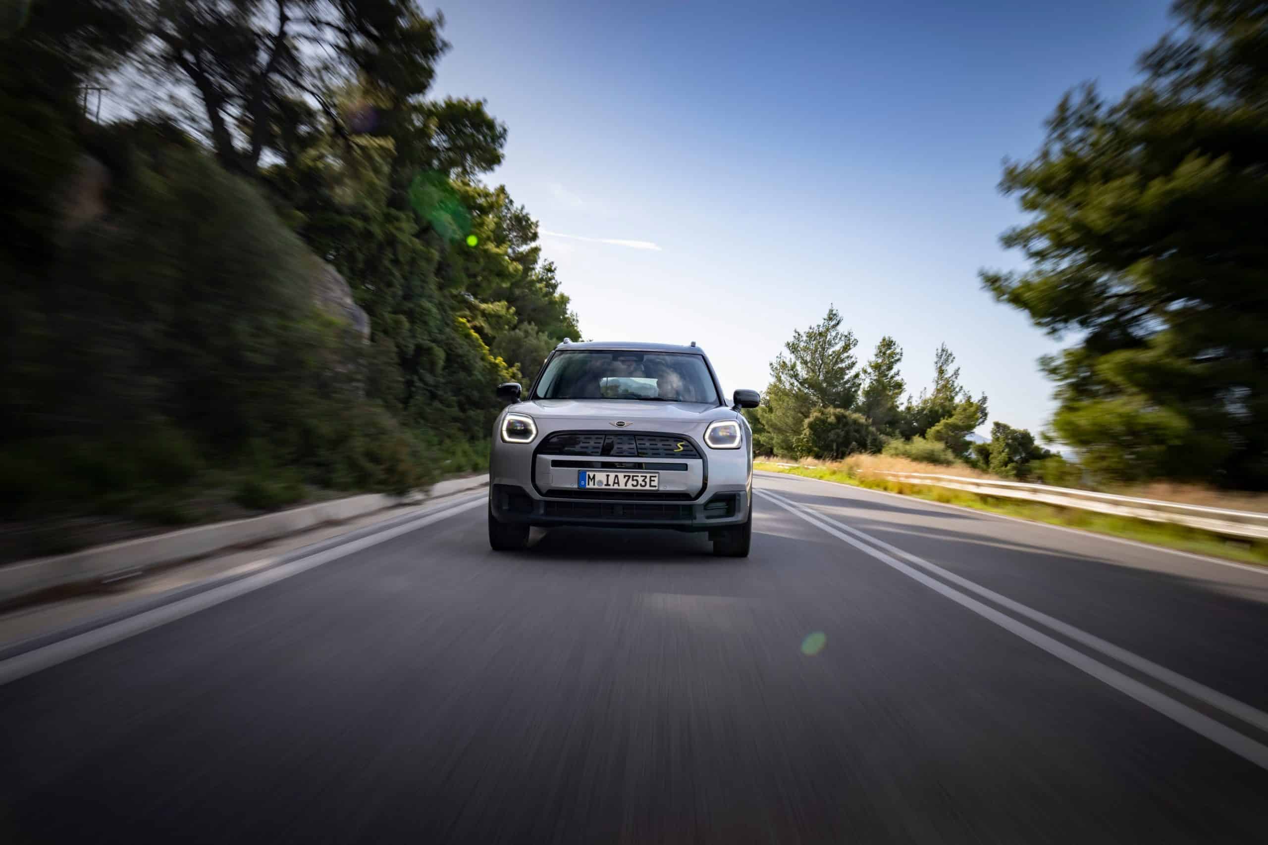 Seen here is the not-so-mini crossover in the Classic Trim with Melting Silver paint and a black panoramic glass roof. MINI opted for the larger 18-inch Asteroid Spoke wheels to show off the Countryman SE ALL4 in sunny Greece. We would’ve opted for a vibrant color such as British Racing Green but this silver is perhaps a more sensible choice.