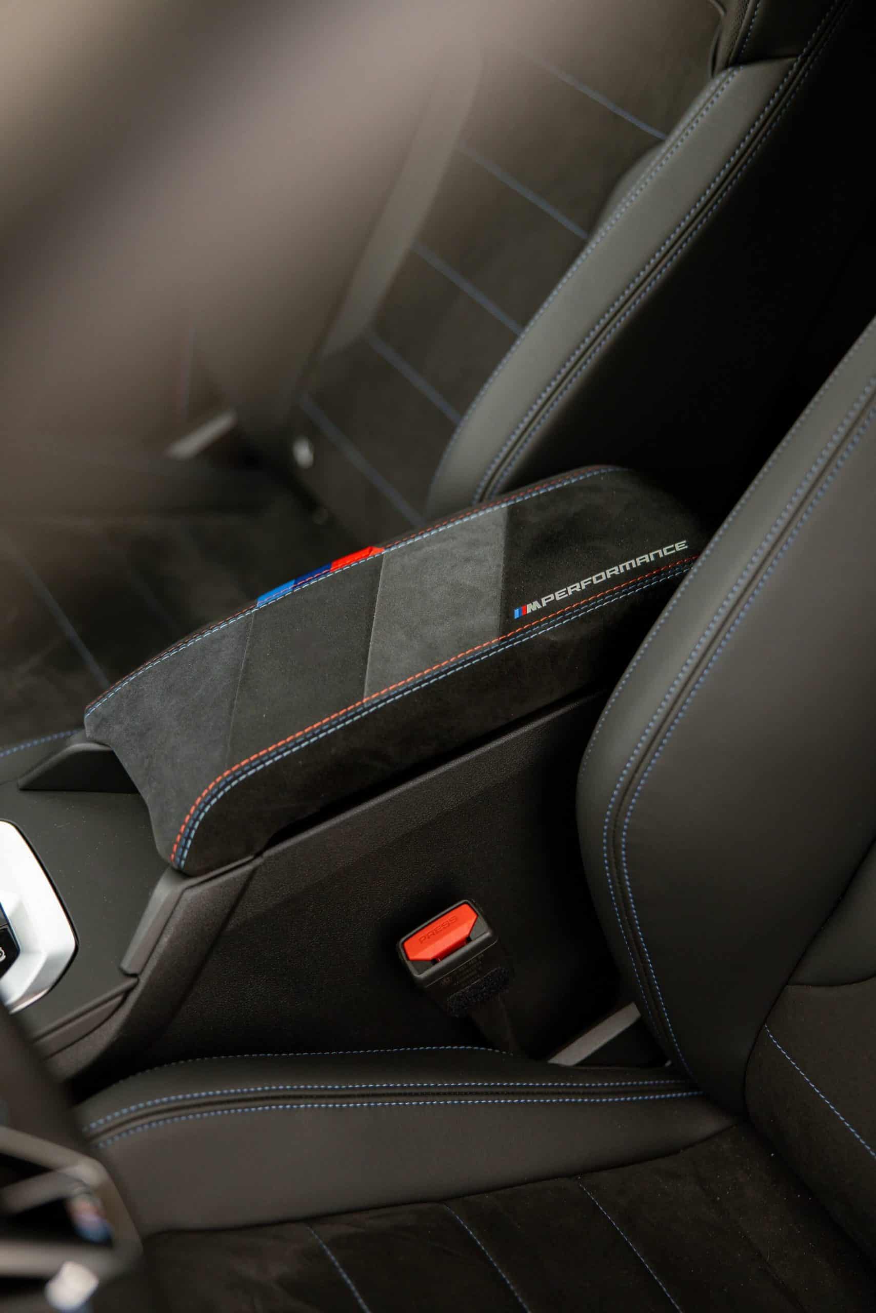 One questionable change is at the front where we’d honestly do without those glossy black add-on pieces. Perhaps the intent is to mimic canards but we’re not fans of those inserts. Extending to the sides of the car, the front spoiler lip is another upgrade from the M Performances Parts catalog. Rounding off the changes on the outside are the carbon shark fin antenna, chunkier side skirts, and branded decals. Oh, there’s also a red tow strap with M branding, of course.