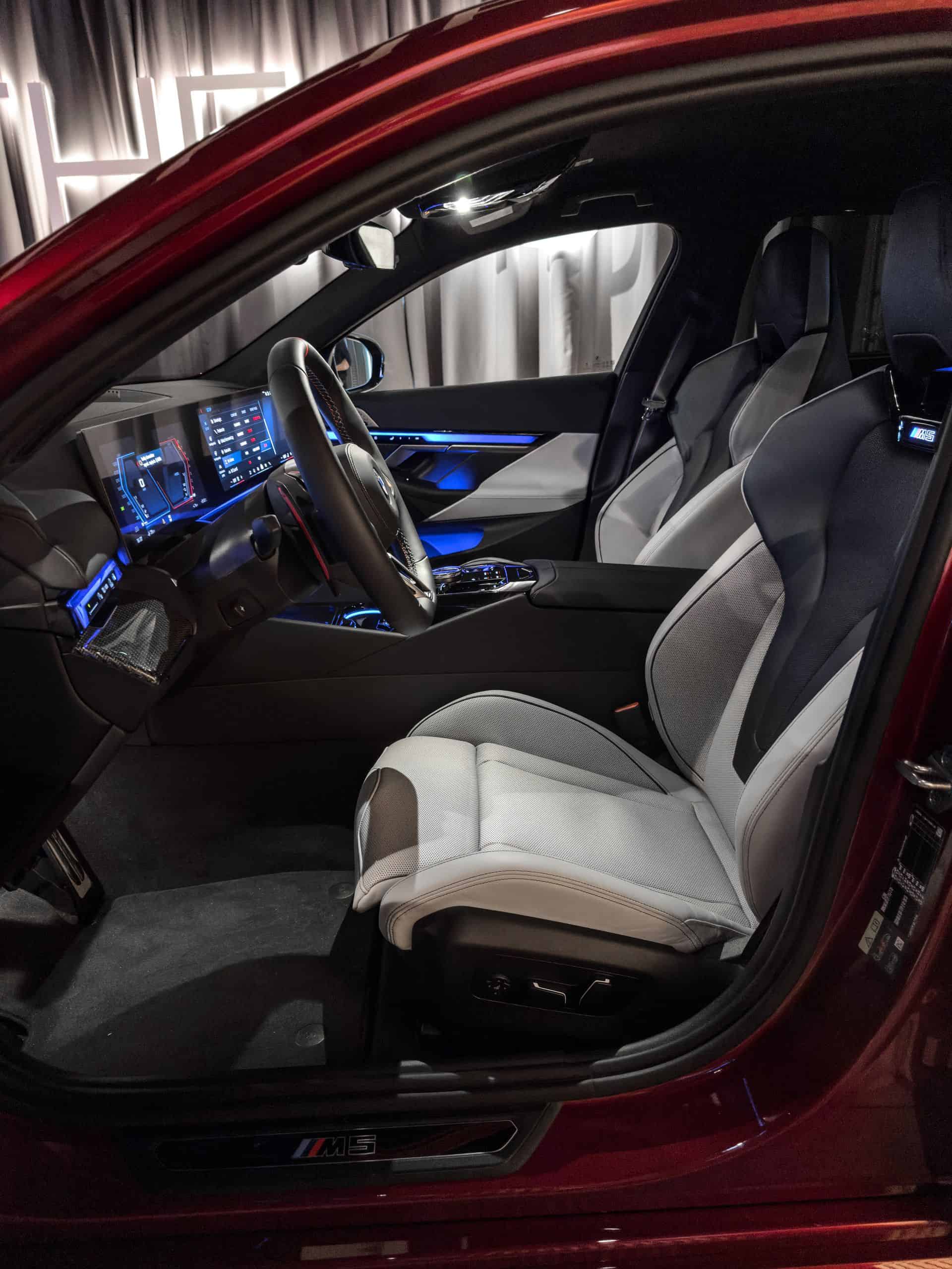 It’s safe to say this 2025 M5 has a daring spec given the combination between Silverstone and Black Merino leather. For the dashboard, BMW opted for a carbon fiber trim with a high-gloss finish. In case you haven’t noticed, the G90 is the first M product with a small gear selector. Right next to it is an M-branded rotary knob for the iDrive controller we don’t remember seeing before.