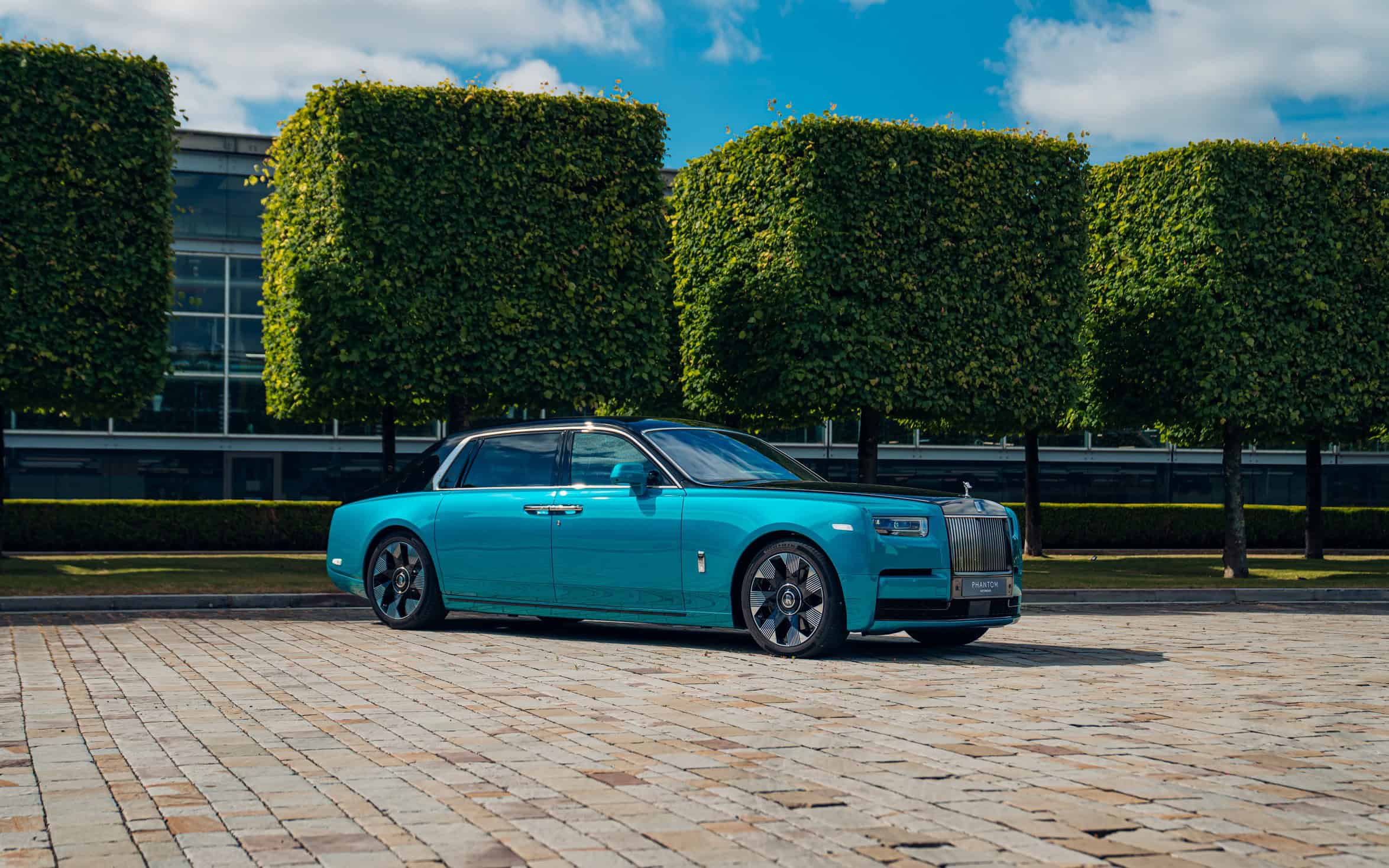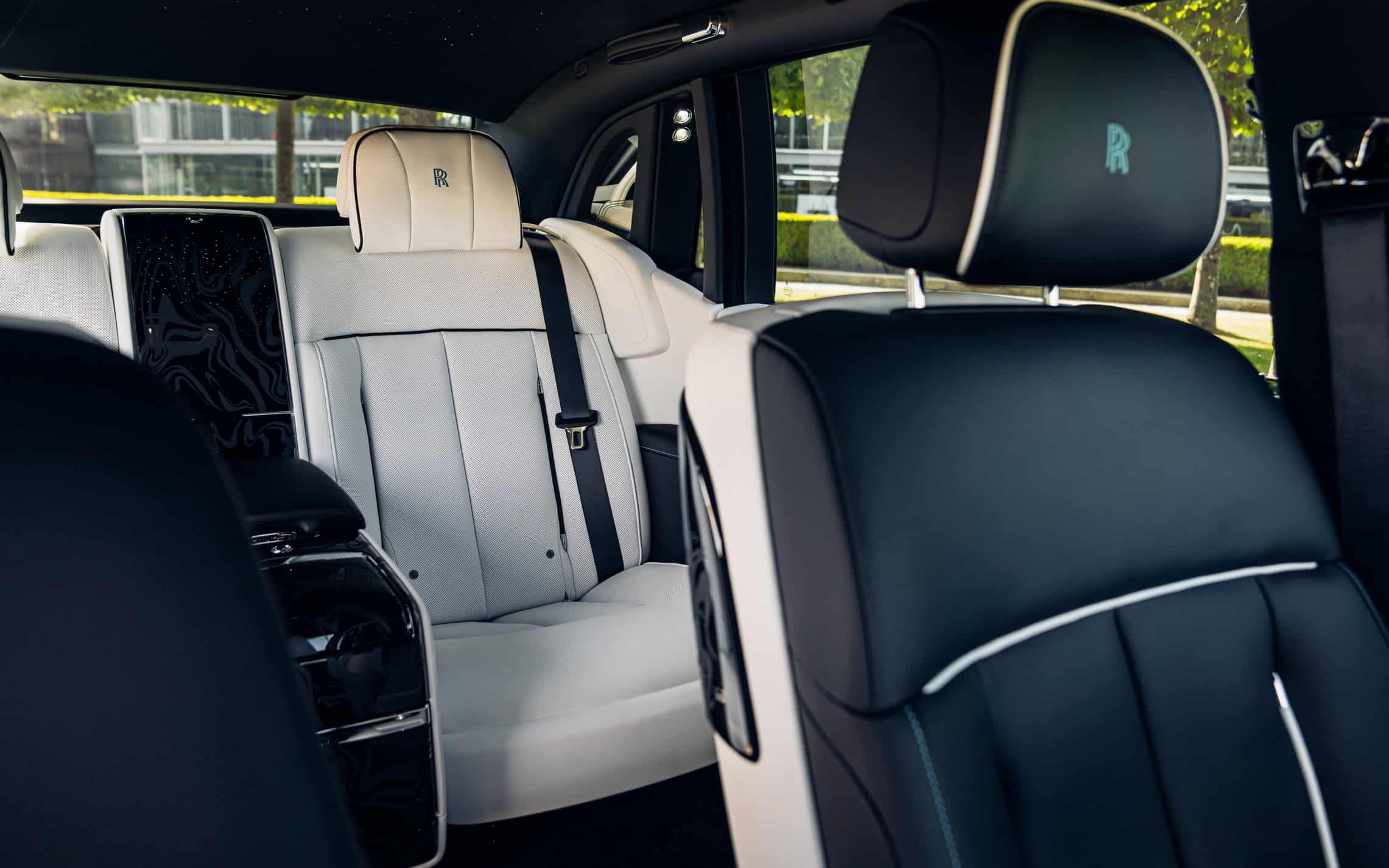 The unique cars are based on all four model lines: Ghost, Phantom, Cullinan, and Spectre. The smaller of the two sedans carrying the Spirit of Ecstasy statuette has a classy look with a Blue Crystal finish complimented by a subtle Charles Blue coachline. As for the flagship model, it’s based on the long-wheelbase Extended model with a two-tone Diba Teal and Black Diamond paint scheme combined with a black coachline.