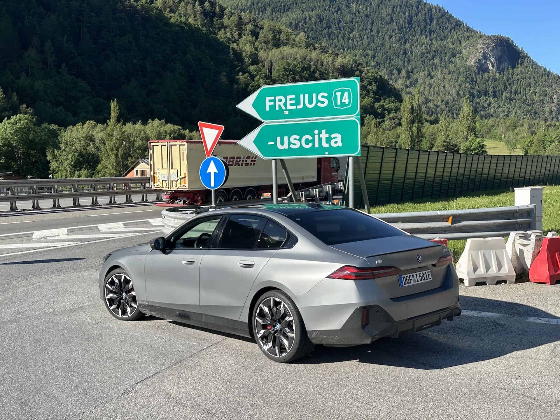 The BMW i5 M60 excels on long journeys. The seats are top-notch, space is ample, and the noise level is low even without insulating glass. The two displays are sharp but could be larger compared to competitors, and there’s no passenger screen. On country roads, the nearly 2.4-ton all-wheel-drive vehicle performs admirably. The precise steering and low center of gravity are pleasing in tight bends, and the brakes transition smoothly from recuperation to disc brakes. Navigation, handling, and comfort in city centers like Milan and Turin are excellent. The car refuels a few kilowatts of power here and there before heading over the Alps towards France. The customs officer at the border tunnel inspects the gray i5 extensively but allows passage.