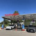The A43 highway on the French side is faster than German highways with fewer roadworks. The switch to France highlights better electromobility infrastructure. Clean, bright, and well-maintained fast chargers are at every service station. The i5 charges efficiently while the driver snacks or relaxes. However, the on-board computer never shows a range of 400 km or more. At the hotel stop in Clermont-Ferrand, the 22 kW charging option at the hotel charges 67 kWh in three hours and eleven minutes for 40.04 euros, providing only 229 miles / 367 km range.