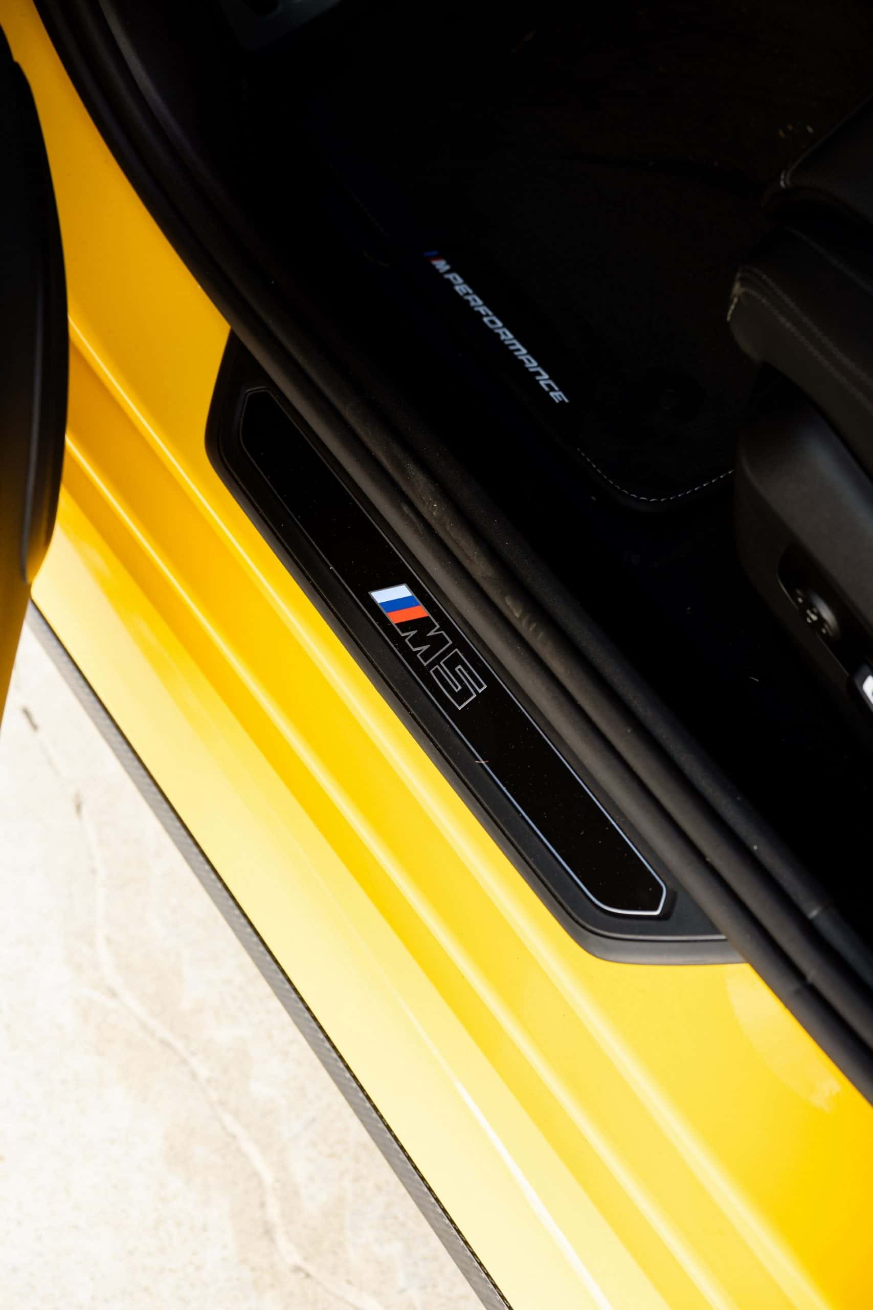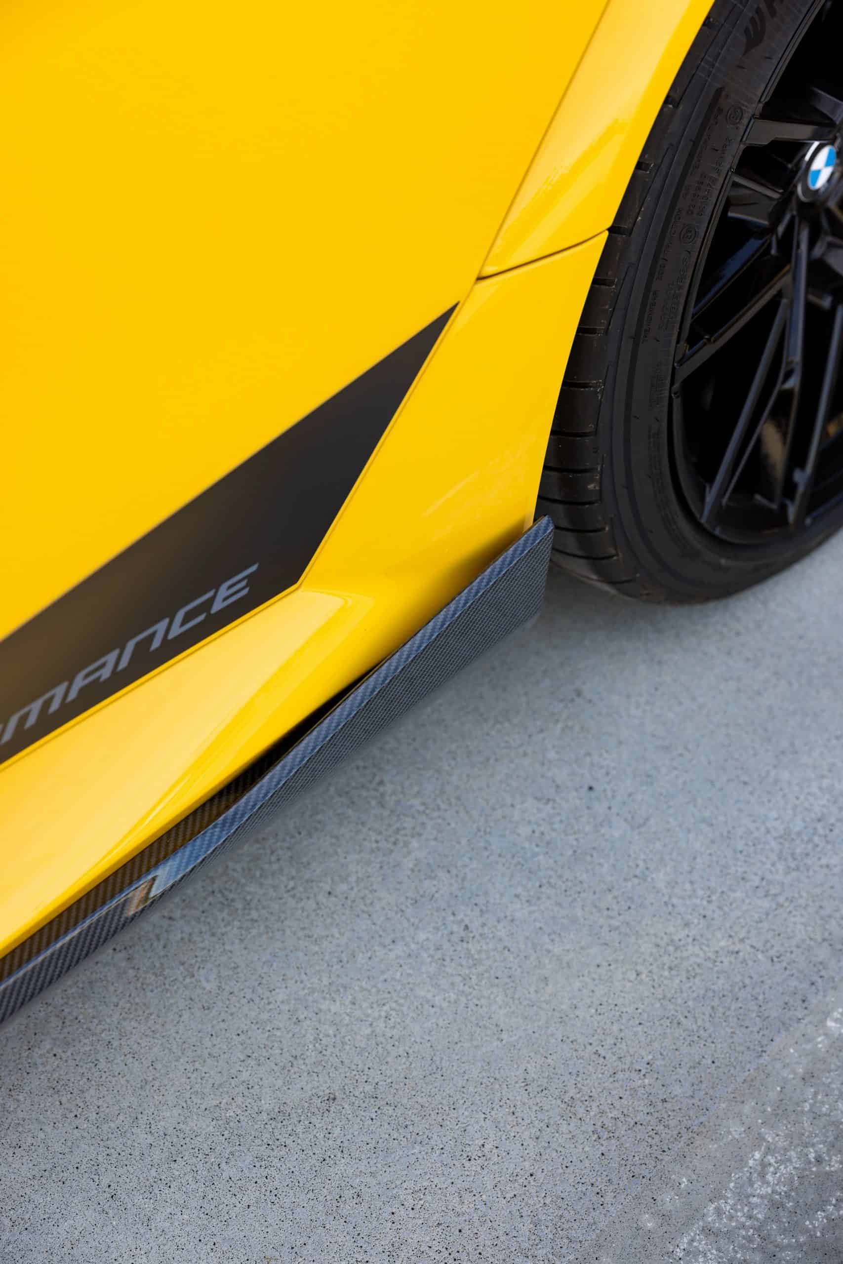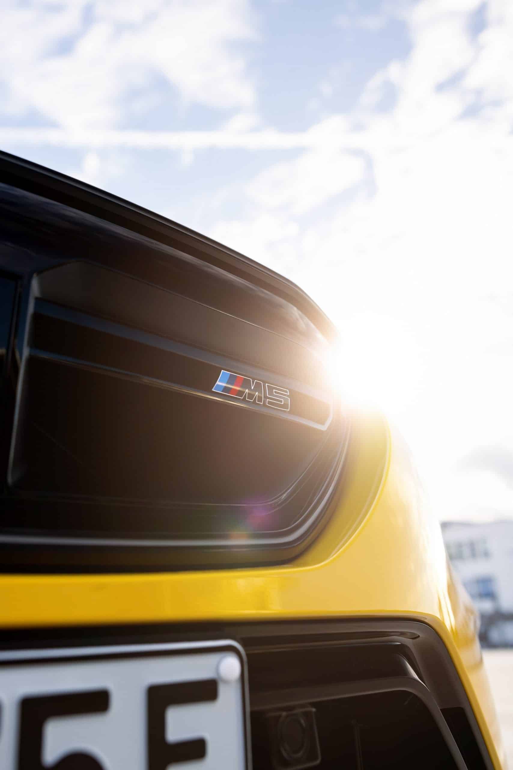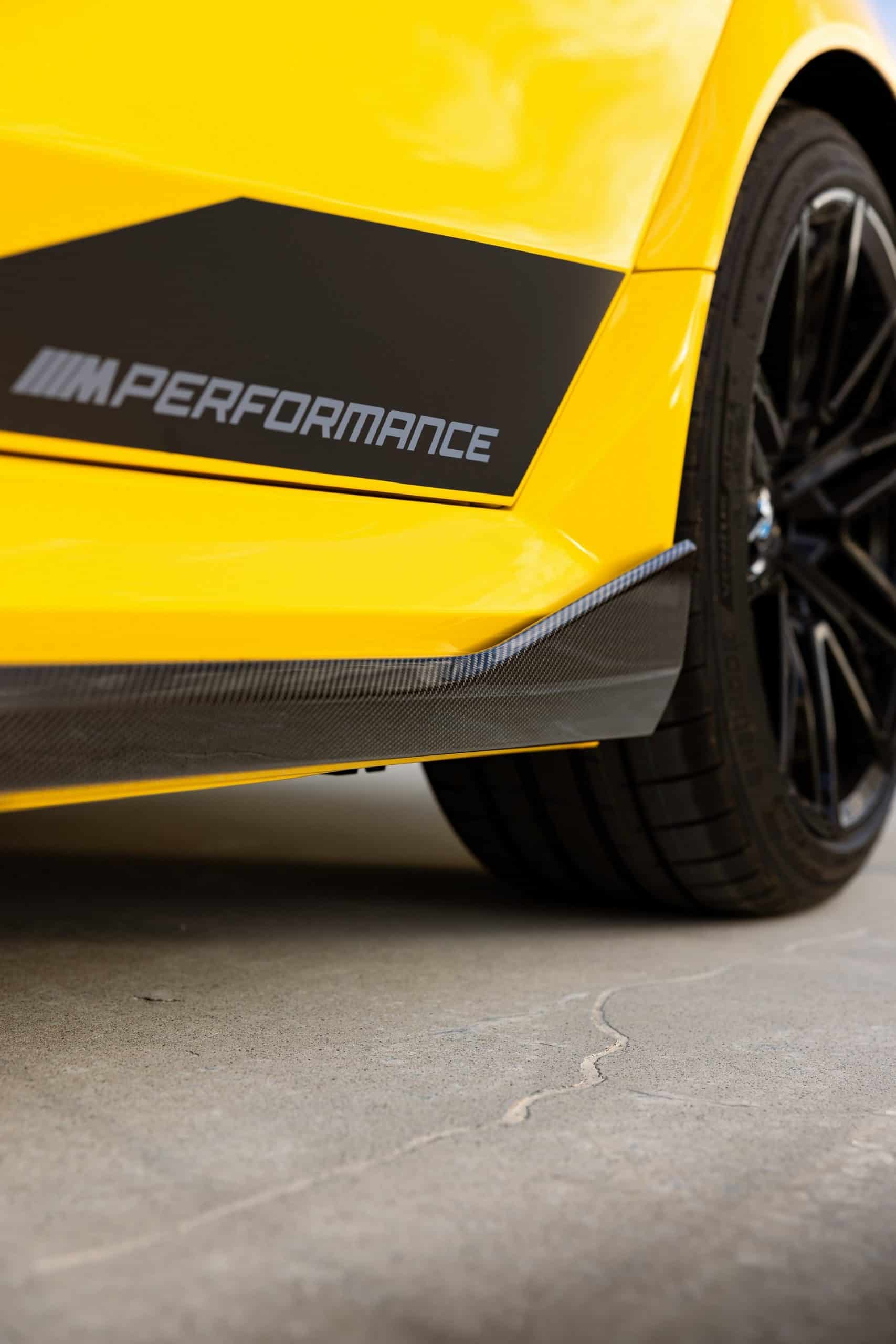 Painted in Individual Speed Yellow, the 2025 M5 gets the full suite of carbon fiber exterior parts. Echoing the rear diffuser, the new splitter has a split design we’re gradually learning to like. BMW claims these items are more than just for show. We’re being promised there are actual aerodynamic improvements compared to a stock G90. The same lightweight material has been used for the sill extensions, creating a muscular profile.