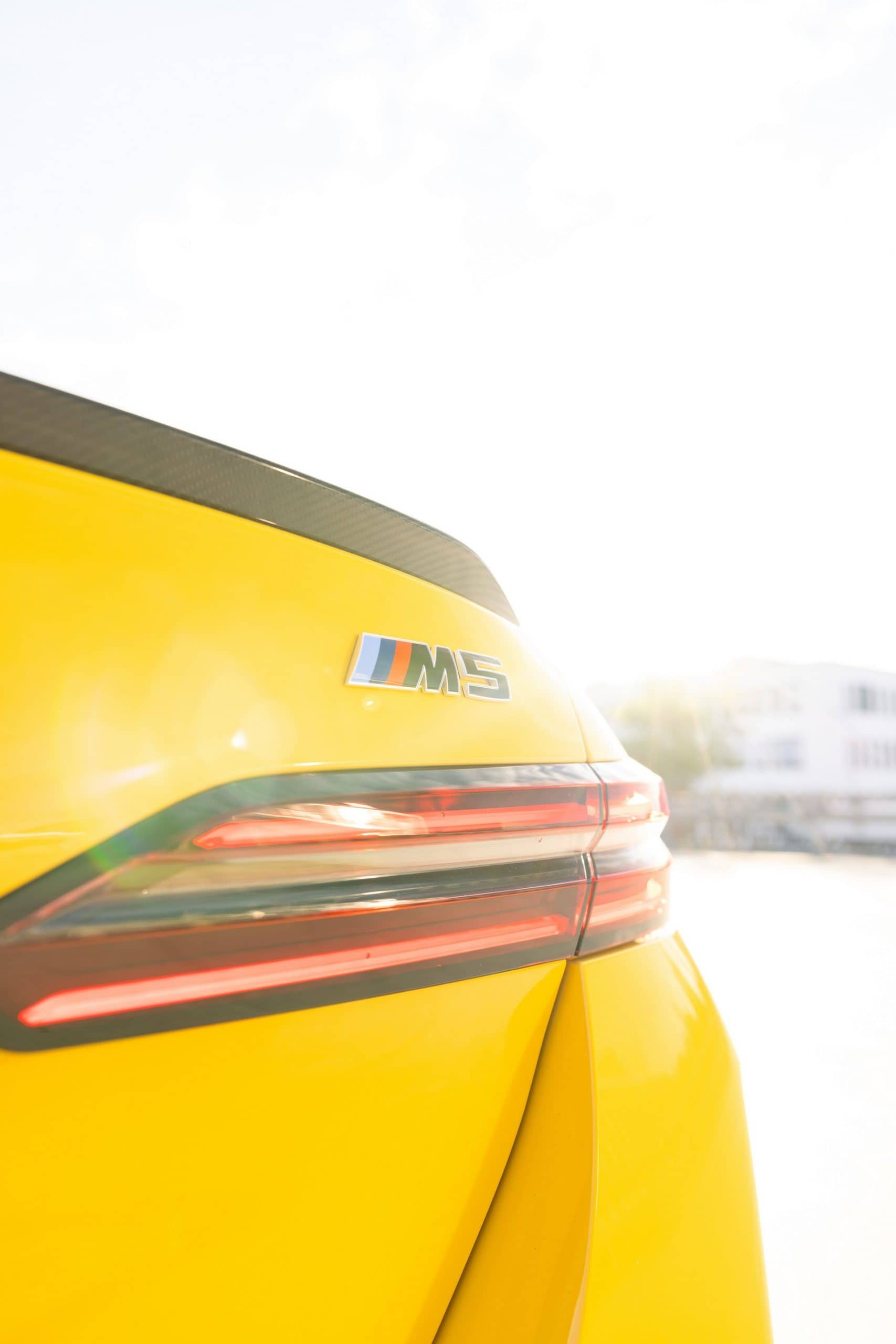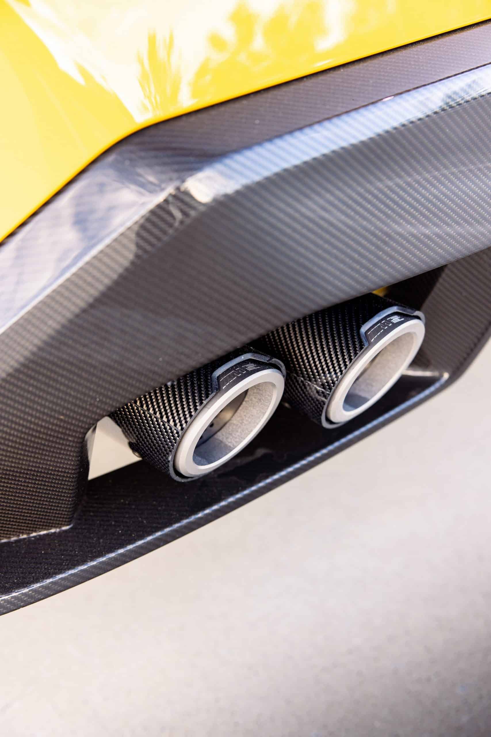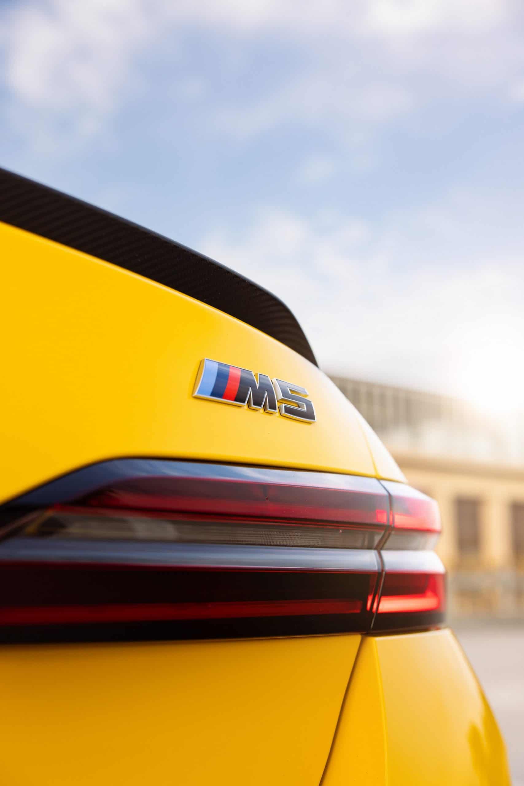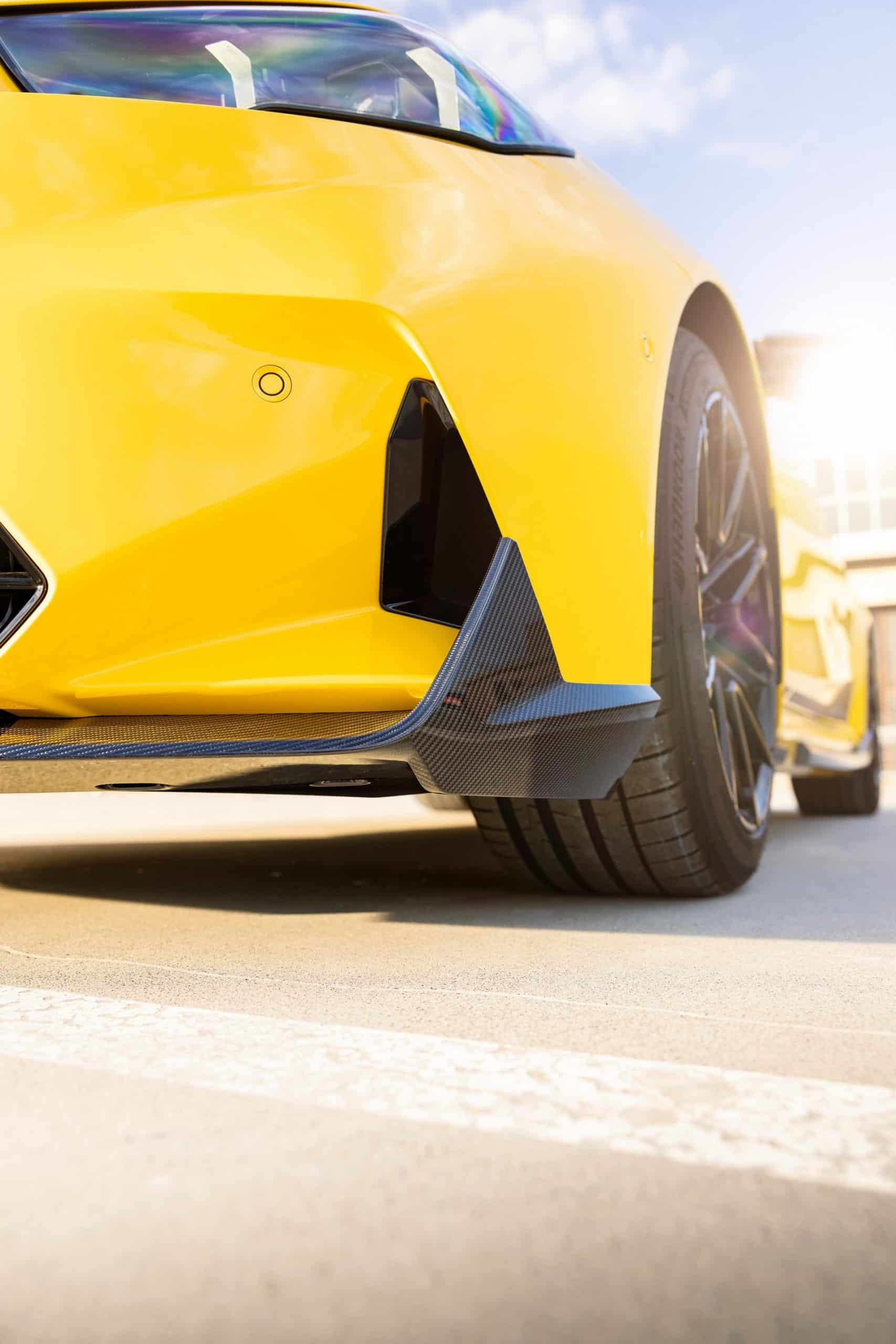 Painted in Individual Speed Yellow, the 2025 M5 gets the full suite of carbon fiber exterior parts. Echoing the rear diffuser, the new splitter has a split design we’re gradually learning to like. BMW claims these items are more than just for show. We’re being promised there are actual aerodynamic improvements compared to a stock G90. The same lightweight material has been used for the sill extensions, creating a muscular profile.