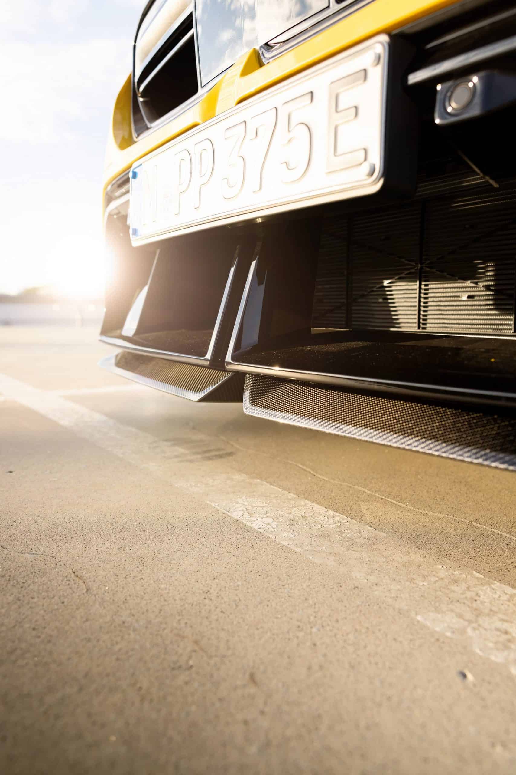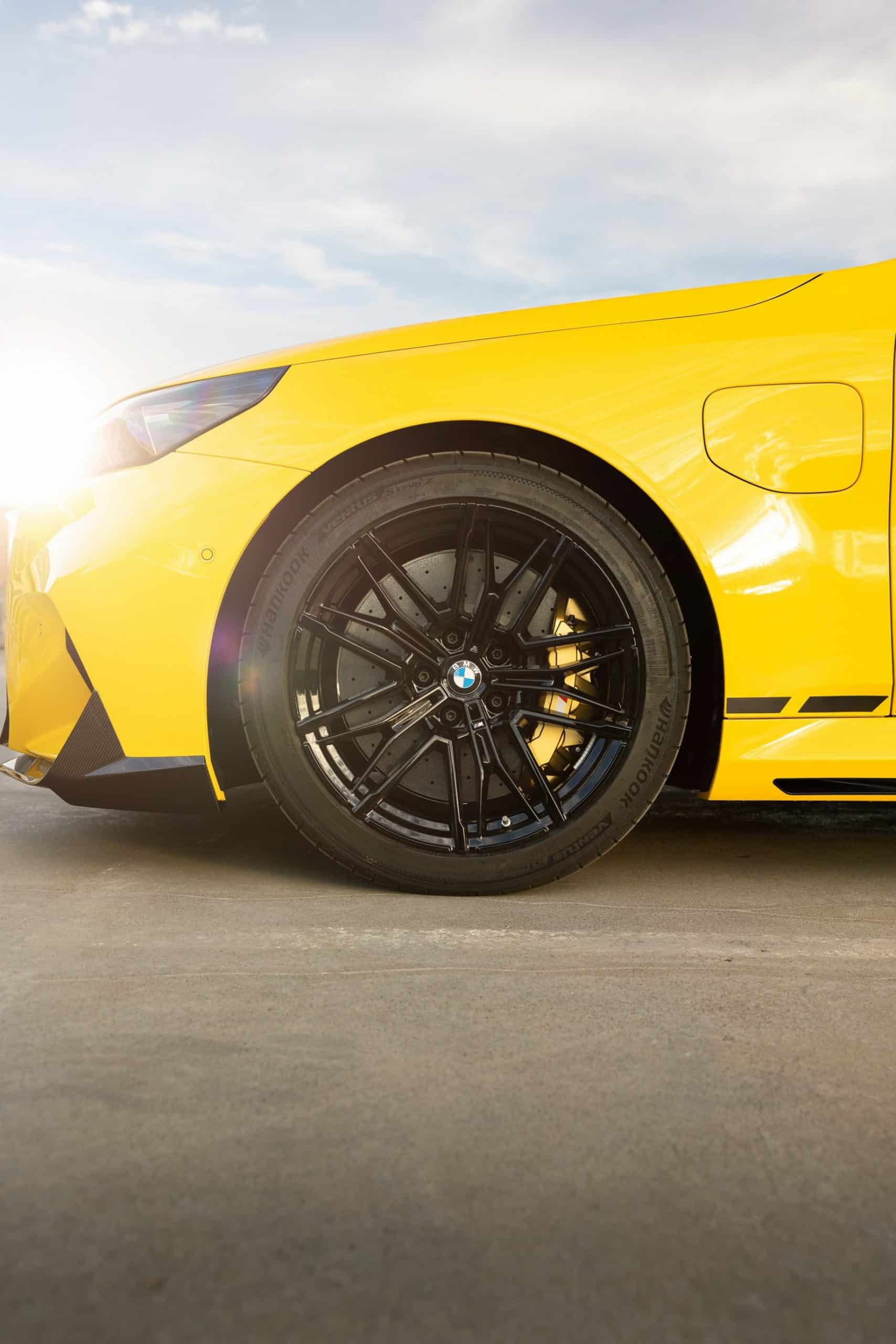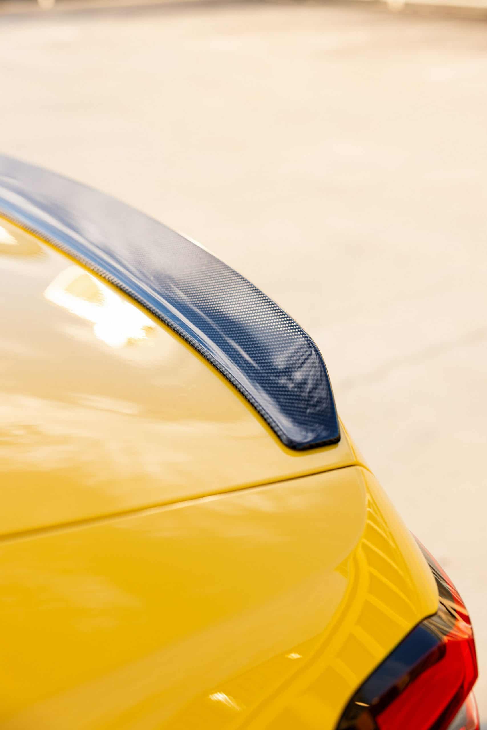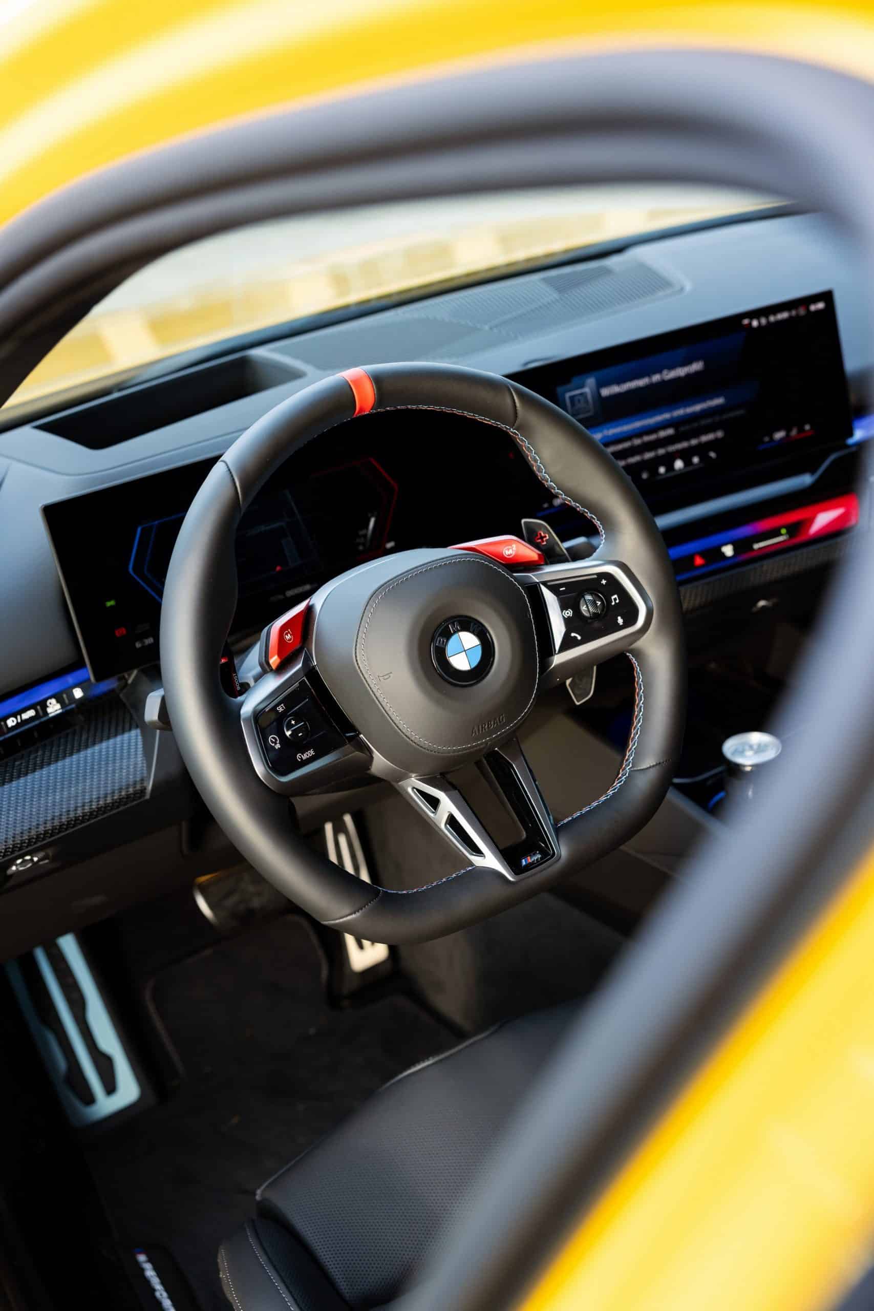 Painted in Individual Speed Yellow, the 2025 M5 gets the full suite of carbon fiber exterior parts. Echoing the rear diffuser, the new splitter has a split design we’re gradually learning to like. BMW claims these items are more than just for show. We’re being promised there are actual aerodynamic improvements compared to a stock G90. The same lightweight material has been used for the sill extensions, creating a muscular profile.