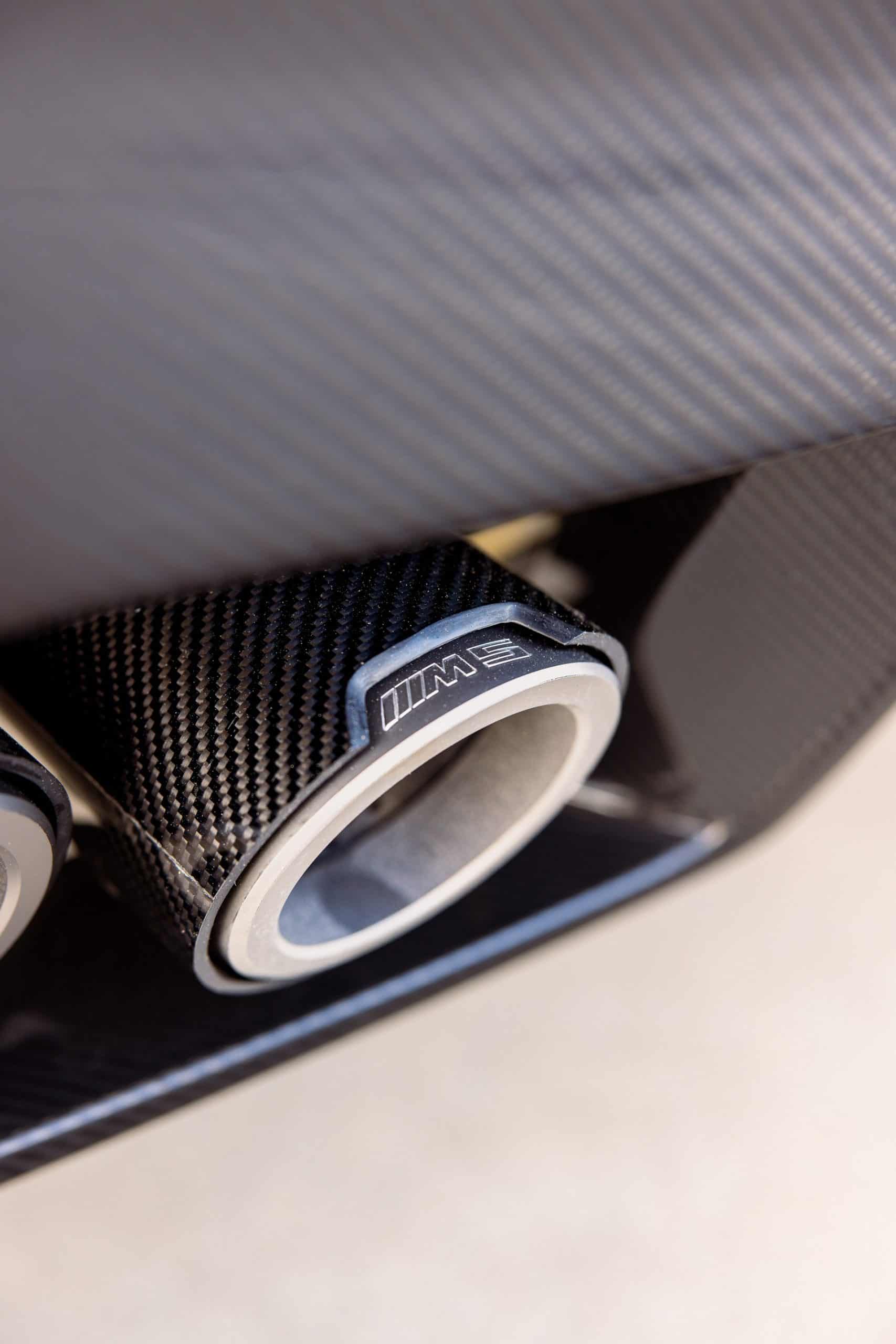 There’s more carbon fiber at the back where the quad tips of the exhaust system use a combination of carbon and titanium. The four finishers have embossed M5 logos and titanium end rings. Elsewhere, the black side decals have a Frozen look, which is marketing jargon for a matte finish. BMW claims the graphics are sturdy enough to withstand the abuse of a commercial carwash.