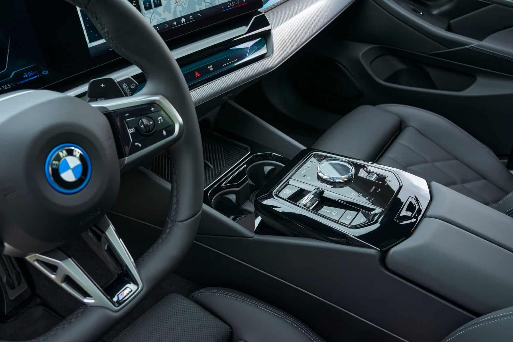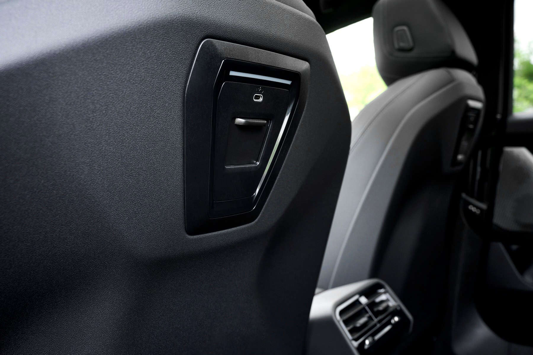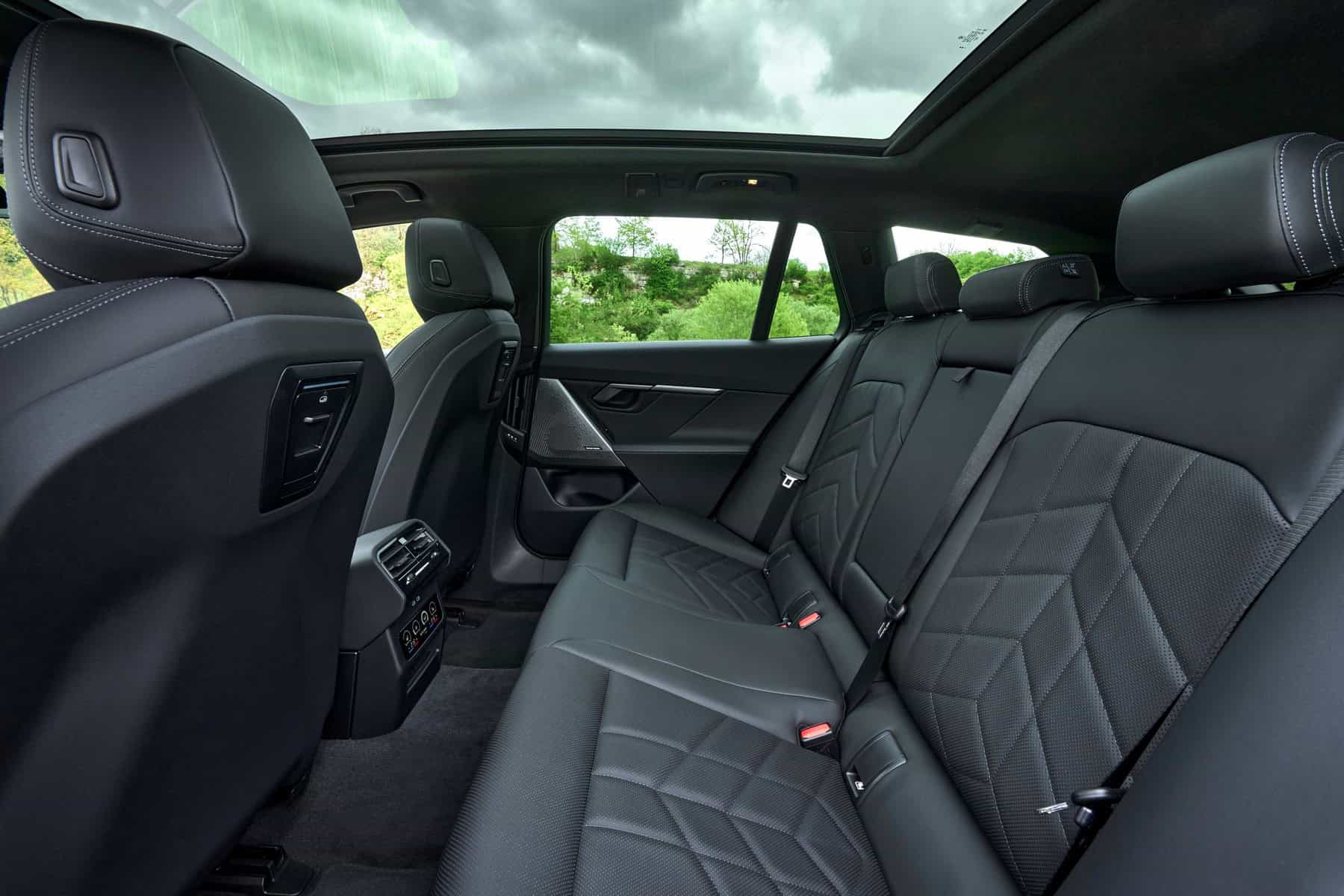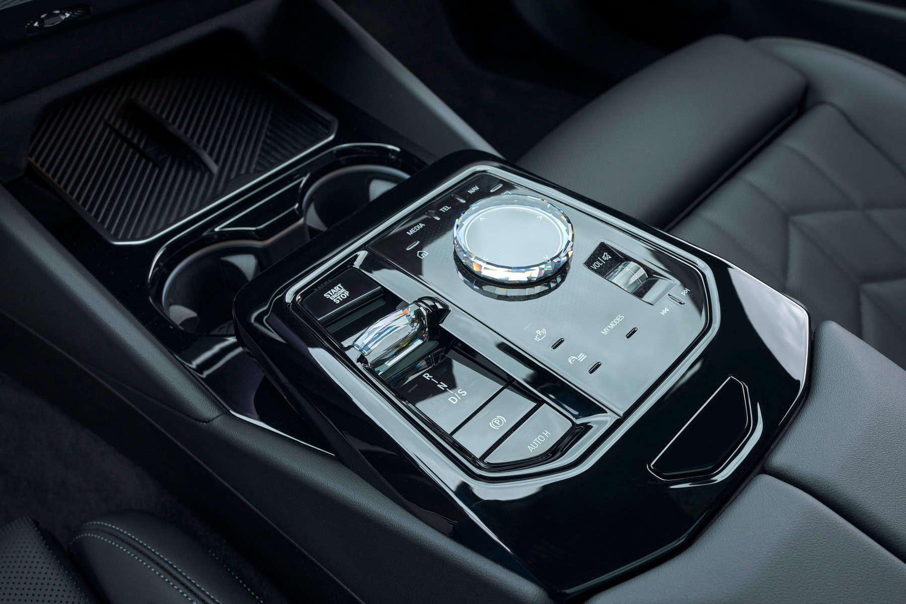 Fitted with the optional M Sport Package, this electrified Touring rides on the optional 20-inch wheels (Style 939 M) with a two-tone look. The luxury wagon wears a Mineral White metallic paint and makes the most of its long roof thanks to the panoramic glass. Inside, the seats come wrapped in perforated Veganza, a marketing jargon for vegan leather. Those fancy crystal glass applications for the iDrive controller, gear selector, and the volume knob will set you back extra.