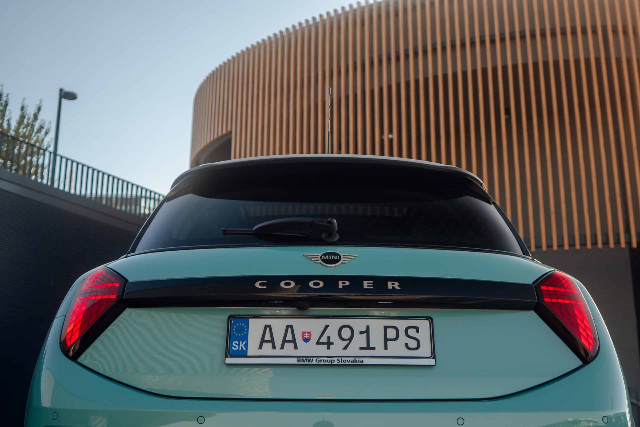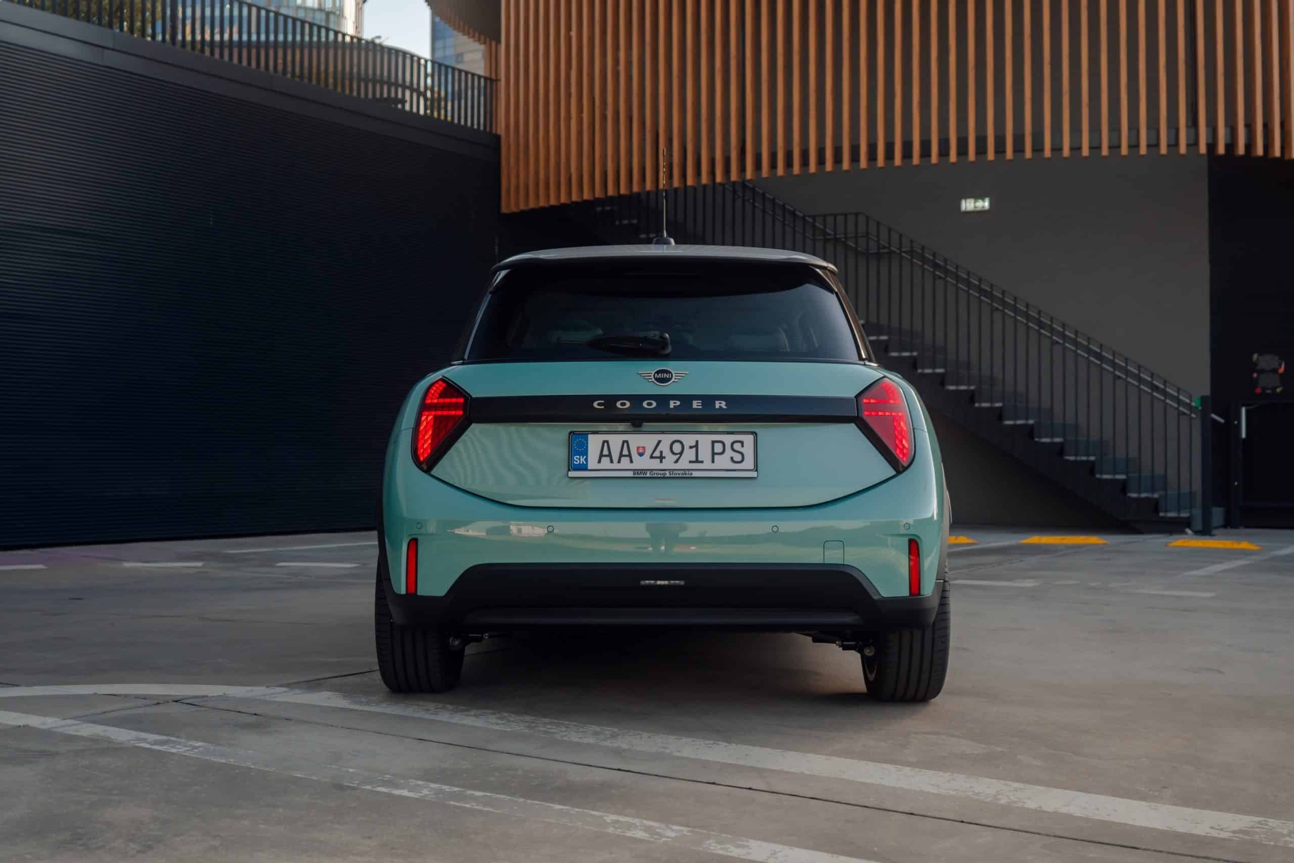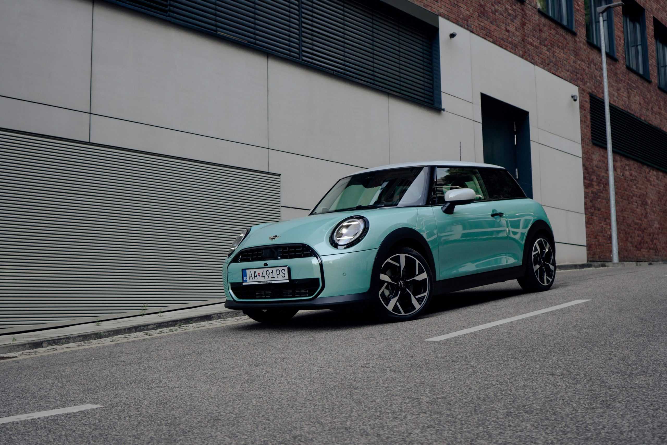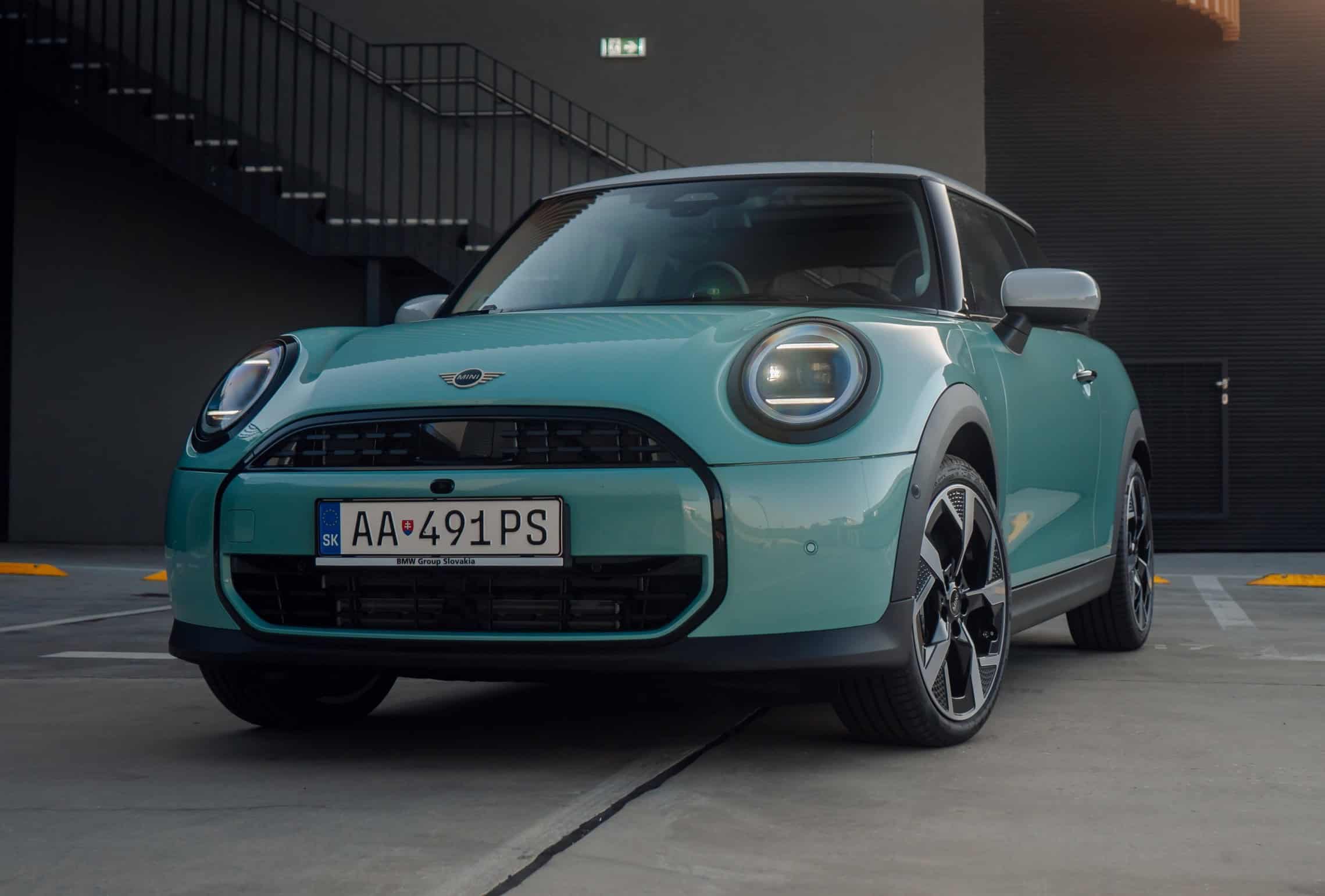 MINI is showing off the back-to-basics car from Slovakia’s capital Bratislava where the Cooper C was recently photographed. Granted, this isn’t a completely standard configuration of the “F66.” It’s a higher-end Classic Trim with the optional Ocean Wave Green paint job. It also eschews the standard 16-inch wheels in favor of a larger 18-inch set with a two-tone finish.