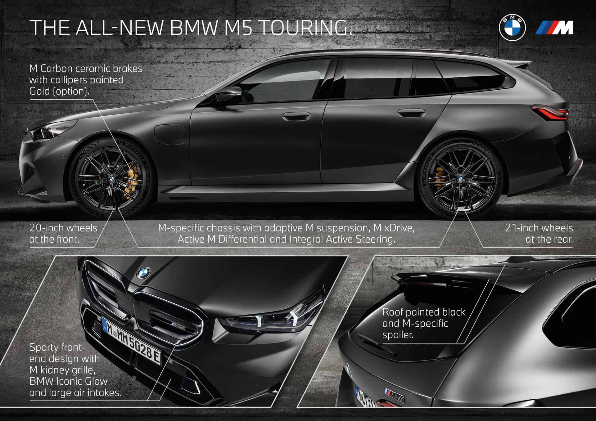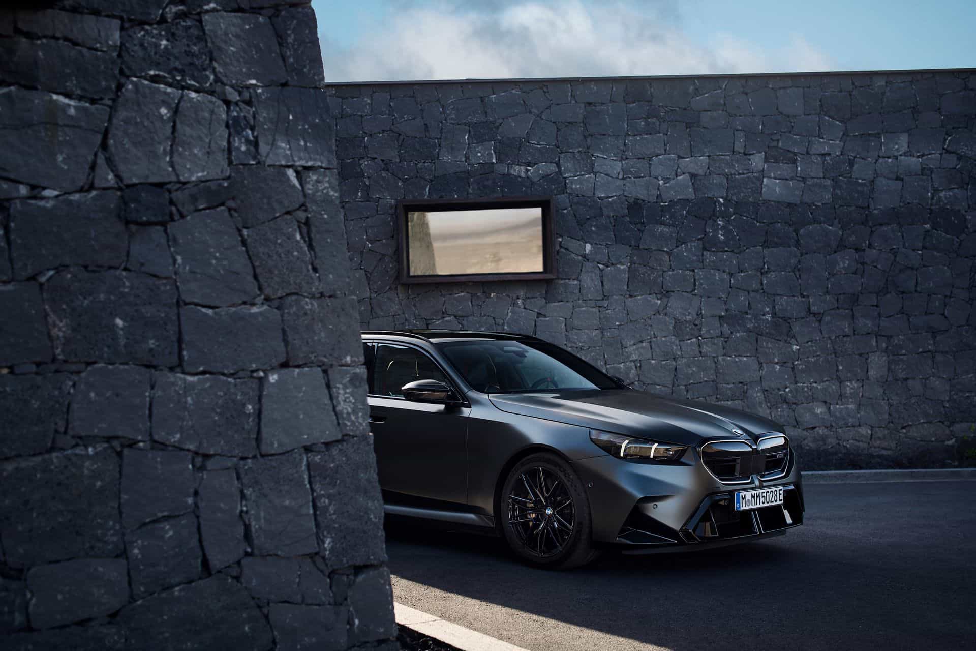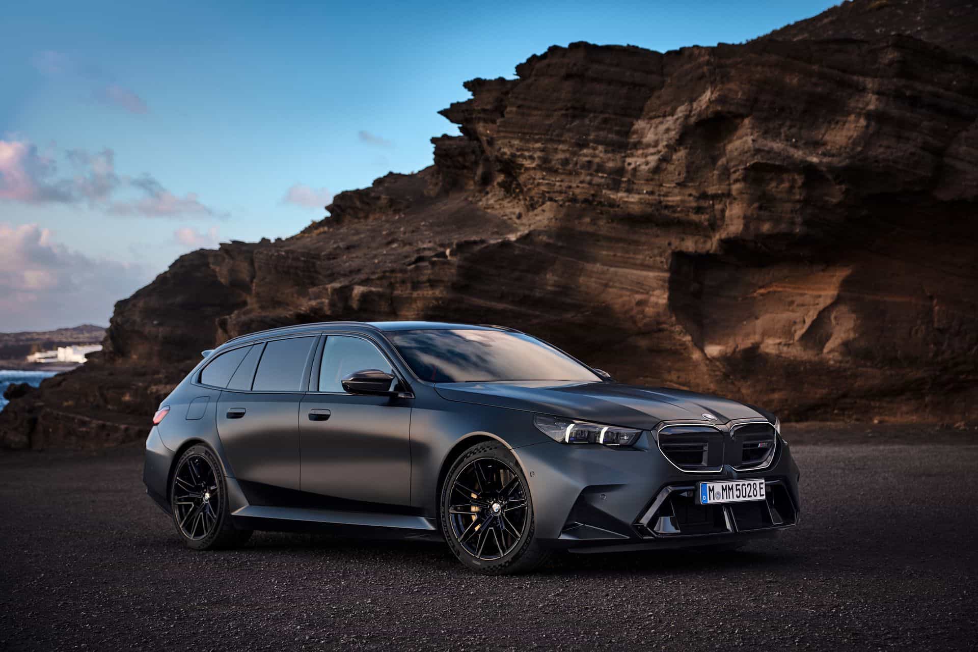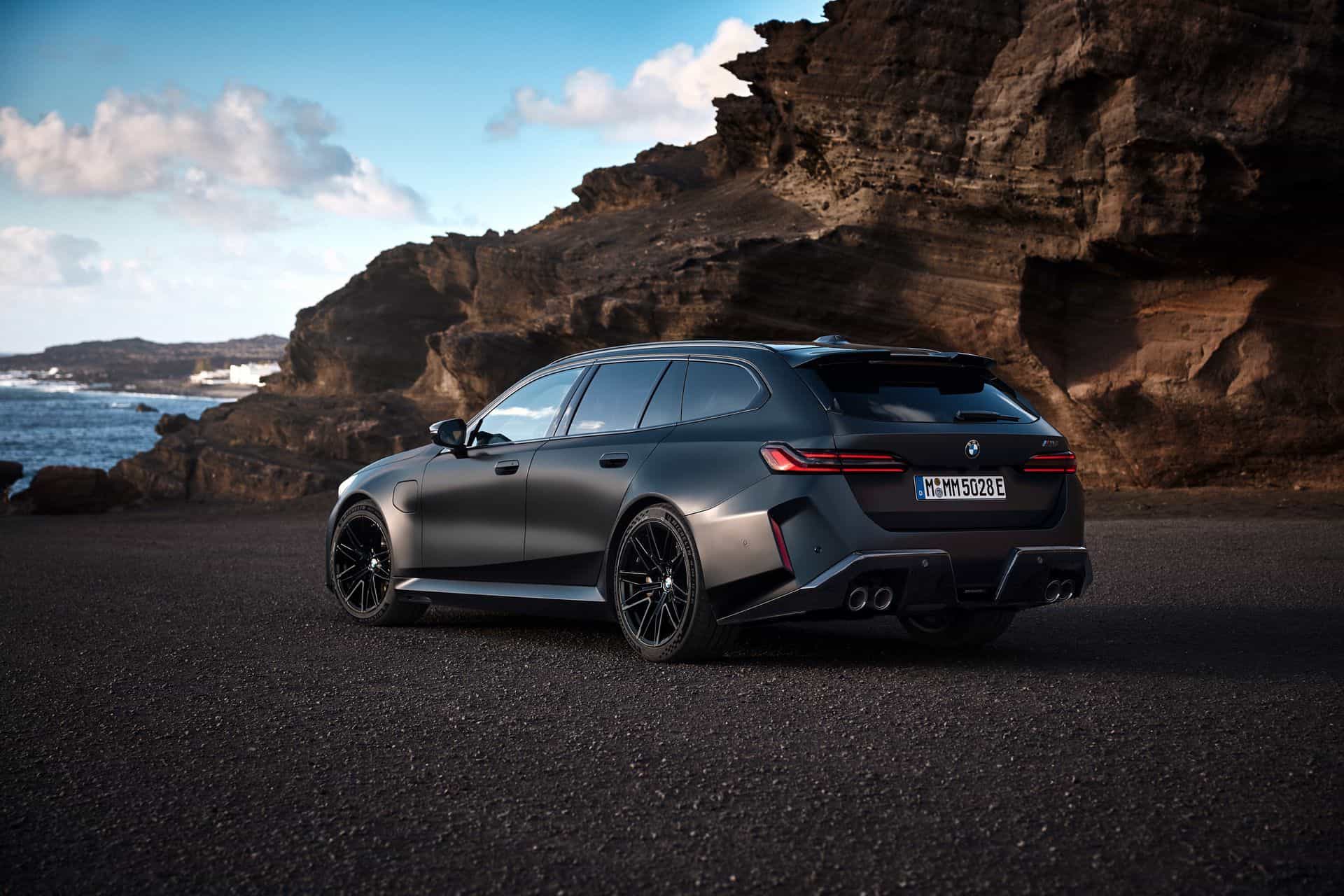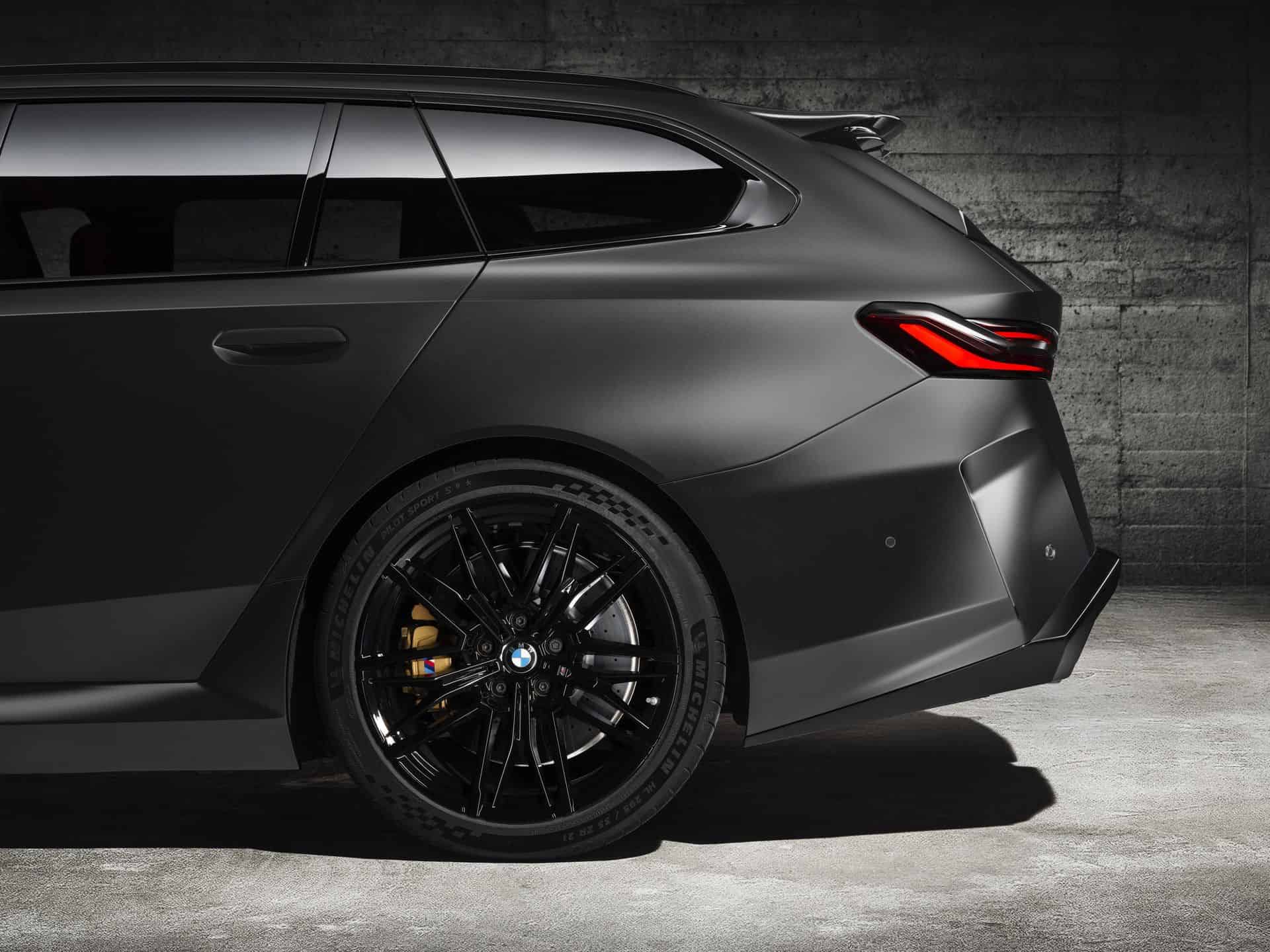 Let’s talk about customization options. BMW offers 10 body colors, but that number grows to 150 if we include Individual paints. Striking finishes such as Isle of Man Green, Marina Bay Blue, Frozen Deep Grey, and Storm Bay are confirmed. As for wheels, the Style 951M 20-inch front and 21-inch rear alloys have either a two-tone finish or an optional all-black look. The wheels come wrapped in 285/40 ZR20 front and 295/35 ZR21 rear high-performance tires. The M5 Touring also gets an optional wheel set that eschews traditional spokes in favor of a 3D-like effect.
