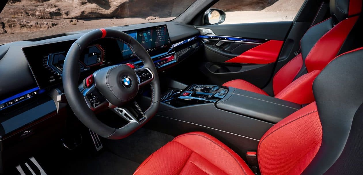 That flat-bottomed steering wheel of the new M5 Touring should look familiar by now, including its red 12 o’clock position. It can be optionally heated and comes bundled with gearshift paddles featuring a high-gloss black finish. The paddles come with red contours for the “+” and “-“ symbols. The iDrive 8.5 is standard, and so is the 18-speaker Bowers & Wilkins surround sound system.