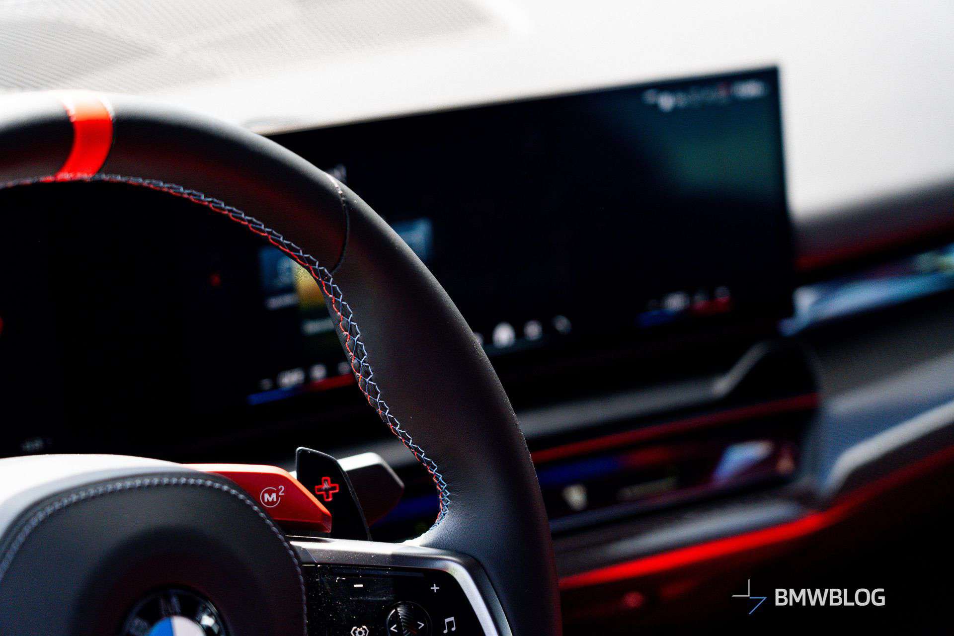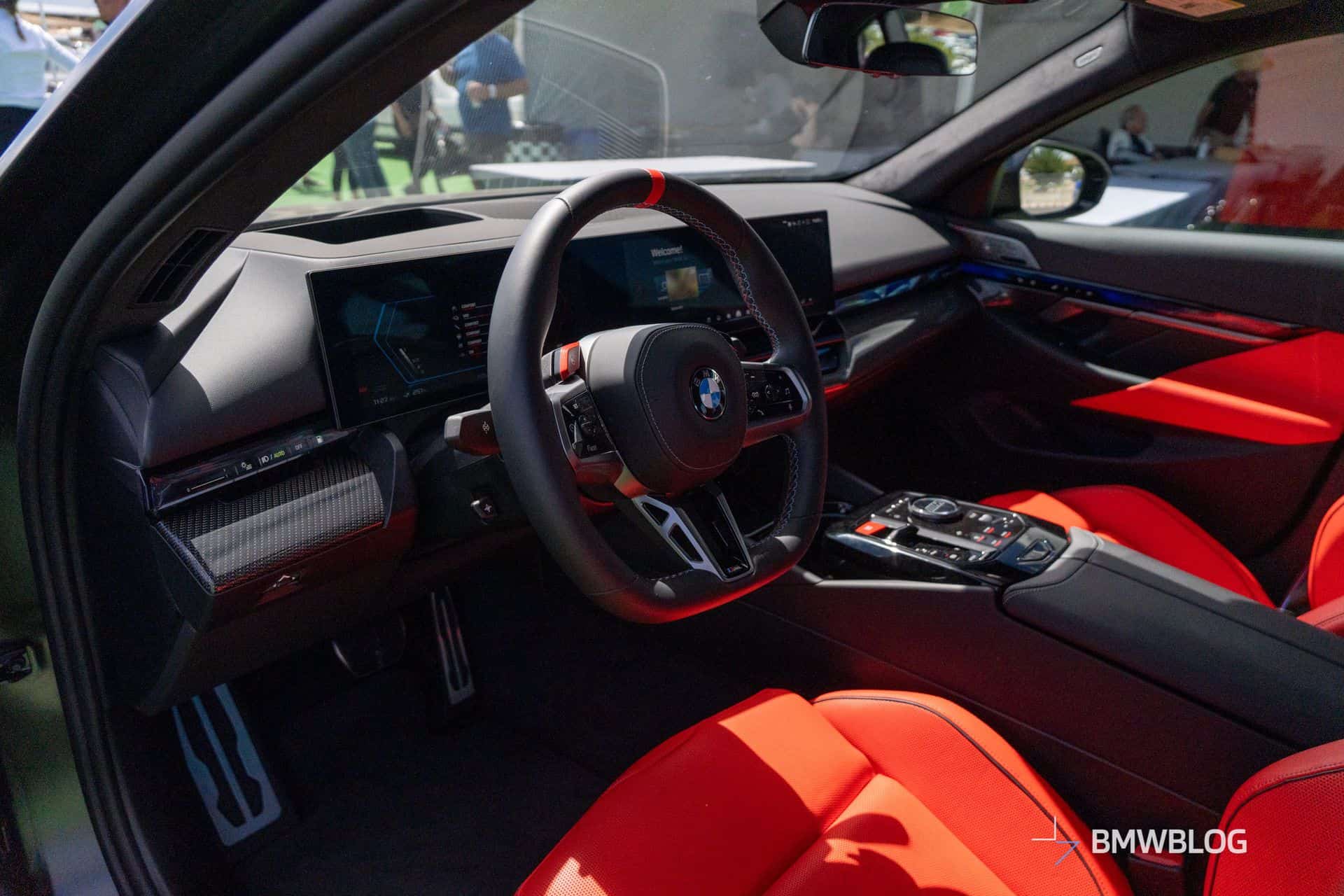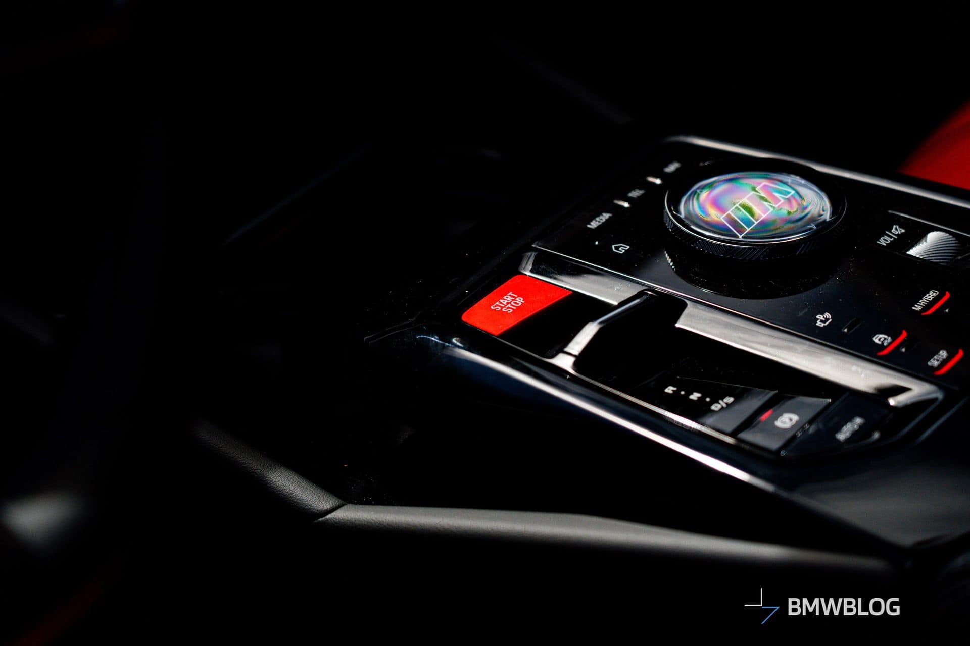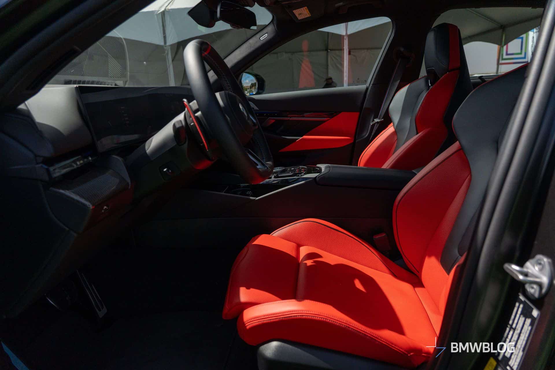 A glimpse inside reveals standard Kyalami Orange and Black Merino leather upholstery. We can also see the glass controls and Interaction Bar that very likely come standard, as they do on the Sedan. Carbon Fiber trim – a $500 option on the sedan models – stands out as being of few options on the Touring.