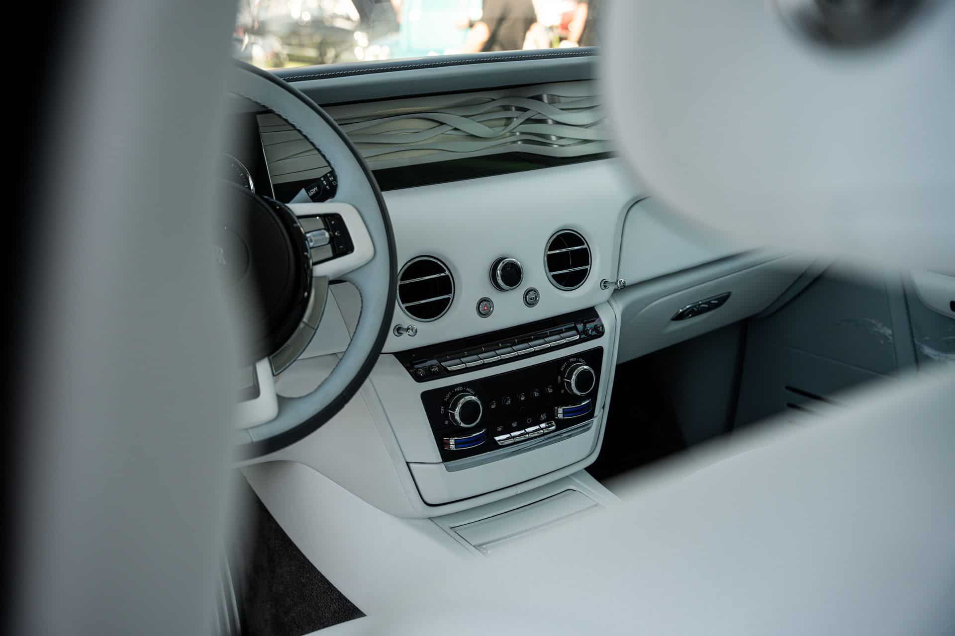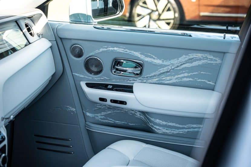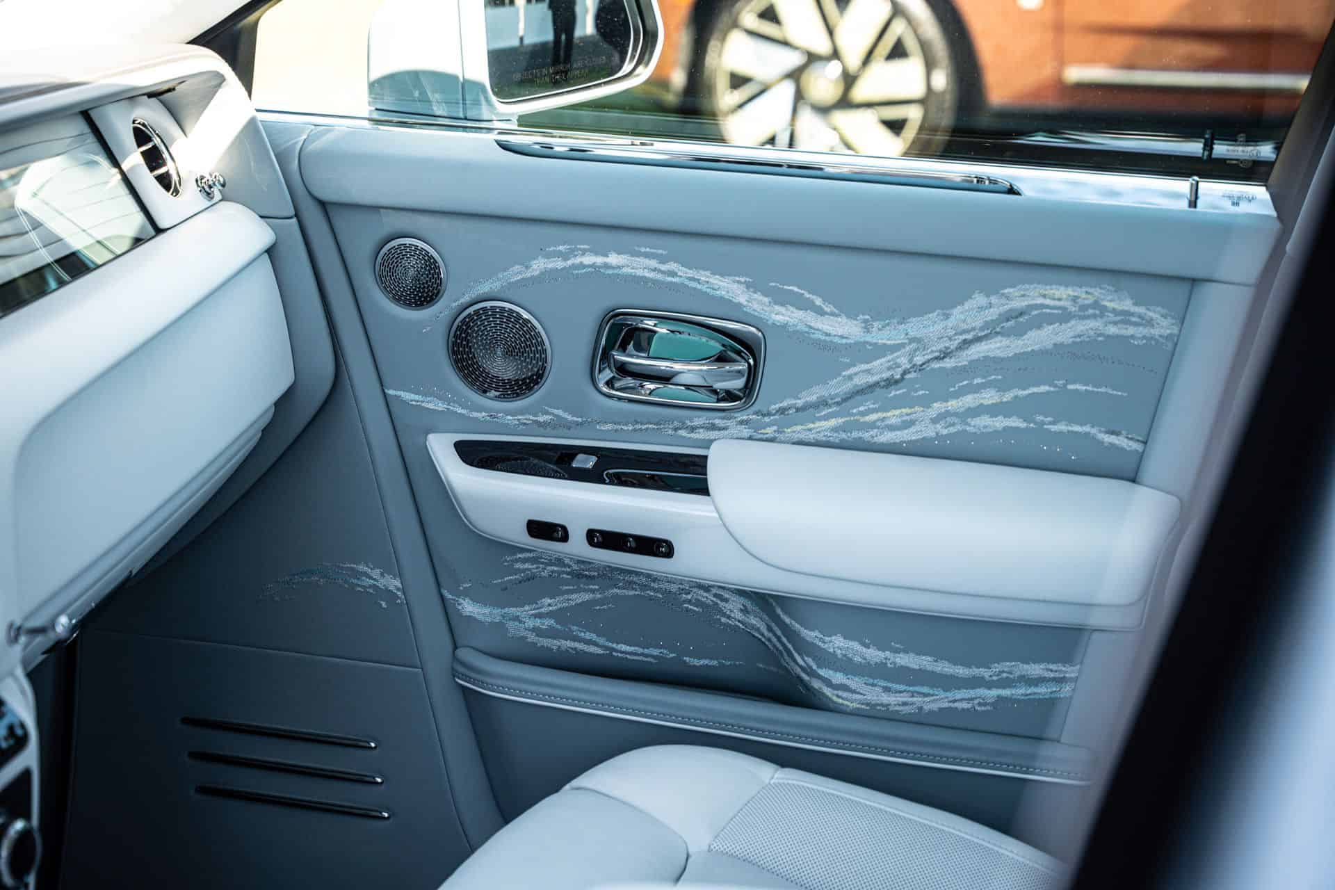 Inside, the Scintilla is a masterpiece of embroidery and artistic expression. Rolls-Royce describes the interior as “painting with thread,” with over 633,000 stitches creating intricate patterns on the doors and seats. This embroidery uses a blend of colors, including blue-grey and pastel yellow, with illuminated perforations that sparkle by night, enhancing the sense of motion and fluidity throughout the cabin. The centerpiece of the interior is a bespoke artwork, “Celestial Pulse,” crafted from solid aluminum ribbons, polished to reflect light and mimic the movement of the Spirit of Ecstasy.