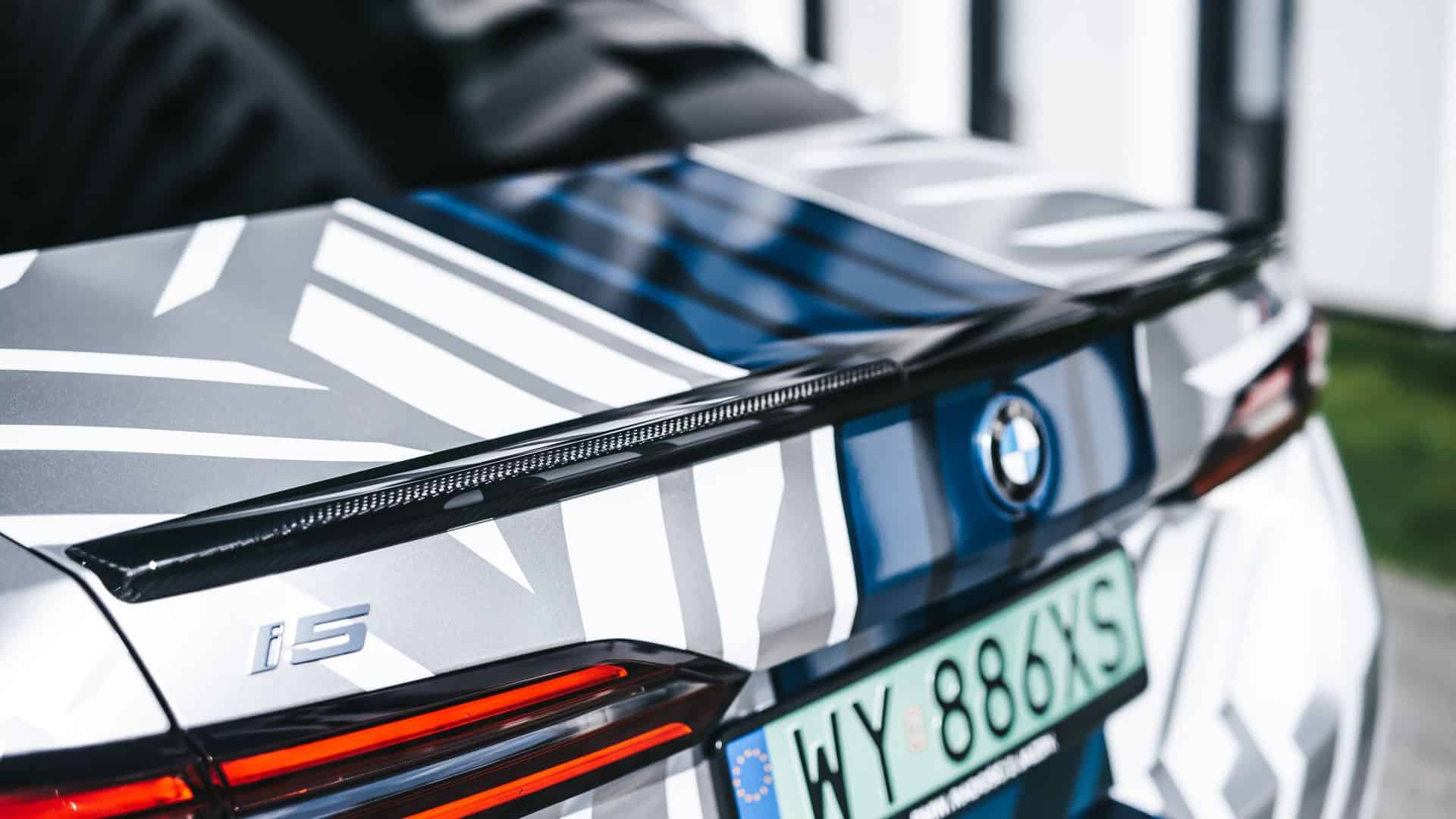 From the split spoiler lip at the front to the diffuser at the back, this electric 5er has it all. Those side sill extensions are also of the carbon fiber variety, which is the same we can say about the mirror caps. BMW also sells the large luxury sedan with an antenna that uses aramid. It’s a composite material that looks like carbon fiber. On the more practical Touring model, the rear spoiler boasts a carbon fiber fin.