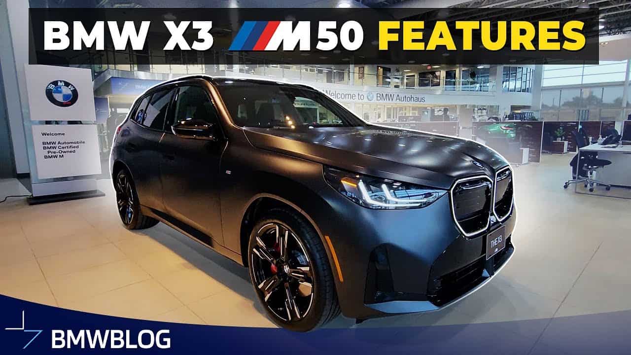 There’s a logical explanation as to why an image of the X1 appears on the infotainment screen later in the video. This X3 M50 is a pre-production car, but it’s 99% indicative of what customers will get when deliveries start in the fourth quarter of the year. Speaking of the cabin, this is the only BMW in the vast lineup to combine iDrive 9 with the traditional rotary dial.