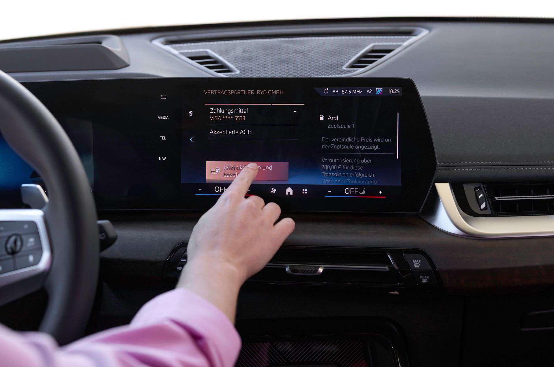 Once at a participating station, drivers are prompted to complete the payment process on the central display screen. The system guides them through selecting the pump and confirming the transaction, after which they receive notifications both on-screen and via the My BMW App, ensuring a smooth refueling process. Past transactions can be reviewed at any time, offering users comprehensive management of their fuel expenditures.