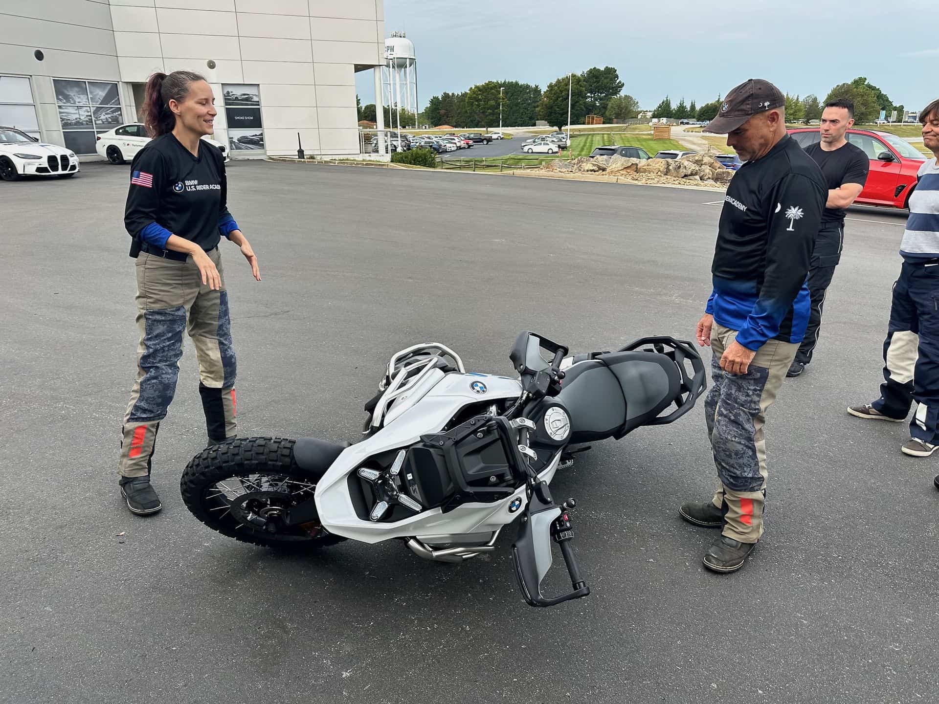 Out on the paddock, we learned the various ways to mount the motorcycle, proper use of the center stand (a technique which I’ll admit had previously eluded me), and the three primary methods to “recover” a dropped bike. Instructors Wendy and Terry took a 1300GS off its center stand and laid it down on the pavement, then demonstrated various methods to upright the bike. It’s a foundational skill in the world of off-road riding, as we all would learn.