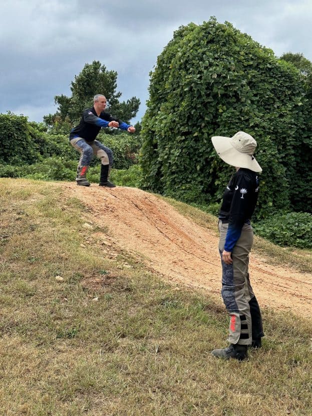 Both mornings, we began with “Bike Yoga” to loosen us up and build some quick confidence. We rode gentle follow-the-leader loops, balancing on one peg while sitting side-saddle on the bike, progressing into more awkward positions. If you do actual yoga, imagine doing a “resting pigeon” pose balanced on a foot peg while controlling the motorcycle’s speed with only the clutch lever and you’ll have a reasonable idea. It’s challenging, fun, and one of the first “circus tricks” we learned, and a great exercise to get a feel for slow-speed body and bike balance.