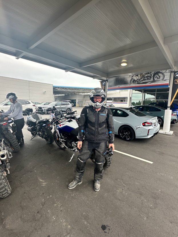 Inside the facility, lucky owners arrived to take delivery of new BMWs with all the excitement of Christmas morning, while outside, M-cars did power slides and donuts on the wet skid pad, engines wailing, and on the test track, all manner of BMWs turned hot laps, tires shrieking. Meanwhile, our class of student off-road riders ventured into the forest for instruction and to explore obstacle circuits, winding forest trails, gravel, and sand pits to learn and test our mettle.