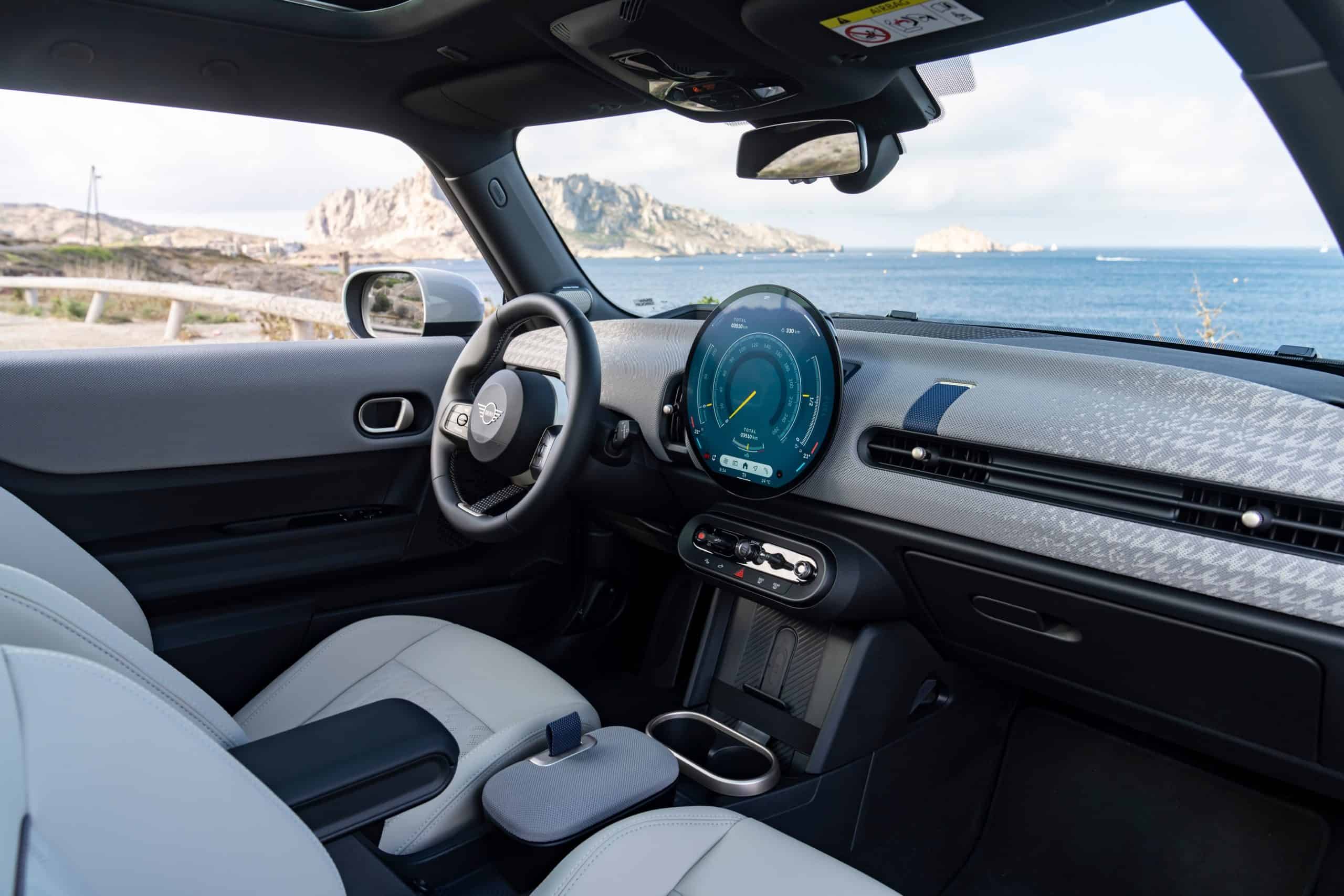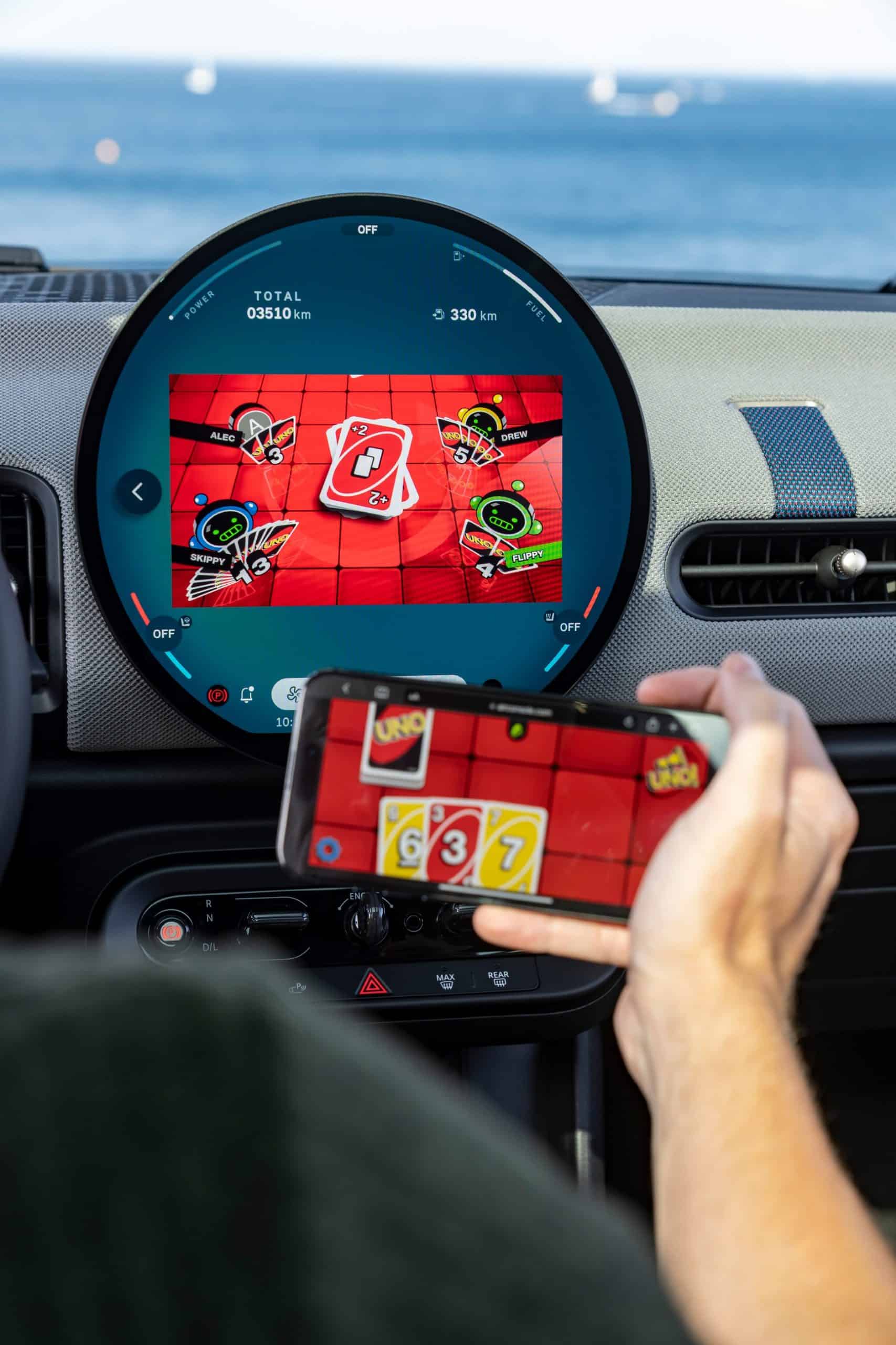 Although beige is not particularly an exciting color, this Vescin Beige shade used by MINI for the interior isn’t half bad. If you’re unfamiliar with the marketing jargon, “Vescin” is synthetic leather, so kind of like BMW’s Veganza. To spruce things up, the dashboard is covered in a two-tone textile. With the latest official images, we’re being reminded you can now play games such as Uno but only when the car is in park.